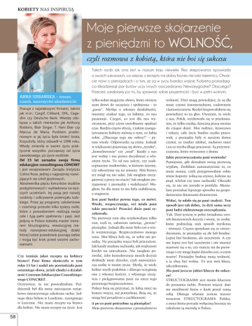 KOBIETY NAS INSPIRUJĄ Moje pierwsze skojarzenie z pieniędzmi to WOLNOŚĆ, czyli rozmowa z kobietą, która nie boi się sukcesu Takich osób jak ona jest w naszym kraju niewiele. Bez skrępowania opowiada o swoich sukcesach, co więcej, z recepty na dobry biznes nie robi tajemnicy. Otwarcie mówi o pieniądzach i o tym, że są w życiu bardzo ważne. Kobieta posiadająca kilkadziesiąt par butów uczy innych oszczędzania. Niewiarygodne? Dlaczego? Przecież zarabiamy po to, by sprawiać sobie przyjemność i być w pełni wolnymi. Anna Urbańska – trener, coach, nauczyciel akademicki Pracuje z największymi firmami, takimi jak m.in.: Cargill, Citibank, DHL, Cegedim czy Deutsche Bank. Wiedzę zdobywa u takich mentorów jak Anthony Robbins, Blair Singer, T. Harv Eker czy Marcus de Maria. Punktem przełomowym w jej życiu była śmierć brata, Krzysztofa, który odszedł w 1998 roku. Wtedy zmieniła w swoim życiu praktycznie wszystko, począwszy od życia zawodowego, po życie osobiste. Od 15 lat zarządza swoją firmą edukacyjno-consultingową CONCRET i jest wiceprezesem Zarządu Instytutu Colina Rose, jednej z najprężniej rozwijających się szkół językowych. Absolwentka pięciu kierunków studiów podyplomowych i wykładowca na wyższych uczelniach. Jej pasją jest rozwój osobisty i odkrywanie potencjału ludzkiego. Przez jej programy szkoleniowe i coachingi przeszło kilka tysięcy osób, które z powodzeniem realizują swoje cele i żyją pełni spełnienia i pasji. Jest jedyną w Polsce kobietą master trenerem Structogramu, rewolucyjnej metody rozwojowo-edukacyjnej, dzięki której ludzie prawdziwie poznają siebie i mogą być krok przed swoimi zachowaniami. Czy istnieje jakaś recepta na kobiecy biznes? Pani firma skończyła w tym roku 15 lat i nadal nie powiedziała pani ostatniego słowa, jeżeli chodzi o działalność Centrum Edukacyjno Consultingowego CONCRET. Oczywiście, że nie powiedziałam. Październik był dla mnie miesiącem wyjątkowo intensywnego szkolenia siebie. Jednego dnia byłam w Londynie, następnego w Lucernie. Nie mam recepty na biznes dla kobiet. Nie mam recepty na życie. Jest 58 tylko jedno magiczne słowo, które otwiera nam drzwi do szczęścia i spełnienia – to „pasja”. Myśląc o własnej działalności, musimy szukać tego, co lubimy, co nas pasjonuje. Czegoś, co jest dla nas wyzwaniem, przy czym uwielbiamy spędzać czas. Bardzo często słyszę, z jakim zaangażowaniem kobiety mówią o tym, co lubią robić. „Dlaczego tego nie robisz?” – pytam wtedy. Odpowiedzi są różne. Jednak w większości pojawiają się słowa „ryzyko”, „konsekwencje” czy „trud”. Każdy z nas jest wolny i ma prawo decydować o własnym życiu. To od nas zależy, czy zaakceptujemy środowisko, w którym żyjemy, czy odważymy się na zmiany. Mój biznes też mógł się nie udać. Jak mogłam zrezygnować z pracy na etacie? Jak mogłam zrezygnować z pieniędzy i stabilizacji? Mogłam, bo dla mnie to nie była stabilizacja, a stagnacja. wolność. Dziś mogę powiedzieć, że są dla mnie czymś fenomenalnym, cudownym i fantastycznym. Kiedyś krępowałabym się powiedzieć to na głos. Uważam, że wiele z nas, Polek, wychowało się w przekonaniu, że tylko ciężką, fizyczną pracą można do czegoś dojść. Moi rodzice, krawcowa i tokarz, całe życie bardzo ciężko pracowali, a pieniądze były w naszym domu czymś, co trudno zdobyć, niełatwo mieć i na co trzeba długo pracować. Są przyzwyczajenia, które wynosimy z domu. Jest pani bardzo pewna tego, co mówi. Wtedy, rozpoczynając, też miała pani takie poczucie? Przecież dużo pani ryzykowała. Na pierwszy rzut oka ryzykowałam tylko etat, czyli te, zabawnie mówiąc, „pewne” pieniądze. Jednak dla mnie było coś o wiele ważniejszego. Bezpieczeństwo mojego syna. Moi bliscy bali się, że sobie nie poradzę. Na początku wręcz byli przerażeni. Jak każdy miałam rachunki, jak większość kredyt na mieszkanie. Nie mogłam pozwolić, żeby konsekwencje moich decyzji dotknęły moje dziecko, czyli najważniejszą osobę w moim życiu. Myślę, że wiele kobiet myśli podobnie i dlatego rezygnują one z własnej kariery, z własnego szczęścia i pielęgnowania pasji na rzecz tego pozornego bezpieczeństwa. Polacy boją się przyznać, że lubią mieć na koncie więcej, niż potrzebują. Boją się, że mogą być posądzeni o zachłanność. Widać, że udało się go pani znaleźć. Ten sposób jest tak dobry, że dziś sama uczy pani ludzi efektywnego oszczędzania. Tak. Dziś jestem w pełni świadoma swoich finansowych decyzji i wiem, że osoby, które podzielają mój sposób myślenia – również. Często spotykam się ze stwierdzeniami, że pieniądze są złe lub brudne. Lepiej być biednym, ale uczciwym. A czy nie lepiej jest być uczciwym i nie musieć martwić się o to, czy starczy mi do pierwszego i czy mogę kupić dziecku coś, o czym marzy? Pieniądze budują moją wolność, a ja chcę być wolna. To jest mój klucz, zdecydowanie. Ma pani jeszcze jakieś klucze do sukcesu? STRUCTOGRAM® jest moim kluczem do poznania siebie. Powiem więcej: daje mi możliwość bycia o krok przed samą sobą. Dlatego właśnie jestem master trenerem STRUCTOGRAM® Polska, a moja firma posiada wyłączną licencję na szkolenie tą metodą w Polsce. A po co pani potrzebne są pieniądze? Moje pierwsze skojarzenie z pieniędzmi to Jakie przyzwyczajenia pani wyniosła? Pamiętam, gdy dostałam swoją pierwszą wypłatę. Zrobiłam automatycznie to, co moja mama, czyli przygotowałam sobie różne koperty: jedną na czynsz, kolejne na prąd, telefon czy inne rachunki. Okazało się, że nic nie zostało w portfelu. Musiałam poszukać lepszego sposobu na gospodarowanie finansami domowymi.