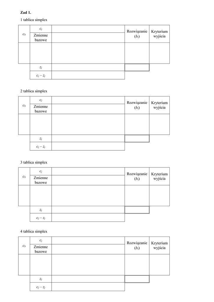 Zad 1. 1 tablica simplex cb cj Rozwiązanie (bi) Kryterium wyjścia