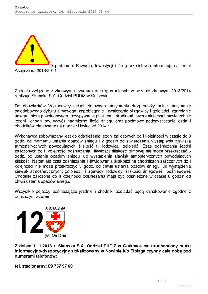 Miasto Utworzono: czwartek, 14, listopada 2013 08:44 Departament Rozwoju, Inwestycji i Dróg przedstawia informacje na temat Akcja Zima 2013/2014. Zadania związane z zimowym utrzymaniem dróg w mieście w sezonie zimowym 2013/2014 realizuje Skanska S.A. Oddział PUDiZ w Gutkowie. Do obowiązków Wykonawcy usługi zimowego utrzymania dróg należy m.in.: utrzymanie całodobowego dyżuru zimowego, zapobieganie i zwalczanie ślizgawicy i gołoledzi, zgarnianie śniegu i błota pośniegowego, posypywanie piaskiem i środkami uszorstniającymi nawierzchnię jezdni i chodników, wywóz nadmiernej ilości śniegu oraz pozimowe podczyszczanie jezdni i chodników planowane na marzec i kwiecień 2014 r. Wykonawca zobowiązany jest do odśnieżenia jezdni zaliczonych do I kolejności w czasie do 3 godz. od momentu ustania opadów śniegu i 2 godzin od stwierdzenia wystąpienia zjawiska atmosferycznych powodujących śliskość tj. lodowica, gołoledź. Czas odśnieżania jezdni zaliczonych do II kolejności odśnieżania i likwidacji śliskości zimowej nie może przekraczać 6 godz. od ustania opadów śniegu lub wystąpienia zjawisk atmosferycznych powodujących śliskość. Natomiast czas odśnieżania i likwidowania śliskości na chodnikach zaliczonych do I kolejności nie może przekroczyć 3 godz. od chwili ustania opadów śniegu lub wystąpienia zjawisk atmosferycznych: gołoledzi, ślizgawicy, lodowicy, śliskości śniegowej i pośniegowej. Chodniki zaliczone do II kolejności odśnieżania mają być odśnieżone w czasie 6 godzin od chwili ustania opadów śniegu. Wszystkie pojazdy odśnieżające jezdnie i chodniki posiadać będą oznakowanie zgodne z poniższym wzorem: Z dniem 1.11.2013 r. Skanska S.A. Oddział PUDiZ w Gutkowie ma uruchomiony punkt informacyjno-dyspozycyjny zlokalizowany w Nowinie k/o Elbląga czynny całą dobę pod numerami telefonów: tel. stacjonarny: 89 757 97 60 1 / 2 Phoca PDF Miasto Utworzono: czwartek, 14, listopada 2013 08:44 tel. komórkowy: 797 229 315 Informujemy, że na terenie Elbląga nie tylko DRID prowadzić będzie „Akcję Zima”. Prowadzić ją również będą właściciele, użytkownicy wieczyści i zarządcy nieruchomości tj. m.in. spółdzielnie i wspólnoty mieszkaniowe. Za egzekwowanie obowiązków zimowego utrzymania przez wszystkich właścicieli nieruchomości odpowiedzialna będzie Straż Miejska w Elblągu. Straż Miejska przyjmować będzie również interwencje dotyczące nie wywiązywania się właścicieli nieruchomości z obowiązków w zakresie zimowego utrzymania nieruchomości i będzie prowadzić postępowania wyjaśniające. Przypominamy: Za uprzątnięcie błota, piachu, śniegu i lodu oraz innych zanieczyszczeń z chodników miejskich położonych wzdłuż nieruchomości, niezależnie, czy to jest nieruchomość gruntowa czy budynek odpowiadają właściciele tych nieruchomości, (tj. właściciele, współwłaściciele, użytkownicy wieczyści, jednostki organizacyjne, osoby posiadające nieruchomości w zarządzie lub użytkowaniu, osoby sprawujące zarząd nieruchomością wspólną oraz inne podmioty władające nieruchomością). Obowiązek taki na w/w właścicieli nakłada ustawa z 13 września 1996 r. o utrzymaniu czystości i porządku w gminach (Dz. U. z 2012 r., poz. 391 j.t.). Nawet w przypadku gdy Skanska S.A. oddział PUDiZ w Gutkowie udrażnia i częściowo odśnieża chodniki (zwłaszcza na głównych ciągach komunikacyjnych) nie zwalnia to w/w właścicieli z obowiązku systematycznego odśnieżania i usuwania śliskości./ Uwagi w powyższych sprawach prosimy zgłaszać do Straży Miejskiej pod numerem telefonu: 55 239 30 34 Mieszkańcy mogą również kontaktować się z osobą sprawującą nadzór i kontrolę ze strony Miasta nad przebiegiem „akcji zima” na drogach i zgłaszać swoje uwagi oraz wnioski w zakresie zimowego utrzymania dróg pod numerem telefonu: 55 239 32 95 (numer telefonu widnieje również na wzorze oznakowaniu pojazdów - rys. 1) Linki: 1. Wykaz jezdni ulic i parkingów objętych zimowym utrzymaniem 2. Wykaz chodników i placów objętych zimowym utrzymaniem 2 / 2 Phoca PDF Powered by TCPDF (www.tcpdf.org)