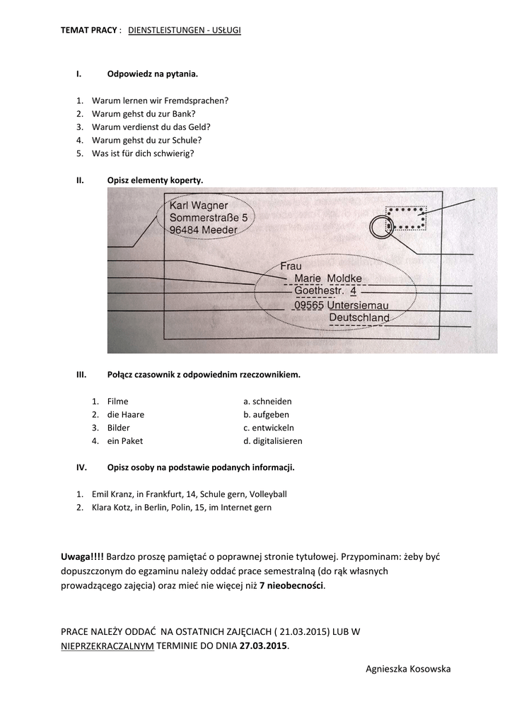 TEMAT PRACY : DIENSTLEISTUNGEN - USŁUGI I. 1. 2. 3. 4. 5. Odpowiedz na pytania. Warum lernen wir Fremdsprachen? Warum gehst du zur Bank? Warum verdienst du das Geld? Warum gehst du zur Schule? Was ist für dich schwierig? II. Opisz elementy koperty. III. Połącz czasownik z odpowiednim rzeczownikiem. 1. 2. 3. 4. IV. Filme die Haare Bilder ein Paket a. schneiden b. aufgeben c. entwickeln d. digitalisieren Opisz osoby na podstawie podanych informacji. 1. Emil Kranz, in Frankfurt, 14, Schule gern, Volleyball 2. Klara Kotz, in Berlin, Polin, 15, im Internet gern Uwaga!!!! Bardzo proszę pamiętać o poprawnej stronie tytułowej. Przypominam: żeby być dopuszczonym do egzaminu należy oddać prace semestralną (do rąk własnych prowadzącego zajęcia) oraz mieć nie więcej niż 7 nieobecności. PRACE NALEŻY ODDAĆ NA OSTATNICH ZAJĘCIACH ( 21.03.2015) LUB W NIEPRZEKRACZALNYM TERMINIE DO DNIA 27.03.2015. Agnieszka Kosowska