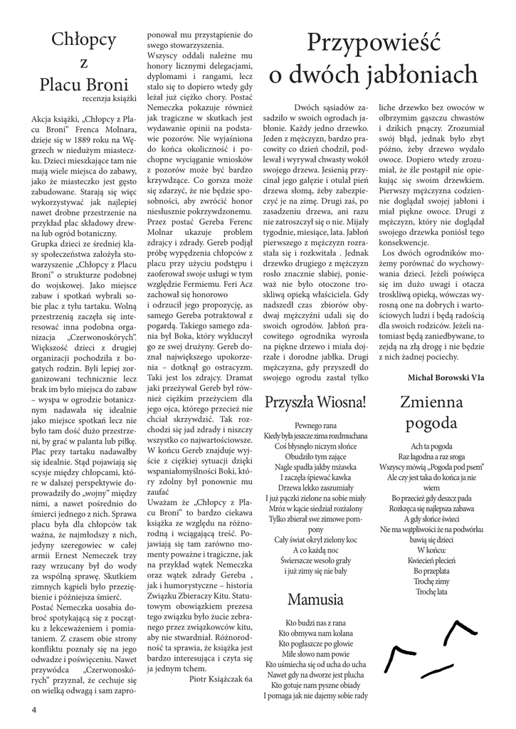 Chłopcy z Placu Broni recenzja książki Akcja książki, „Chłopcy z Placu Broni” Frenca Molnara, dzieje się w 1889 roku na Węgrzech w niedużym miasteczku. Dzieci mieszkające tam nie mają wiele miejsca do zabawy, jako że miasteczko jest gęsto zabudowane. Starają się więc wykorzystywać jak najlepiej nawet drobne przestrzenie na przykład plac składowy drewna lub ogród botaniczny. Grupka dzieci ze średniej klasy społeczeństwa założyła stowarzyszenie „Chłopcy z Placu Broni” o strukturze podobnej do wojskowej. Jako miejsce zabaw i spotkań wybrali sobie plac z tyłu tartaku. Wolną przestrzenią zaczęła się interesować inna podobna organizacja „Czerwonoskórych”. Większość dzieci z drugiej organizacji pochodziła z bogatych rodzin. Byli lepiej zorganizowani technicznie lecz brak im było miejsca do zabaw – wyspa w ogrodzie botanicznym nadawała się idealnie jako miejsce spotkań lecz nie było tam dość dużo przestrzeni, by grać w palanta lub piłkę. Plac przy tartaku nadawałby się idealnie. Stąd pojawiają się scysje między chłopcami, które w dalszej perspektywie doprowadziły do „wojny” między nimi, a nawet pośrednio do śmierci jednego z nich. Sprawa placu była dla chłopców tak ważna, że najmłodszy z nich, jedyny szeregowiec w całej armii Ernest Nemeczek trzy razy wrzucany był do wody za wspólną sprawę. Skutkiem zimnych kąpieli było przeziębienie i późniejsza śmierć. Postać Nemeczka uosabia dobroć spotykającą się z początku z lekceważeniem i pomiataniem. Z czasem obie strony konfliktu poznały się na jego odwadze i poświęceniu. Nawet przywódca „Czerwonoskórych” przyznał, że cechuje się on wielką odwagą i sam zapro4 ponował mu przystąpienie do swego stowarzyszenia. Wszyscy oddali należne mu honory licznymi delegacjami, dyplomami i rangami, lecz stało się to dopiero wtedy gdy leżał już ciężko chory. Postać Nemeczka pokazuje również jak tragiczne w skutkach jest wydawanie opinii na podstawie pozorów. Nie wyjaśniona do końca okoliczność i pochopne wyciąganie wniosków z pozorów może być bardzo krzywdzące. Co gorsza może się zdarzyć, że nie będzie sposobności, aby zwrócić honor niesłusznie pokrzywdzonemu. Przez postać Gereba Ferenc Molnar ukazuje problem zdrajcy i zdrady. Gereb podjął próbę wypędzenia chłopców z placu przy użyciu podstępu i zaoferował swoje usługi w tym względzie Fermiemu. Feri Acz zachował się honorowo i odrzucił jego propozycję, as samego Gereba potraktował z pogardą. Takiego samego zdania był Boka, który wykluczył go ze swej drużyny. Gereb doznał największego upokorzenia – dotknął go ostracyzm. Taki jest los zdrajcy. Dramat jaki przeżywał Gereb był również ciężkim przeżyciem dla jego ojca, którego przecież nie chciał skrzywdzić. Tak rozchodzi się jad zdrady i niszczy wszystko co najwartościowsze. W końcu Gereb znajduje wyjście z ciężkiej sytuacji dzięki wspaniałomyślności Boki, który zdolny był ponownie mu zaufać Uważam że „Chłopcy z Placu Broni” to bardzo ciekawa książka ze względu na różnorodną i wciągającą treść. Pojawiają się tam zarówno momenty poważne i tragiczne, jak na przykład wątek Nemeczka oraz wątek zdrady Gereba , jak i humorystyczne – historia Związku Zbieraczy Kitu. Statutowym obowiązkiem prezesa tego związku było żucie zebranego przez związkowców kitu, aby nie stwardniał. Różnorodność ta sprawia, że książka jest bardzo interesująca i czyta się ja jednym tchem. Piotr Książczak 6a Przypowieść o dwóch jabłoniach Dwóch sąsiadów zasadziło w swoich ogrodach jabłonie. Każdy jedno drzewko. Jeden z mężczyzn, bardzo pracowity co dzień chodził, podlewał i wyrywał chwasty wokół swojego drzewa. Jesienią przycinał jego gałęzie i otulał pień drzewa słomą, żeby zabezpieczyć je na zimę. Drugi zaś, po zasadzeniu drzewa, ani razu nie zatroszczył się o nie. Mijały tygodnie, miesiące, lata. Jabłoń pierwszego z mężczyzn rozrastała się i rozkwitała . Jednak drzewko drugiego z mężczyzn rosło znacznie słabiej, ponieważ nie było otoczone troskliwą opieką właściciela. Gdy nadszedł czas zbiorów obydwaj mężczyźni udali się do swoich ogrodów. Jabłoń pracowitego ogrodnika wyrosła na piękne drzewo i miała dojrzałe i dorodne jabłka. Drugi mężczyzna, gdy przyszedł do swojego ogrodu zastał tylko liche drzewko bez owoców w olbrzymim gąszczu chwastów i dzikich pnączy. Zrozumiał swój błąd, jednak było zbyt późno, żeby drzewo wydało owoce. Dopiero wtedy zrozumiał, że źle postąpił nie opiekując się swoim drzewkiem. Pierwszy mężczyzna codziennie doglądał swojej jabłoni i miał piękne owoce. Drugi z mężczyzn, który nie doglądał swojego drzewka poniósł tego konsekwencje. Los dwóch ogrodników możemy porównać do wychowywania dzieci. Jeżeli poświęca się im dużo uwagi i otacza troskliwą opieką, wówczas wyrosną one na dobrych i wartościowych ludzi i będą radością dla swoich rodziców. Jeżeli natomiast będą zaniedbywane, to zejdą na złą drogę i nie będzie z nich żadnej pociechy. Przyszła Wiosna! Zmienna pogoda Pewnego rana Kiedy była jeszcze zima rozdmuchana Coś błysnęło niczym słońce Obudziło tym zające Nagle spadła jakby mżawka I zaczęła śpiewać kawka Drzewa lekko zaszumiały I już pączki zielone na sobie miały Mróz w kącie siedział rozżalony Tylko zbierał swe zimowe pompony Cały świat okrył zielony koc A co każdą noc Świerszcze wesoło grały i już zimy się nie bały Mamusia Kto budzi nas z rana Kto obmywa nam kolana Kto pogłaszcze po głowie Miłe słowo nam powie Kto uśmiecha się od ucha do ucha Nawet gdy na dworze jest plucha Kto gotuje nam pyszne obiady I pomaga jak nie dajemy sobie rady Michał Borowski VIa Ach ta pogoda Raz łagodna a raz sroga Wszyscy mówią „Pogoda pod psem’’ Ale czy jest taka do ko