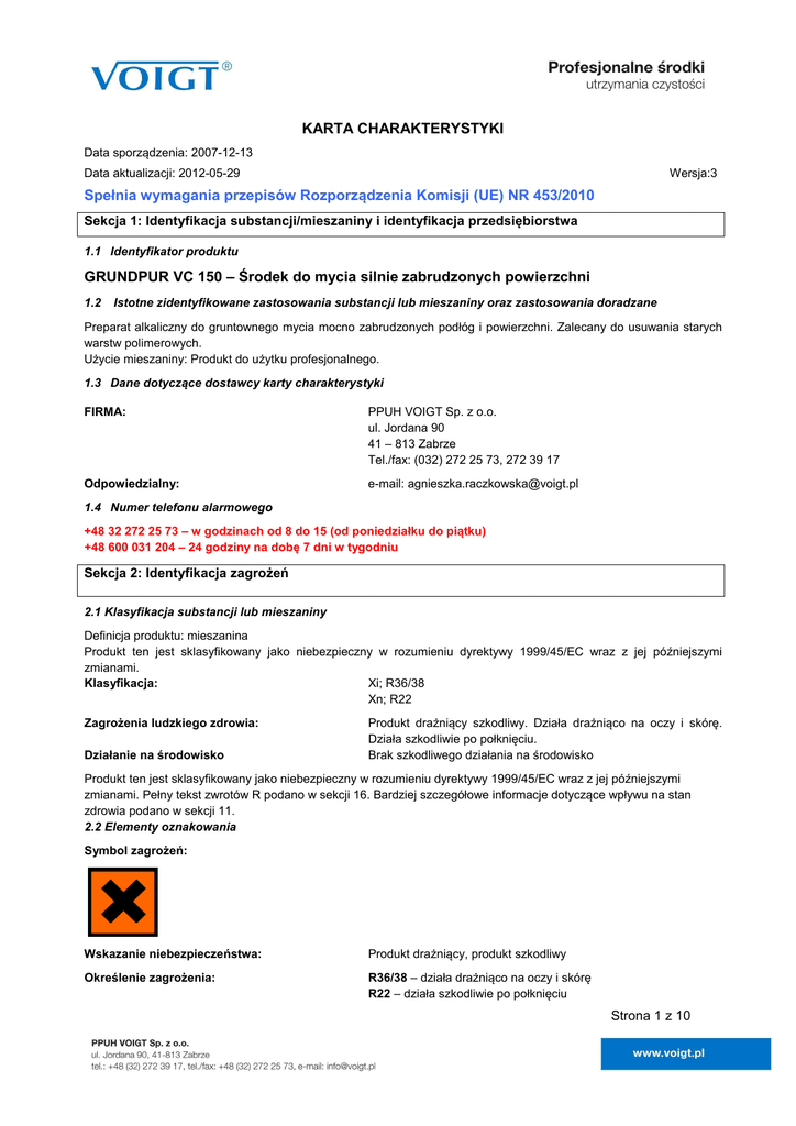 KARTA CHARAKTERYSTYKI Data sporządzenia: 2007-12-13 Data aktualizacji: 2012-05-29 Wersja:3 Spełnia wymagania przepisów Rozporządzenia Komisji (UE) NR 453/2010 Sekcja 1: Identyfikacja substancji/mieszaniny i identyfikacja przedsiębiorstwa 1.1 Identyfikator produktu GRUNDPUR VC 150 – Środek do mycia silnie zabrudzonych powierzchni 1.2 Istotne zidentyfikowane zastosowania substancji lub mieszaniny oraz zastosowania doradzane Preparat alkaliczny do gruntownego mycia mocno zabrudzonych podłóg i powierzchni. Zalecany do usuwania starych warstw polimerowych. Użycie mieszaniny: Produkt do użytku profesjonalnego. 1.3 Dane dotyczące dostawcy karty charakterystyki FIRMA: PPUH VOIGT Sp. z o.o. ul. Jordana 90 41 – 813 Zabrze Tel./fax: (032) 272 25 73, 272 39 17 Odpowiedzialny: e-mail: [email protected] 1.4 Numer telefonu alarmowego +48 32 272 25 73 – w godzinach od 8 do 15 (od poniedziałku do piątku) +48 600 031 204 – 24 godziny na dobę 7 dni w tygodniu Sekcja 2: Identyfikacja zagrożeń 2.1 Klasyfikacja substancji lub mieszaniny Definicja produktu: mieszanina Produkt ten jest sklasyfikowany jako niebezpieczny w rozumieniu dyrektywy 1999/45/EC wraz z jej późniejszymi zmianami. Klasyfikacja: Xi; R36/38 Xn; R22 Zagrożenia ludzkiego zdrowia: Działanie na środowisko Produkt drażniący szkodliwy. Działa drażniąco na oczy i skórę. Działa szkodliwie po połknięciu. Brak szkodliwego działania na środowisko Produkt ten jest sklasyfikowany jako niebezpieczny w rozumieniu dyrektywy 1999/45/EC wraz z jej późniejszymi zmianami. Pełny tekst zwrotów R podano w sekcji 16. Bardziej szczegółowe informacje dotyczące wpływu na stan zdrowia podano w sekcji 11. 2.2 Elementy oznakowania Symbol zagrożeń: Wskazanie niebezpieczeństwa: Produkt drażniący, produkt szkodliwy Określenie zagrożenia: R36/38 – działa drażniąco na oczy i skórę R22 – działa szkodliwie po połknięciu Strona 1 z 10 Warunki bezpiecznego stosowania: S2 – chronić przed dziećmi S24/25 – unikać zanieczyszczenia skóry i oczu S26 – zanieczyszczone oczy przemyć natychmiast dużą ilością wody i zasięgnąć porady lekarza S28 – zanieczyszczoną skórę natychmiast przemyć dużą ilością wody. S46 - w razie połknięcia niezwłocznie zasięgnij porady lekarza – pokaż opakowanie 2.3 Inne zagrożenia Brak. Sekcja 3: Skład/informacja o składnikach 3.1 Mieszaniny Nazwa Chemiczna Identyfikatory % Klasyfikacja 67/548/EWG polimer na bazie oksyetylenowego rozgałęzionego alkoholu długołańcuchowego (C13) 2-aminoetanol 2-butoksyetanol alkohol benzylowy CAS: 69011-36-5 Nr WE: polimer Nr indeksowy: nie dotyczy Nr rejestracji: brak danych CAS 141-35-5 WE205-483-3 Indeks 603-030-00-8 Nr rejestracji: 01-2119486455-28-xxxx CAS: 111-76-2 Nr WE:203-905-0 Nr indeksowy: 603-014-00-0 Nr rejestracji: 01-2119475108-36-xxxxx CAS: 100-51-6 Nr WE:202-859-9 Nr indeksowy: 603-057-00-5 Nr rejestracji: 01-2119492630-38-xxxxx <1 Xn; R22 Xi; R41 Rozporządzenie WE Nr 127/2008 [CLP] Acute Tox.4; H302 Eye Dam.1; H318 <3 Xn; R20/21/22 C; R34 Acute Tox.4; H332, H312, H302 Skin Corr.1B; H314 <12 Xn; R20/21/22 Xi; R36/38 Acute Tox.4; H332 ; H312; H302 Eye Irrit.2; H319 Skin Irrit.2; H315 <9 C; R34 N, R50 Skin Corr. 1B, H314 Eye Dam.1; H318 STOT SE 3, H335 Aquatic Acute 1, H400 Komentarz części składowych: Pełna treść przytoczonych wskazówek dotyczących zagrożeń znajduje się w sekcji 16. Sekcja 4: Środki pierwszej pomocy 4.1 Opis środków pierwszej pomocy W razie dostania się do dróg oddechowych: Kontakt ze skórą: Kontakt z oczami: Droga pokarmowa: Zapewnić dopływ świeżego powietrza. W przypadku nie ustąpienia objawów, wezwać pomoc medyczną. Spłukać skażoną skórę dużą ilością wody, zdjąć odzież, skontaktować się z lekarzem. Płukać przez kilka minut pod bieżącą wodą przy otwartych powiekach, nałożyć jałowy opatrunek, skontaktować się z lekarzem. Popić dużą ilością wody, nie wywoływać wymiotów, natychmiast skontaktować się z lekarzem. 4.2 Najważniejsze ostre i opóźnione objawy oraz skutki narażenia Brak Strona 2 z 10 4.3 Wskazania dotyczące wszelkiej natychmiastowej pomocy lekarskiej i szczególne postępowania z poszkodowanym Wskazówki dla lekarza: Leczenie objawowe. Sekcja 5: Postępowanie w przypadku pożaru 5.1 Środki gaśnicze Stosowany środek gaszący: Użyć środka gaśniczego odpowiedniego dla ognia i otoczenia. Niewłaściwe środki gaśnicze: Nie znane. 5.2 Szczególne zagrożenia związane z substancją lub mieszaniną W wyniku pożaru mogą tworzyć się szkodliwe dla zdrowia opary – stosować środki ochrony dróg oddechowych. 5.3 Informacje dla straży pożarnej Specjalny sprzęt ochronny dla strażaków: Podstawowy sprzęt ochrony osobistej oraz indywidualne aparaty oddechowe. Podstawowy poziom ochrony podczas wypadków chemicznych zapewnia odzież stosowana przez strażaków (włączając hełmy, buty ochronne i rękawice). Dodatkowe wskazówki: Pozostałości po pożarze i zanieczyszczoną wodę używaną do gaszenia ognia, muszą być usunięte zgodnie z przepisami. Sekcja 6: Postępowanie w przypadku niezamierzonego uwolnienia do środowiska 6.1 Indywidualne środki ostrożności, wyposażenie ochronne i procedury w sytuacjach awaryjnych Dla osób nienależących do personelu udzielającego pomocy: Dla osób udzielających pomocy: Nie należy podejmować żadnych działań, które stwarzałyby ryzyko dla kogokolwiek chyba, że jest się odpowiednio przeszkolonym. Nie dotykać, ani nie przechodzić po rozlanym materiale. Stosować środki ochrony indywidualnej. Unikać zanieczyszczenia oczu i skóry. Zapewnić odpowiednią wentylację. Dopilnować, aby usuwanie awarii i jej skutków przeprowadzał wyłącznie przeszkolony personel. Stosować środki ochrony indywidualnej. 6.2 Środki ostrożności w zakresie ochrony środowiska W przypadku uwolnienia większych ilości preparatu należy nie dopuścić do rozprzestrzenienia si