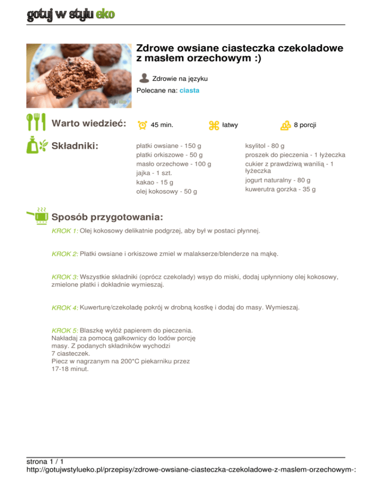 Zdrowe owsiane ciasteczka czekoladowe z masłem orzechowym :) Zdrowie na języku Polecane na: ciasta Warto wiedzieć: Składniki: 45 min. płatki owsiane - 150 g płatki orkiszowe - 50 g masło orzechowe - 100 g jajka - 1 szt. kakao - 15 g olej kokosowy - 50 g łatwy 8 porcji ksylitol - 80 g proszek do pieczenia - 1 łyżeczka cukier z prawdziwą wanilią - 1 łyżeczka jogurt naturalny - 80 g kuwerutra gorzka - 35 g Sposób przygotowania: KROK 1: Olej kokosowy delikatnie podgrzej, aby był w postaci płynnej. KROK 2: Płatki owsiane i orkiszowe zmiel w malakserze/blenderze na mąkę. KROK 3: Wszystkie składniki (oprócz czekolady) wsyp do miski, dodaj upłynniony olej kokosowy, zmielone płatki i dokładnie wymieszaj. KROK 4: Kuwerturę/czekoladę pokrój w drobną kostkę i dodaj do masy. Wymieszaj. KROK 5: Blaszkę wyłóż papierem do pieczenia. Nakładaj za pomocą gałkownicy do lodów porcję masy. Z podanych składników wychodzi 7 ciasteczek. Piecz w nagrzanym na 200*C piekarniku przez 17-18 minut. strona 1 / 1 http://gotujwstylueko.pl/przepisy/zdrowe-owsiane-ciasteczka-czekoladowe-z-maslem-orzechowym-: Powered by TCPDF (www.tcpdf.org)