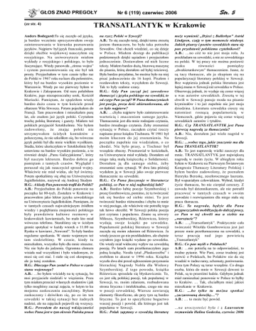 GŁOS ZNAD PREGOŁY (ze str. 4) Anders Bodegard:To się zaczęło od języka, ja bardzo wcześnie sprecyzowałem swoje zainteresowania w kierunku poznawania języków. Najpierw był język francuski, potem dzięki służbie wojskowej nauczyłem się rosyjskiego. Na uniwersytecie miałem wykłady z rosyjskiego i polskiego, to było fascynujące. Wtedy panowała „zimna wojna” i system porozumiewania się nie był tak prosty. Przyjechałem w tym czasie tylko raz do Polski w 1967 roku na kurs dla polonistów, który był na bardzo wysokim poziomie w Warszawie. Wtedy po raz pierwszy byłem w Krakowie i Zakopanem. Od razu polubiłem Kraków, jego niezaprzeczalny urok, Kościół Mariacki. Pamiętam, że spędziłem wtedy bardzo dużo czasu w tym kościele przed ołtarzem Wita Stwosza. Potem pojechałem do Francji. Tam pracowałem i mieszkałem parę lat, ale znałem już język polski. Czytałem trochę polską literaturę i gazety. Miałem też polskich przyjaciół Sztokholmie. Nie byłem zadowolony, że znając polski nie utrzymywałem ścisłych kontaktów z polszczyzną, że nie szkoliłem się, bo wówczas język polski był dla mnie wielkim wysiłkiem. Studia, które ukończyłem w Sztokholmie były ustawione na bardzo wysokim poziomie, a to również dzięki „Panu Galicyjskiemu”, który był naszym lektorem. Bardzo dobrze go pamiętam z tamtych czasów. Wyglądał i poruszał się jak nauczyciel sprzed wojny. Właściwie nie miał wieku, ale był świetny. Potem spotkaliśmy się obaj na Uniwersytecie Jagiellońskim, nazywał się Andrzej Siudym H.G.: A kiedy Pan ponownie trafił do Polski? A.B.: Przyjechałem do Polski ponownie na początku lat 80-tych. Zostałem w Krakowie i pracowałem jako lektor języka szwedzkiego na Uniwersytecie Jagiellońskim. Pamiętam, że w tamtych czasach najważniejszym źródłem wiedzy i pogłębiania znajomości polskiego były prawdziwie kultowe rozmowy w krakowskich kawiarniach, bo mało kto miał wówczas telefonu. Staraliśmy się w ścisłym gronie spotykać w każdy wtorek o 11.00 na Rynku w kawiarni „Noworol”. To były bardzo regularne spotkania. W stanie wojennym też tam siedzieliśmy. W czasie, kiedy tu mieszkałem, wszystko było dla mnie straszne. Nic nie było do jedzenia. Ogromna chmura wisiała nad wszystkimi i było wiadomym, że musi się coś stać. I stało się coś okropnego, ale ja tutaj zostałem. H.G.: Dlaczego Pan został w Polsce w czasie stanu wojennego? A.B.: …bo byłem wściekły na tę sytuację, bo moi przyjaciele siedzieli w więzieniu. Poza tym miałem przecież własnych studentów i jak tylko mogliśmy zacząć zajęcia, w lutym to ku mojemu zaskoczeniu zaczęliśmy. Byłem zaskoczony i dziwiłem się, po co im ten szwedzki w takiej sytuacji bez żadnych nadziei, ale na zajęciach pojawili się wszyscy. H.G.: Powodem do naszej wdzięczności wobec Pana jest w tym okresie Pańska praca Nr 6 (119) czerwiec 2006 Str. 5 TRANSATLANTYK w Krakowie na rzecz Polski w Szwecji? A.B.: To się zaczęło tutaj, dzięki temu zresztą jestem tłumaczem, bo była taka potrzeba Szwedów. Oni chcieli wiedzieć, co się dzieje w Polsce. Miałem dostęp do publikacji podziemnych dzięki sąsiadom i przyjaciołom jednocześnie. Dostawałem od nich liczne teksty. Miałem bardzo dużą, biurową maszynę do pisania, którą dostałem od byłej teściowej. Była bardzo przydatna, bo można było na niej pisać jednocześnie do 16 kopii. Pisałem i rozdawałem teksty, wysyłałem do Szwecji. Tak to były szalone czasy. H.G.: Gdy Pan zaczął już zawodowo tłumaczyć z języka polskiego na szwedzki, to od czego Pan zaczął? W Pana tłumaczeniach jest poezja, proza dość ukierunkowana, ale co było najpierw? A.B.: …chyba najpierw było zainteresowanie wartością i znaczeniem samego języka. Tłumaczenie jest dla mnie rodzajem czytania, bardzo żmudnego czytania. Żeby zrozumieć sytuację w Polsce, zacząłem czytać rzeczy napisane przez księdza Tischnera. W 1981 był moim kluczem do jej zrozumienia. Na początku zupełnie nie wiedziałem, o co chodzi. Nie było prasy, a Tischner był wszędzie obecny. Przemawiał w kościołach, na Uniwersytecie miał wykłady. Dostałem od niego taką małą książeczkę o Solidarności. Dostałem ją dla samego siebie, żeby zrozumieć sens sytuacji. W dwa lata później wydałem ją w Szwecji jako swoje pierwsze tłumaczenie na szwedzki. H.G.: Co Pana fascynuje w literaturze polskiej, co Pan w niej najbardziej lubi? A.B.: Bardzo lubię poezje Szymborskiej i prozę Gombrowicza, pomimo, że ta twórczość tak się bardzo od siebie różni. To jest twórczość bardzo różnorodna i chyba to mnie w niej pociąga, ale właściwie nie potrafię tego tak łatwo określić. W Szwecji polska poezja jest czytana i popularna. Znane są utwory Miłosza, Szymborskiej, Różewicza, którzy wydają swoje książki po szwedzku. Popularność polskiej literatury w Szwecji zaczęła się moim zdaniem od Różewicza. Ja wtedy jeszcze go nie przekładałem, ale chętnie czytałem jego książki wydane po szwedzku. On wtedy miał widoczny wpływ na szwedzką poezję. Po latach sam przetłumaczyłem jego jedną książkę. Nosiła tytuł „Płaskorzeźba” i zrobiłem to akurat w 1996 roku. Książka wyszła dwa dni przed ogłoszeniem przyznania literackiej Nagrody Nobla dla Wisławy Szymborskiej. Z tego powodu, książka Różewicza sprzedała się błyskawicznie. To, co jest siłą polskiej poezji, tak popularnej w Szwecji, to, moim zdaniem, rozbudowana strona liryczna i intelektualna, czego nie ma w poezji szwedzkiej. Wiersze zawierają elementy filozoficzne, ale przy tym są bardzo liryczne. To jest to specyficzne bogactwo waszej poezji i powód, dla którego jest tak popularna w Szwecji. H.G.: Polak zapytany o szwedzką literaturę może wymienić „Dzieci z Bullerbyn” Astrid Lindgren, czuję w tym momencie niedosyt. Jakich pisarzy i poetów szwedzkich stara się pan przedstawić polskiemu czyte