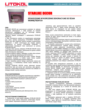 USZCZELNIACZE I DETERGENTY STARLIKE DECOR EPOKSYDOWE WYKOŃCZENIE DEKORACYJNE DO ŚCIAN WEWNĘTRZNYCH OPIS STARLIKE DECOR jest nowoczesnym produktem do realizacji wykończeń dekoracyjnych o małej grubości na ścianach wewnętrznych opierającym się na technologii zaprawy epoksydowej LITOCHROM STARLIKE®. Głównymi zaletami wynikającym z zastosowania STARLIKE DECOR są: ● Efekt chromatyczny podobny do szpachlowania wykonanego przy użyciu zaprawy epoksydowej LITOCHROM STARLIKE®. Możliwe jest więc połączenie kolorów pomiędzy powierzchniami wykonanymi z płytek ceramicznych lub mozaiki szklanej wygładzonych za pomocą LITOCHROM STARLIKE® a wykończeniami otaczających ścian wykonanymi za pomocą STARLIKE DECOR. ● Stosując różne sposoby nakładania STARLIKE DECOR można nadać powierzchniom osobliwe i dostosowane do gustów unikalne efekty chromatyczne i dekoracyjne. ● Podczas kolejnych aplikacji, nakładając na siebie różne odcienie kolorów, uzyskuje się nieskończoną ilość kombinacji. ● Nakładanie STARLIKE DECOR jest proste i szybkie. Stosując odpowiednie narzędzia, w krótkim czasie można uzyskać wykończenia o niepowtarzalnej wartości estetycznej. ● Dzięki niewielkiej grubości takiego wykończenia zużycie jest ograniczone i w konsekwencji również koszta interwencji są umiarkowane. ●Stosując STARLIKE DECOR można dekorować pionowe powierzchnie takie, jak surowy tynk cementowy, płyty gipsowokartonowe, panele lekkiej konstrukcji, drewniane oraz nakładać na istniejące mozaiki i wyroby ceramiczne. POLE ZASTOSOWANIA STARLIKE DECOR jest szczególnie wszechstronnym materiałem i może być stosowany do wykończenia ścian wewnętrznych w różnego rodzaju lokalach prywatnych i publicznych, jak na przykład: ● Łazienki i kabiny prysznicowe ● Kuchnie ● Sauny ● Hole hotelowe ● Ściany barów, restauracji, dyskotek ● Sale konferencyjne Może być również zastosowany jako dekoracja barów, drzwi, kolumn itd. PRZYGOTOWANIE POWIERZCHNI 1 - Powierzchnie, na które będzie nakładany STARLIKE DECOR muszą być czyste, solidne, bezkurzowe, wystarczająco dojrzałe, suche i płaskie. Odpowiednim podłożem jest surowy tynk cementowy, płyty gipsowo-kartonowe, beton po uprzednim zastosowaniu Primer C. Należy usunąć ewentualne farby lub emalie łącznie ze znajdującym się pod spodem tynkiem cementowym i przed naniesieniem warstwy podkładu, nałożyć Primer C. Należy usunąć powierzchniowe wykończenia na bazie wapna, cementu lub gipsu, których warstwa jest cienka, a na podłoże należy nałożyć Primer C Nierówne powierzchnie cementowe mogą być wypoziomowane za pomocą szybkotwardniejącej tiksotropowej cementowej zaprawy wyrównującej LITOPLAN RAPID. 2 - W przypadku zastosowania na surowym tynku cementowym, płytach gipsowo-kartonowych, panelach lekkiej konstrukcji i drewnianych, należy zastosować dwuskładnikowy podkład epoksydowy DECOR PRIMER nakładając go za pomocą gładkiej szpachli stalowej, równomiernie wygładzając na około 1 mm. Jeżeli będzie nakładany na istniejące płytki ceramiczne lub mozaiki, zastosować DECOR PRIMER bezpośrednio na czystej powierzchni, nakładając 2 warstwy metodą krzyżową (druga warstwa jest nakładana pod kątem prostym w stosunku do pierwszej warstwy po upływie 24 godzin). Pierwsza warstwa umożliwia uzyskanie białej powierzchni oraz ujednolicenie wchłaniania powierzchni przy kolejnym zastosowaniu STARLIKE DECOR. W przypadku lekko nieregularnych powierzchni, w celu ich wyrównania, może się okazać konieczne zastosowanie dodatkowej warstwy DECOR PRIMER. Po zakończeniu wyrównywania za pomocą DECOR PRIMER należy odczekać 24 godziny na stwardniacie; następnie można przystąpić do wygładzania powierzchni usuwając ewentualne nierówności. 3 - Wygładzać ręcznie lub za pomocą szlifierki orbitalnej używając jasnego papieru ściernego o gramaturze 60; po zakończeniu usunąć powstały kurz. Gdy powierzchnia jest jednolita i płaska oraz całkowicie sucha można przystąpić do nakładania STARLIKE DECOR. PRZYGOTOWANIE STARLIKE DECOR 1 - Otworzyć 2,5-kilogramowe opakowanie LITOCHROM STARLIKE® o wybranym kolorze i wlać całą zawartość katalizatora (składnik B) znajdującego się w torebce do kolorowej pasty (składnik A). 2 - Wlać trzeci składnik płynny STARLIKE DECOR, ilość przygotowana do 2,5-kilogramowego opakowania LITOCHROM STARLIKE® i za pomocą wiertarki wyposażonej w mieszadło mieszać z małą prędkością, aż do uzyskania jednorodnej mieszanki. 3 - Ewentualnie zastosować jeden z dodatków SPOTLIGHT, NIGHT VISION, GOLD lub, w przypadku neutralnego koloru dodatek z gamy METALLIC COLLECTION (Platinum, Shining Gold, Bronze, Copper, Rusty) www.litokol.it 1 USZCZELNIACZE I DETERGENTY CEMENTOWE Ponownie wymieszać w celu uzyskania jednorodnej mieszanki. Produkt jest gotowy do zastosowania. NANOSZENIE STARLIKE DECOR STARLIKE DECOR można nanosić na różne sposoby co umożliwia nadanie powierzchni odmiennych efektów. Poniżej opisano 4 możliwe do uzyskania rodzaje wykończenia. EFEKT CHMURY Za pomocą gładkiej plastikowej szpachli (Art.103 PRO) wygładzić “na zero” stosując STARLIKE DECOR; nie zostawiać wybrzuszeń lub ewidentnych śladów po szpachli. Po upływie około 24 godzin, tym samym sposobem nałożyć kolejną warstwę. EFEKT POKRYWAJĄCY W celu uzyskania bardziej jednolitej barwy, w odstępie 24 godzin można nałożyć co najmniej 3 lub więcej warstw za pomocą gładkiej plastikowej szpachli (Art.103 PRO). EFEKT SPATOLATO Rodzaj wykończenia: powierzchnia wypukła Za pomocą gładkiej szpachli nałożyć Starlike Decor w sposób niejednolity tworząc różne grubości od 1 do 2 mm. W tym przypadku niedokładności będą stanowiły dekorację. EFEKT RANDOM Rodzaj wykończenia: powierzchnia wypukła Za pomocą gładkiej szpachli nałożyć StarlikeDecor w sposób nieregularny tworząc różne grubości od 1 a 2 mm i