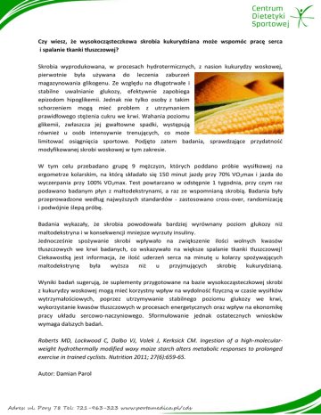 Czy wiesz, że wysokocząsteczkowa skrobia kukurydziana może wspomóc pracę serca i spalanie tkanki tłuszczowej? Skrobia wyprodukowana, w procesach hydrotermicznych, z nasion kukurydzy woskowej, pierwotnie była używana do leczenia zaburzeń magazynowania glikogenu. Ze względu na długotrwałe i stabilne uwalnianie glukozy, efektywnie zapobiega epizodom hipoglikemii. Jednak nie tylko osoby z takim schorzeniem mogą mieć problem z utrzymaniem prawidłowego stężenia cukru we krwi. Wahania poziomu glikemii, zwłaszcza jej gwałtowne spadki, występują również u osób intensywnie trenujących, co może limitować osiągnięcia sportowe. Podjęto zatem badania, sprawdzające przydatność modyfikowanej skrobi woskowej w tym zakresie. W tym celu przebadano grupę 9 mężczyzn, których poddano próbie wysiłkowej na ergometrze kolarskim, na którą składało się 150 minut jazdy przy 70% VO 2max i jazda do wyczerpania przy 100% VO2max. Test powtarzano w odstępnie 1 tygodnia, przy czym raz podawano badanym płyn z maltodekstrynami, a raz ze wspomnianą skrobią. Badania były przeprowadzone według najwyższych standardów - zastosowano cross-over, randomizację i podwójnie ślepą próbę. Badania wykazały, że skrobia powodowała bardziej wyrównany poziom glukozy niż maltodekstryna i w konsekwencji mniejsze wyrzuty insuliny. Jednocześnie spożywanie skrobi wpływało na zwiększenie ilości wolnych kwasów tłuszczowych we krwi badanych, co wskazywało na większe spalanie tkanki tłuszczowej! Ciekawostką jest informacja, że ilość uderzeń serca na minutę u kolarzy spożywających maltodekstrynę była wyższa niż u przyjmujących skrobię kukurydzianą. Wyniki badań sugerują, że suplementy przygotowane na bazie wysokocząsteczkowej skrobi z kukurydzy woskowej mogą mieć korzystny wpływ na wydolność fizyczną w czasie wysiłków wytrzymałościowych, poprzez utrzymywanie stabilnego poziomu glukozy we krwi, wykorzystanie kwasów tłuszczowych w procesach energetycznych oraz wpływ na ekonomikę pracy układu sercowo-naczyniowego. Sformułowanie jednak ostatecznych wniosków wymaga dalszych badań. Roberts MD, Lockwood C, Dalbo VJ, Volek J, Kerksick CM. Ingestion of a high-molecularweight hydrothermally modified waxy maize starch alters metabolic responses to prolonged exercise in trained cyclists. Nutrition 2011; 27(6):659-65. Autor: Damian Parol Adres: ul. Pory 78 Tel: 721-963-323 www.portamedica.pl/cds