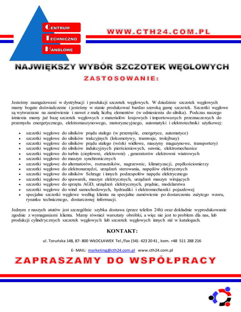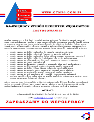 Jesteśmy zaangażowani w dystrybucji i produkcji szczotek węglowych. W dziedzinie szczotek węglowych mamy bogate doświadczenie i jesteśmy w stanie produkować bardzo szeroką gamę szczotek. Szczotki węglowe są wytwarzane na zamówienie i nawet z małą liczbą elementów (w odniesieniu do silnika). Podczas naszego istnienia mamy już bazę szczotek węglowych z materiałów krajowych i importowanych przeznaczonych do przemysłu energetycznego, elektromaszynowego, motoryzacyjnego, automatyki i elektrotechniki użytkowej: szczotki węglowe do silników prądu stałego (w przemyśle, energetyce, automatyce) szczotki węglowe do silników trakcyjnych (lokomotywy, tramwaje, trolejbusy) szczotki węglowe do silników prądu stałego (wózki widłowe, maszyny magazynowe, transportery) szczotki węglowe do silników indukcyjnych pierścieniowych, suwnic, elektromechanice szczotki węglowe do turbin (ciepłowni, elektrowni) , generatorów elektrowni wiatrowych szczotki węglowe do maszyn synchronicznych szczotki węglowe do alternatorów, rozruszników, nagrzewnic, klimatyzacji, prędkościomierzy szczotki węglowe do elektronarzędzi, urządzeń sterowania, napędów elektrycznych szczotki węglowe do silników Schrage i innych podzespołów napędu elektrycznego szczotki węglowe do spawarek, maszyn elektrycznych, urządzeń maszyn wirujących szczotki węglowe do sprzętu AGD, urządzeń elektrycznych, prądnic, modelarstwa szczotki węglowe do wind samochodowych, hydrauliki i elektromechaniki pojazdowej specjalne szczotki węglowe według klienta na specjalne zamówienie po dostarczeniu zużytego wzoru, rysunku technicznego, dostarczonej informacji. Jednym z naszych atutów jest szczególnie szybka dostawa (przez telefon 24h) oraz dokładnie wyprodukowanie zgodnie z wymaganiami klienta. Mamy również warsztaty obróbki, a więc nie jest to problem dla nas, lub produkcji cylindrycznych szczotek węglowych lub szczotek węglowych innych niż w katalogach. KONTAKT: ul. Toruńska 148, 87- 800 WŁOCŁAWEK Tel./fax (54)- 423 20 41 , kom. +48 511 288 216 E- MAIL: [email protected] www.cth24.com.pl