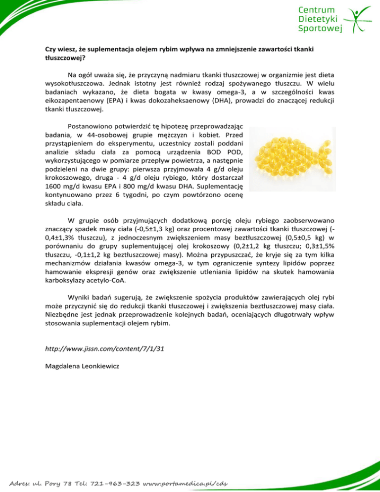 Czy wiesz, że suplementacja olejem rybim wpływa na zmniejszenie zawartości tkanki tłuszczowej? Na ogół uważa się, że przyczyną nadmiaru tkanki tłuszczowej w organizmie jest dieta wysokotłuszczowa. Jednak istotny jest również rodzaj spożywanego tłuszczu. W wielu badaniach wykazano, że dieta bogata w kwasy omega-3, a w szczególności kwas eikozapentaenowy (EPA) i kwas dokozaheksaenowy (DHA), prowadzi do znaczącej redukcji tkanki tłuszczowej. Postanowiono potwierdzić tę hipotezę przeprowadzając badania, w 44-osobowej grupie mężczyzn i kobiet. Przed przystąpieniem do eksperymentu, uczestnicy zostali poddani analizie składu ciała za pomocą urządzenia BOD POD, wykorzystującego w pomiarze przepływ powietrza, a następnie podzieleni na dwie grupy: pierwsza przyjmowała 4 g/d oleju krokoszowego, druga - 4 g/d oleju rybiego, który dostarczał 1600 mg/d kwasu EPA i 800 mg/d kwasu DHA. Suplementację kontynuowano przez 6 tygodni, po czym powtórzono ocenę składu ciała. W grupie osób przyjmujących dodatkową porcję oleju rybiego zaobserwowano znaczący spadek masy ciała (-0,5±1,3 kg) oraz procentowej zawartości tkanki tłuszczowej (0,4±1,3% tłuszczu), z jednoczesnym zwiększeniem masy beztłuszczowej (0,5±0,5 kg) w porównaniu do grupy suplementującej olej krokoszowy (0,2±1,2 kg tłuszczu; 0,3±1,5% tłuszczu, -0,1±1,2 kg beztłuszczowej masy). Można przypuszczać, że kryje się za tym kilka mechanizmów działania kwasów omega-3, w tym ograniczenie syntezy lipidów poprzez hamowanie ekspresji genów oraz zwiększenie utleniania lipidów na skutek hamowania karboksylazy acetylo-CoA. Wyniki badań sugerują, że zwiększenie spożycia produktów zawierających olej rybi może przyczynić się do redukcji tkanki tłuszczowej i zwiększenia beztłuszczowej masy ciała. Niezbędne jest jednak przeprowadzenie kolejnych badań, oceniających długotrwały wpływ stosowania suplementacji olejem rybim. http://www.jissn.com/content/7/1/31 Magdalena Leonkiewicz Adres: ul. Pory 78 Tel: 721-963-323 www.portamedica.pl/cds