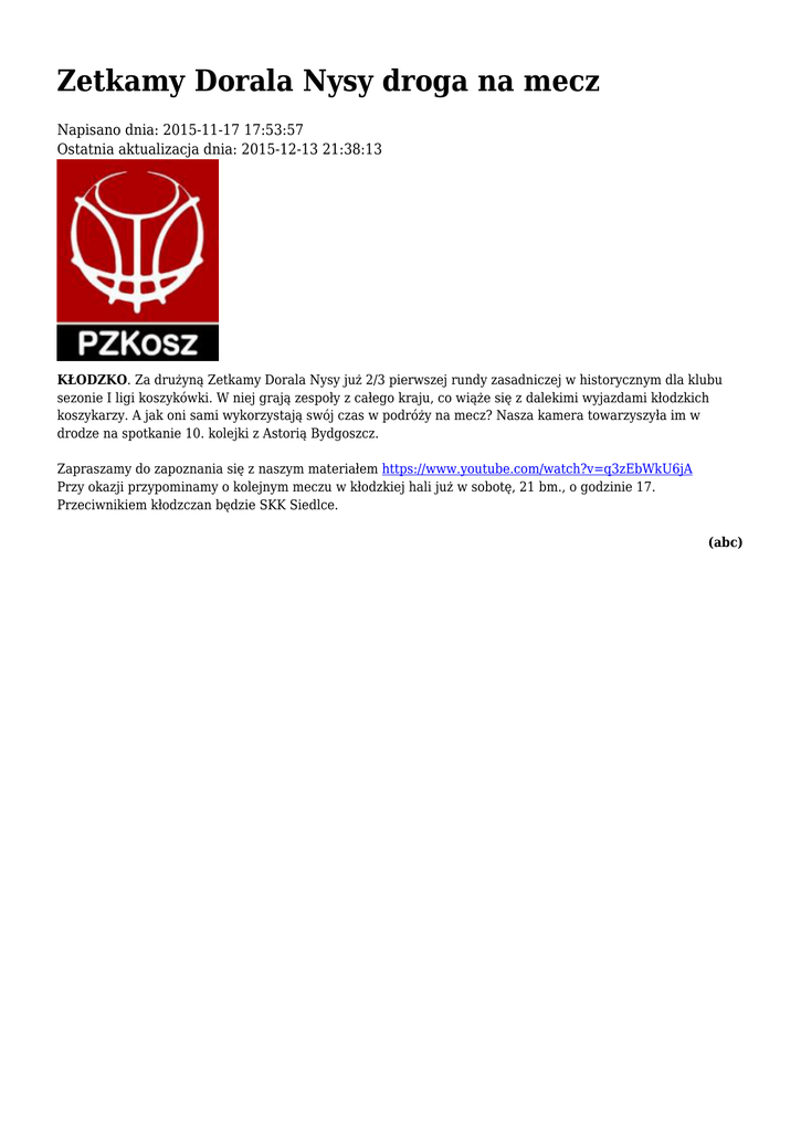 Zetkamy Dorala Nysy droga na mecz Napisano dnia: 2015-11-17 17:53:57 Ostatnia aktualizacja dnia: 2015-12-13 21:38:13 KŁODZKO. Za drużyną Zetkamy Dorala Nysy już 2/3 pierwszej rundy zasadniczej w historycznym dla klubu sezonie I ligi koszykówki. W niej grają zespoły z całego kraju, co wiąże się z dalekimi wyjazdami kłodzkich koszykarzy. A jak oni sami wykorzystają swój czas w podróży na mecz? Nasza kamera towarzyszyła im w drodze na spotkanie 10. kolejki z Astorią Bydgoszcz. Zapraszamy do zapoznania się z naszym materiałem https://www.youtube.com/watch?v=q3zEbWkU6jA Przy okazji przypominamy o kolejnym meczu w kłodzkiej hali już w sobotę, 21 bm., o godzinie 17. Przeciwnikiem kłodzczan będzie SKK Siedlce. (abc)