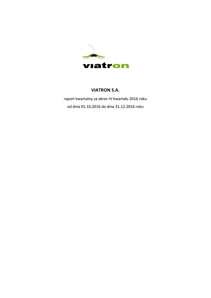 VIATRON S.A. raport kwartalny za okres IV kwartału 2016 roku od dnia 01.10.2016 do dnia 31.12.2016 roku Viatron S.A. Raport IV kwartał 2016 Spis treści 1. Podstawowe informacje o Emitencie - Viatron S.A. .......................................................................... 3 2. Kwartalne skrócone sprawozdanie finansowe .................................................................................. 4 3. Informacje o zasadach przyjętych przy sporządzaniu raportu, w tym informacje o zmianach stosowanych zasad (polityki) rachunkowości. ................................................................................... 9 4. Zwięzła charakterystyka istotnych dokonań lub niepowodzeń emitenta w okresie, którego dotyczy raport, wraz z opisem najważniejszych czynników i zdarzeń, w szczególności o nietypowym charakterze, mających wpływ na osiągnięte wyniki ...................................................... 9 5. Komentarz Zarządu Emitenta dotyczący realizacji prognoz finansowych ......................................... 10 6. Opis stanu realizacji działań i inwestycji Emitenta oraz harmonogramu ich realizacji ...................... 10 7. Inicjatywy podejmowane w okresie objętym raportem w obszarze rozwoju prowadzonej działalności, nastawione na wprowadzenie rozwiązań innowacyjnych w przedsiębiorstwie ............ 10 8. Struktura akcjonariatu emitenta, ze wskazaniem akcjonariuszy posiadających, na dzień przekazania raportu, co najmniej 5% głosów na walnym zgromadzeniu .......................................... 12 9. Opis organizacji grupy kapitałowej, ze wskazaniem jednostek podlegających konsolidacji .............. 12 10. Wskazanie przyczyn niesporządzania skonsolidowanych sprawozdań finansowych ........................ 12 11. Informacje dotyczące liczby osób zatrudnionych przez emitenta, w przeliczeniu na pełne etaty ..... 12 Viatron S.A. Raport IV kwartał 2016 1. Podstawowe informacje o Emitencie - Viatron S.A. Nazwa (firma): Forma prawna: Kraj siedziby: Siedziba: Adres siedziby: Adres do korespondencji: Telefon: Fax: Adres e-mail: Adres WWW: REGON: NIP: Viatron S.A. Spółka Akcyjna Rzeczpospolita Polska Gdynia ul. Plac Kaszubski 8/505, 81-350 Gdynia ul. Plac Kaszubski 8/505, 81-350 Gdynia +48 58 783 50 95 +48 58 783 23 94 [email protected] [email protected] www.viatron.pl 220689876 5851443987 Skład Zarządu Emitenta: Igor Pawela – Prezes Zarządu Skład Rady Nadzorczej Emitenta: Grzegorz Żółcik – Przewodniczący Rady Nadzorczej, Tomasz Kwieciński – Członek Rady Nadzorczej, Piotr Pawela – Członek Rady Nadzorczej, Marek Perczyński – Członek Rady Nadzorczej, Sylwia Szewczyk – Członek Rady Nadzorczej. Kadencja Rady Nadzorczej zgodnie z § 15. pkt 3 Statutu Spółki wynosi 2 lata. Od dnia 14.08.2013 r. akcje Spółki są notowane w Alternatywnym Systemie Obrotu NewConnect, prowadzonym przez Giełdę Papierów Wartościowych w Warszawie S.A. Spółka działa na podstawie statutu, regulaminów wewnętrznych oraz Kodeksu Spółek Handlowych i innych przepisów prawa. Viatron S.A. Raport IV kwartał 2016 2. Kwartalne skrócone sprawozdanie finansowe Skrócony bilans – Aktywa dane na dzień 31.12.2016 dane porównawcze na dzień 31.12.2015 18 341 18 940 12 15 17 254 18 224 III. NALEŻNOŚCI DŁUGOTERMINOWE 0 0 IV. INWESTYCJE DŁUGOTERMINOWE 0 0 IV. DŁUGOTERMINOWE ROZLICZENIA MIĘDZYOKRESOWE B. AKTYWA OBROTOWE 1 075 701 6 771 8 002 0 0 II. NALEŻNOŚCI KRÓTKOTERMINOWE 4 334 7 393 III. INWESTYCJE KRÓTKOTERMINOWE 92 493 2 345 116 AKTYWA A. AKTYWA TRWAŁE I. WARTOŚCI NIEMATERIALNE I PRAWNE II. RZECZOWE AKTYWA TRWAŁE I. ZAPASY IV. KRÓTKOTERMINOWE ROZLICZENIA MIĘDZYOKRESOWE AKTYWA RAZEM 25 112 26 942 Źródło: Emitent Skrócony bilans – Pasywa dane na dzień 31.12.2016 dane porównawcze na dzień 31.12.2015 A. KAPITAŁ (FUNDUSZ) WŁASNY 2 319 5 047 I. KAPITAŁ (FUNDUSZ) PODSTAWOWY 1 141 1 141 0 0 0 0 2 763 381 0 0 0 0 0 (556) (1 585) 4 081 0 0 22 793 21 895 1 168 1 042 158 6 646 12 260 4 155 9 207 10 052 25 112 26 942 PASYWA II. NALEŻNE WPŁATY NA KAPITAŁ PODSTAWOWY (wielkość ujemna) III. UDZIAŁY (AKCJE) WŁASNE (wielkość ujemna) IV. KAPITAŁ (FUNDUSZ) ZAPASOWY V. KAPITAŁ (FUNDUSZ) Z AKTUALIZACJI WYCENY VI. POZOSTAŁE KAPITAŁY (FUNDUSZE) REZERWOWE VII. ZYSK (STRATA) Z LAT UBIEGŁYCH VIII. ZYSK (STRATA) NETTO IX. ODPISY Z ZYSKU NETTO W CIĄGU ROKU OBROTOWEGO (wielkość ujemna) B. ZOBOWIĄZANIA I REZERWY NA ZOBOWIĄZANIA I. REZERWY NA ZOBOWIĄZANIA II. ZOBOWIĄZANIA DŁUGOTERMINOWE III. ZOBOWIĄZANIA KRÓTKOTERMINOWE IV. ROZLICZENIA MIĘDZYOKRESOWE PASYWA RAZEM Źródło: Emitent Skrócony Rachunek zysków i strat za IV kwartał 2016 roku oraz dane porównawcze ( w tyś. PLN) Wyszczególnienie A. PRZYCHODY ZE SPRZEDAŻY I ZRÓWNANE Z NIMI: - od jednostek powiązanych I. PRZYCHODY NETTO ZE SPRZEDAŻY PRODUKTÓW I USŁUG II. ZMIANA STANU PRODUKTÓW (ZWIĘKSZENIE - WARTOŚĆ DODATNIA, ZMNIEJSZENIE - WARTOŚĆ UJEMNA) III. KOSZT WYTWORZENIA PRODUKTÓW NA WŁASNE POTRZEBY JEDNOSTKI IV. PRZYCHODY NETTO ZE SPRZEDAŻY TOWARÓW I MATERIAŁÓW B. KOSZTY DZIAŁALNOŚCI OPERACYJNEJ I. AMORTYZACJA II. ZUŻYCIE MATERIAŁÓW I ENERGII III. USŁUGI OBCE IV. PODATKI I OPŁATY W TYM: - podatek akcyzowy V. WYNAGRODZENIA VI. UBEZPIECZENIA SPOŁECZNE I INNE ŚWIADCZENIA VII. POZOSTAŁE KOSZTY RODZAJOWE VIII. WARTOŚĆ SPRZEDANYCH TOWARÓW I MATERIAŁÓW C. ZYSKI (STRATA) ZE SPRZEDAŻY (A-B) D. POZOSTAŁE PRZYCHODY OPERACYJNE I. ZYSK ZE ZBYCIA NIEFINANSOWYCH AKTYWÓW TRWAŁYCH II. DOTACJE III. INNE PRZYCHODY OPERACYJNE E. POZOSTAŁE KOSZTY OPERACYJNE I. STRATA ZE ZBYCIA NIEFINANSOWYCH AKTYWÓW TRWAŁYCH II. AKTUALIZACJA WARTOŚCI AKTYWÓW NIEFINANSOWYCH III. INNE KOSZTY OPERACYJNE F. ZYSK (STRATA) Z DZIAŁALNOŚCI OPERACYJNEJ (F+G-H) G. PRZYCHODY FINANSOWE I. DYWIDENDY I UDZIAŁY W ZYSKACH, W TYM: - od jednostek powiązanych II. ODSETKI, W TYM: - od jednostek powiązanych III. ZYSK ZE ZBYCIA INWESTYCJI IV. AKTUALIZACJA WARTOŚCI INWESTYC