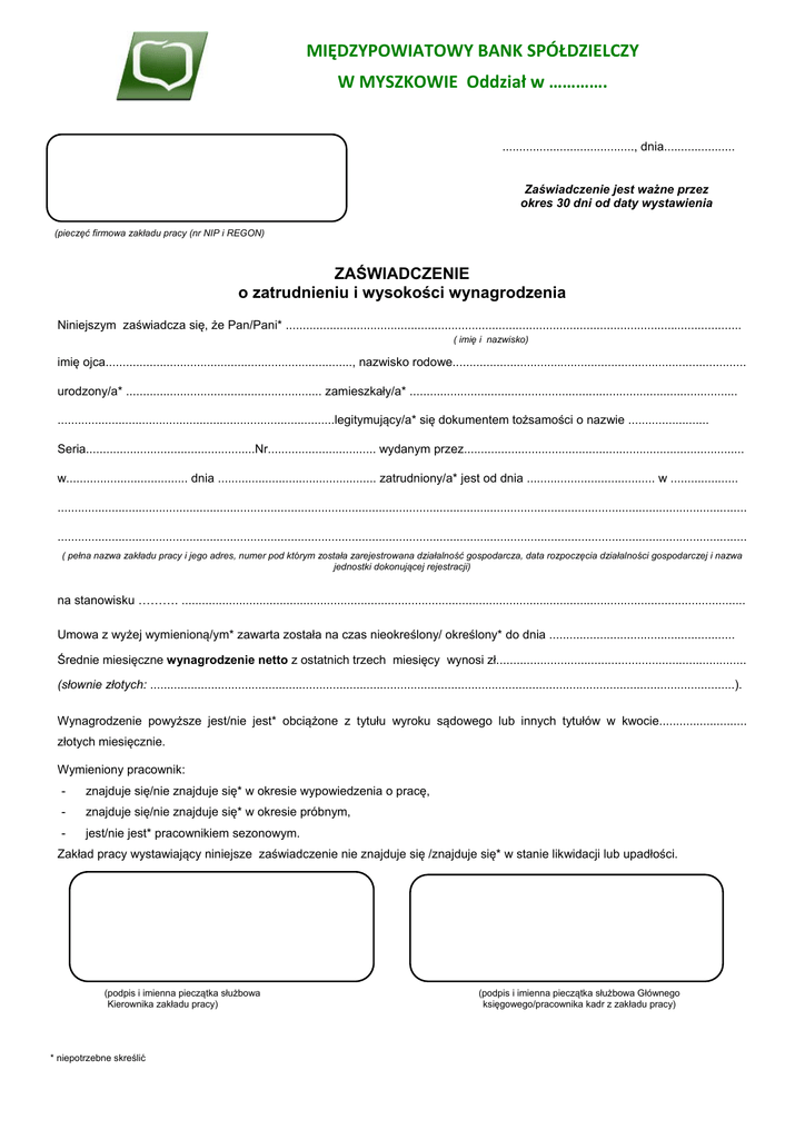 MIĘDZYPOWIATOWY BANK SPÓŁDZIELCZY W MYSZKOWIE Oddział w …………. ......................................., dnia..................... Zaświadczenie jest ważne przez okres 30 dni od daty wystawienia (pieczęć firmowa zakładu pracy (nr NIP i REGON) ZAŚWIADCZENIE o zatrudnieniu i wysokości wynagrodzenia Niniejszym zaświadcza się, że Pan/Pani* ....................................................................................................................................... ( imię i nazwisko) imię ojca........................................................................., nazwisko rodowe....................................................................................... urodzony/a* .......................................................... zamieszkały/a* ................................................................................................. ..................................................................................legitymujący/a* się dokumentem tożsamości o nazwie ........................ Seria..................................................Nr................................ wydanym przez................................................................................... w.................................... dnia ............................................... zatrudniony/a* jest od dnia ...................................... w .................... ............................................................................................................................................................................................................ ............................................................................................................................................................................................................ ( pełna nazwa zakładu pracy i jego adres, numer pod którym została zarejestrowana działalność gospodarcza, data rozpoczęcia działalności gospodarczej i nazwa jednostki dokonującej rejestracji) na stanowisku ………. ....................................................................................................................................................................... Umowa z wyżej wymienioną/ym* zawarta została na czas nieokreślony/ określony* do dnia ....................................................... Średnie miesięczne wynagrodzenie netto z ostatnich trzech miesięcy wynosi zł.......................................................................... (słownie złotych: .............................................................................................................................................................................). Wynagrodzenie powyższe jest/nie jest* obciążone z tytułu wyroku sądowego lub innych tytułów w kwocie.......................... złotych miesięcznie. Wymieniony pracownik: - znajduje się/nie znajduje się* w okresie wypowiedzenia o pracę, - znajduje się/nie znajduje się* w okresie próbnym, - jest/nie jest* pracownikiem sezonowym. Zakład pracy wystawiający niniejsze zaświadczenie nie znajduje się /znajduje się* w stanie likwidacji lub upadłości. \ (podpis i imienna pieczątka służbowa Kierownika zakładu pracy) * niepotrzebne skreślić (podpis i imienna pieczątka służbowa Głównego księgowego/pracownika kadr z zakładu pracy)