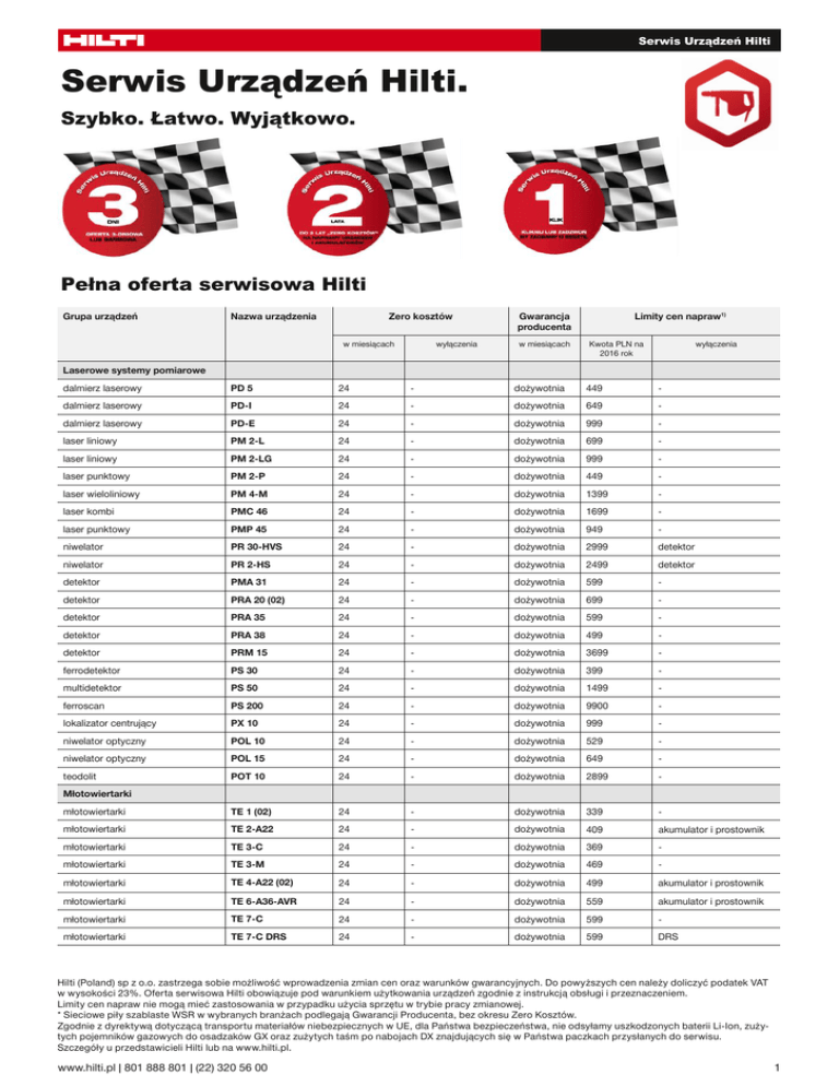Serwis Urządzeń Hilti Serwis Urządzeń Hilti. Szybko. Łatwo. Wyjątkowo. Pełna oferta serwisowa Hilti Grupa urządzeń Nazwa urządzenia Zero kosztów w miesiącach wyłączenia Gwarancja producenta w miesiącach Limity cen napraw1) Kwota PLN na 2016 rok wyłączenia Laserowe systemy pomiarowe dalmierz laserowy PD 5 24 - dożywotnia 449 - dalmierz laserowy PD-I 24 - dożywotnia 649 - dalmierz laserowy PD-E 24 - dożywotnia 999 - laser liniowy PM 2-L 24 - dożywotnia 699 - laser liniowy PM 2-LG 24 - dożywotnia 999 - laser punktowy PM 2-P 24 - dożywotnia 449 - laser wieloliniowy PM 4-M 24 - dożywotnia 1399 - laser kombi PMC 46 24 - dożywotnia 1699 - laser punktowy PMP 45 24 - dożywotnia 949 - niwelator PR 30-HVS 24 - dożywotnia 2999 detektor niwelator PR 2-HS 24 - dożywotnia 2499 detektor detektor PMA 31 24 - dożywotnia 599 - detektor PRA 20 (02) 24 - dożywotnia 699 - detektor PRA 35 24 - dożywotnia 599 - detektor PRA 38 24 - dożywotnia 499 - detektor PRM 15 24 - dożywotnia 3699 - ferrodetektor PS 30 24 - dożywotnia 399 - multidetektor PS 50 24 - dożywotnia 1499 - ferroscan PS 200 24 - dożywotnia 9900 - lokalizator centrujący PX 10 24 - dożywotnia 999 - niwelator optyczny POL 10 24 - dożywotnia 529 - niwelator optyczny POL 15 24 - dożywotnia 649 - teodolit POT 10 24 - dożywotnia 2899 - młotowiertarki TE 1 (02) 24 - dożywotnia 339 - młotowiertarki TE 2-A22 24 - dożywotnia 409 akumulator i prostownik młotowiertarki TE 3-C 24 - dożywotnia 369 - młotowiertarki TE 3-M 24 - dożywotnia 469 - młotowiertarki TE 4-A22 (02) 24 - dożywotnia 499 akumulator i prostownik młotowiertarki TE 6-A36-AVR 24 - dożywotnia 559 akumulator i prostownik młotowiertarki TE 7-C 24 - dożywotnia 599 - młotowiertarki TE 7-C DRS 24 - dożywotnia 599 DRS Młotowiertarki Hilti (Poland) sp z o.o. zastrzega sobie możliwość wprowadzenia zmian cen oraz warunków gwarancyjnych. Do powyższych cen należy doliczyć podatek VAT w wysokości 23%. Oferta serwisowa Hilti obowiązuje pod warunkiem użytkowania urządzeń zgodnie z instrukcją obsługi i przeznaczeniem. Limity cen napraw nie mogą mieć zastosowania w przypadku użycia sprzętu w trybie pracy zmianowej. * Sieciowe piły szablaste WSR w wybranych branżach podlegają Gwarancji Producenta, bez okresu Zero Kosztów. Zgodnie z dyrektywą dotyczącą transportu materiałów niebezpiecznych w UE, dla Państwa bezpieczeństwa, nie odsyłamy uszkodzonych baterii Li-Ion, zużytych pojemników gazowych do osadzaków GX oraz zużytych taśm po nabojach DX znajdujących się w Państwa paczkach przysłanych do serwisu. Szczegóły u przedstawicieli Hilti lub na www.hilti.pl. www.hilti.pl | 801 888 801 | (22) 320 56 00 1 Serwis na całe życie Grupa urządzeń Nazwa urządzenia Zero kosztów w miesiącach wyłączenia Gwarancja producenta w miesiącach Limity cen napraw1) Kwota PLN na 2016 rok wyłączenia młotowiertarki DRS-6-A - - dożywotnia 499 - młotowiertarki DRS-M - - dożywotnia 499 - młoty kombi TE 30-A36 24 - dożywotnia 749 akumulator i prostownik młoty kombi TE 30 24 - dożywotnia 689 - młoty kombi TE 30-C-AVR 24 - dożywotnia 749 - młoty kombi TE 30-M-AVR 24 - dożywotnia 799 - młoty kombi TE 50 24 - dożywotnia 1149 - młoty kombi TE 60 (03) 24 - dożywotnia 1249 - młoty kombi TE 60-ATC (03) 24 - dożywotnia 1249 - młoty kombi TE 70-AVR (03) 24 - dożywotnia 1599 - młoty kombi TE 70-ATC/AVR (03) 24 - dożywotnia 1649 - młoty kujące TE 300-AVR 24 - dożywotnia 749 - młoty kujące TE 500-AVR 24 - dożywotnia 1049 - młoty kujące TE 700-AVR 24 - dożywotnia 1299 - młoty kujące TE 800-AVR 24 - dożywotnia 1499 - młoty wyburzeniowe TE 1000-AVR (02) 24 kabel zasilający dożywotnia 1549 kabel zasilający młoty wyburzeniowe TE 1500-AVR 24 - dożywotnia 1649 - młoty wyburzeniowe TE 3000-AVR 24 kabel zasilający, wózek transportowy dożywotnia 2549 kabel zasilający, wózek transportowy wiercenie i cięcie diamentowe DC SE20 24 - dożywotnia 1249 - wiercenie i cięcie diamentowe DD 110-W 24 - dożywotnia 1549 - wiercenie i cięcie diamentowe DD 120 24 - dożywotnia 1649 - wiercenie i cięcie diamentowe DD 150-U 24 - dożywotnia 1799 - wiercenie i cięcie diamentowe DD 160 (02) 24 - dożywotnia 1899 - wiercenie i cięcie diamentowe DD 250 24 - dożywotnia 2999 - wiercenie i cięcie diamentowe DD 350-CA 24 lub 200h - dożywotnia 4499 - wiercenie i cięcie diamentowe DD 500-CA 24 lub 200h - dożywotnia 4999 - wiercenie i cięcie diamentowe DD 750-HY 24 lub 200h - dożywotnia - - wiercenie i cięcie diamentowe DD EC-1 24 - dożywotnia 1999 - wiercenie i cięcie diamentowe DD REC-1 24 filtry dożywotnia 1999 - wiercenie i cięcie diamentowe DD VP-U 24 filtry dożywotnia 1099 - wiercenie i cięcie diamentowe DPC 20 24 - dożywotnia 1099 - wiercenie i cięcie diamentowe DD-HD 24 - dożywotnia 1999 - wiercenie i cięcie diamentowe DD-ST 120 24 - dożywotnia 999 - wiercenie i cięcie diamentowe DD-ST 130 24 - dożywotnia 999 - wiercenie i cięcie diamentowe DD-ST 150-U 24 - dożywotnia 999 - wiercenie i cięcie diamentowe DD-ST 160 24 - dożywotnia 999 - wiercenie i cięcie diamentowe DG 150 24 - dożywotnia 1899 - wiercenie i cięcie diamentowe DSH 700 12 świeca, linka rozrusznika, fitr powietrza, filtr paliwa dożywotnia 1449 świeca, linka rozrusznika, fitr powietrza, filtr paliwa wiercenie i cięcie diamentowe DSH 900 12 świeca, linka rozrusznika, fitr powietrza, filtr paliwa dożywotnia 1649 świeca, linka rozrusznika, fitr powietrza, filtr paliwa wiercenie i cięcie diamentowe DSH-FSC 12 - dożywotnia 899 - wiercenie i cięcie diamentowe DCH 180-SL 24 - dożywotnia 1299 - Młoty Wiercenie i cięcie diamentowe Hilti (Poland) sp z o.o. zastrzega sobie możliwość wprowadzenia zmian cen oraz warunków gwarancyjnych. Do powyższych cen należy doliczyć podatek VAT w wysokości 23%. Oferta serwisowa Hilti obowiązuje pod warunkiem użytkowania urządzeń zgodnie z instrukcją obsługi i przeznaczeniem. Limity cen napraw