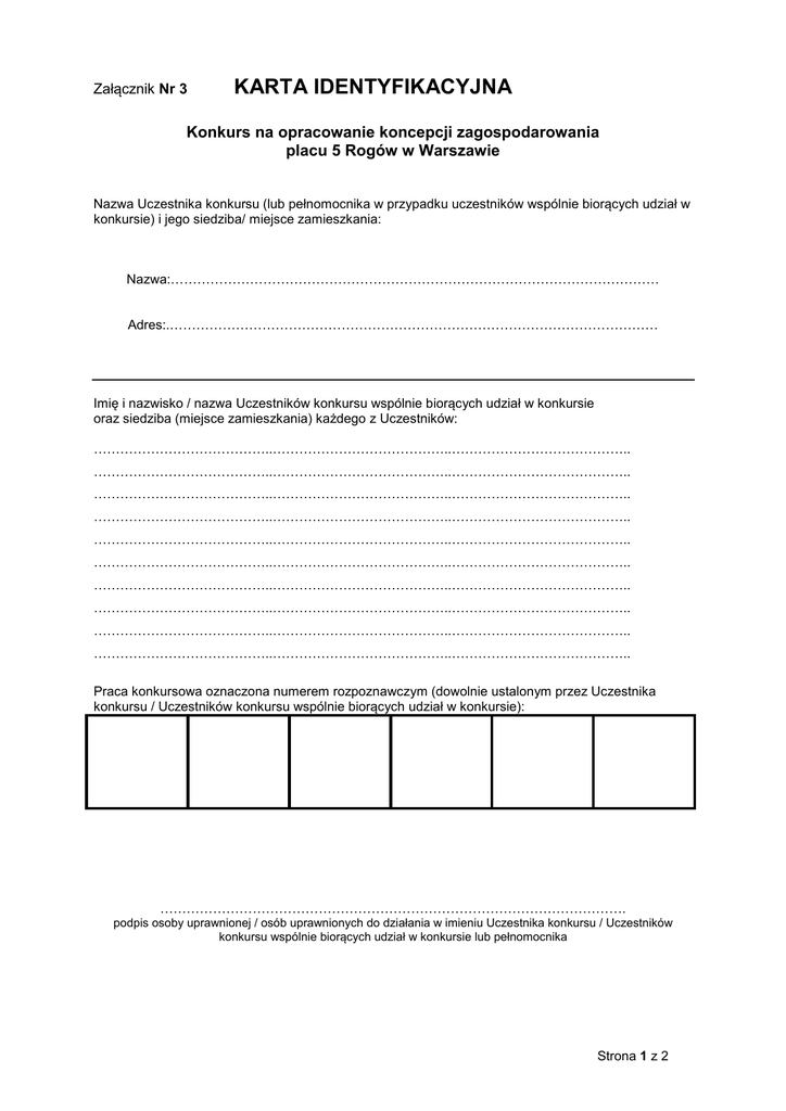 Załącznik Nr 3 KARTA IDENTYFIKACYJNA Konkurs na opracowanie koncepcji zagospodarowania placu 5 Rogów w Warszawie Nazwa Uczestnika konkursu (lub pełnomocnika w przypadku uczestników wspólnie biorących udział w konkursie) i jego siedziba/ miejsce zamieszkania: Nazwa:………………………………………………………………………………………………… Adres:.………………………………………………………………………………………………… Imię i nazwisko / nazwa Uczestników konkursu wspólnie biorących udział w konkursie oraz siedziba (miejsce zamieszkania) każdego z Uczestników: …………………………………..…………………………………..………………………………….. …………………………………..…………………………………..………………………………….. …………………………………..…………………………………..………………………………….. …………………………………..…………………………………..………………………………….. …………………………………..…………………………………..………………………………….. …………………………………..…………………………………..………………………………….. …………………………………..…………………………………..………………………………….. …………………………………..…………………………………..………………………………….. …………………………………..…………………………………..………………………………….. …………………………………..…………………………………..………………………………….. Praca konkursowa oznaczona numerem rozpoznawczym (dowolnie ustalonym przez Uczestnika konkursu / Uczestników konkursu wspólnie biorących udział w konkursie): ……………………………………………………………………………………………. podpis osoby uprawnionej / osób uprawnionych do działania w imieniu Uczestnika konkursu / Uczestników konkursu wspólnie biorących udział w konkursie lub pełnomocnika Strona 1 z 2 Formularz A do Załącznika Nr 3 Konkurs na opracowanie koncepcji zagospodarowania placu 5 Rogów w Warszawie Uczestnik konkursu, w trakcie wykonywania pracy konkursowej, może zaprosić do zespołu autorskiego dodatkowe osoby, jednakże osobom tym nie przysługuje status Uczestnika konkursu. Uczestnik konkursu może wymienić dodatkowe osoby będące członkami zespołu autorskiego i biorące merytoryczny udział w przygotowaniu pracy konkursowej w poniższej tabeli: Imię i nazwisko Specjalność Adres zamieszkania nr telefonu, e-mail Podpis członka zespołu ……………………………………………………………………………………………. podpis osoby uprawnionej / osób uprawnionych do działania w imieniu Uczestnika konkursu / Uczestników konkursu wspólnie biorących udział w konkursie lub pełnomocnika Strona 2 z 2