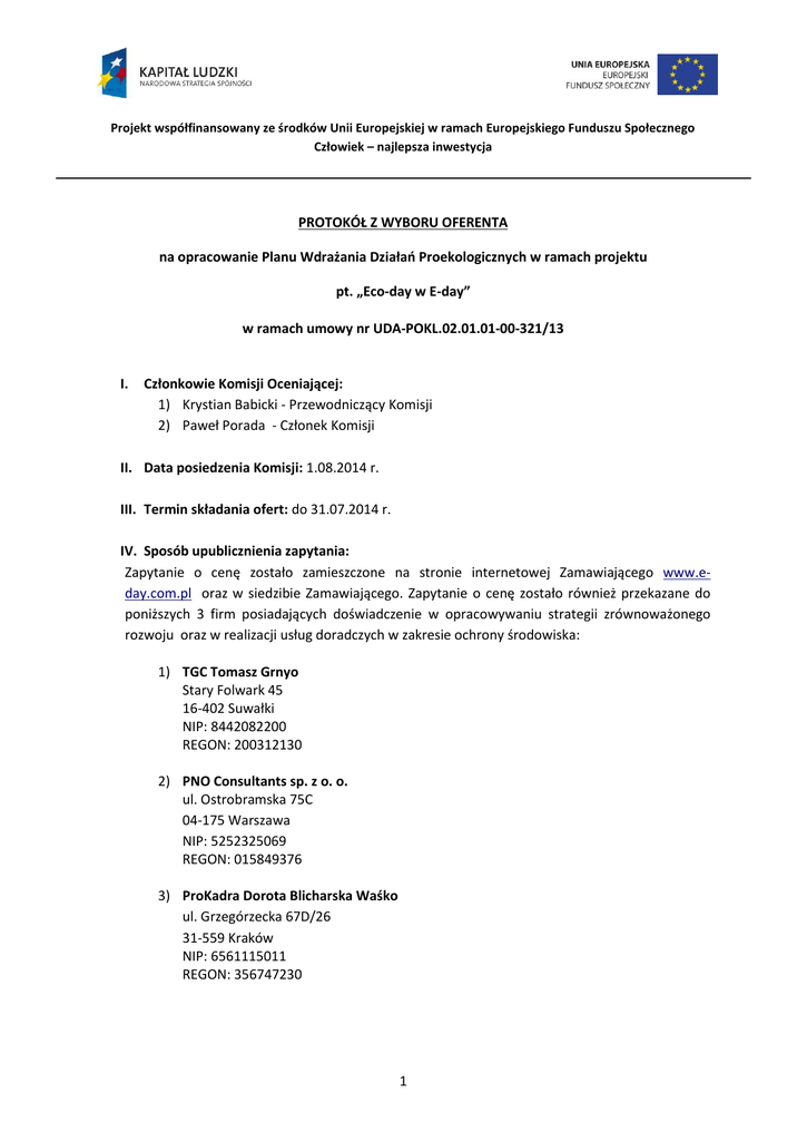 Projekt współfinansowany ze środków Unii Europejskiej w ramach Europejskiego Funduszu Społecznego Człowiek – najlepsza inwestycja PROTOKÓŁ Z WYBORU OFERENTA na opracowanie Planu Wdrażania Działań Proekologicznych w ramach projektu pt. „Eco-day w E-day” w ramach umowy nr UDA-POKL.02.01.01-00-321/13 I. Członkowie Komisji Oceniającej: 1) Krystian Babicki - Przewodniczący Komisji 2) Paweł Porada - Członek Komisji II. Data posiedzenia Komisji: 1.08.2014 r. III. Termin składania ofert: do 31.07.2014 r. IV. Sposób upublicznienia zapytania: Zapytanie o cenę zostało zamieszczone na stronie internetowej Zamawiającego www.eday.com.pl oraz w siedzibie Zamawiającego. Zapytanie o cenę zostało również przekazane do poniższych 3 firm posiadających doświadczenie w opracowywaniu strategii zrównoważonego rozwoju oraz w realizacji usług doradczych w zakresie ochrony środowiska: 1) TGC Tomasz Grnyo Stary Folwark 45 16-402 Suwałki NIP: 8442082200 REGON: 200312130 2) PNO Consultants sp. z o. o. ul. Ostrobramska 75C 04-175 Warszawa NIP: 5252325069 REGON: 015849376 3) ProKadra Dorota Blicharska Waśko ul. Grzegórzecka 67D/26 31-559 Kraków NIP: 6561115011 REGON: 356747230 1 Projekt współfinansowany ze środków Unii Europejskiej w ramach Europejskiego Funduszu Społecznego Człowiek – najlepsza inwestycja V. Otrzymane oferty Zgodnie z zapytaniem o cenę, termin składania ofert upłynął dnia 31 lipca 2014. Do tego czasu do firmy E-day wpłynęły 3 oferty od następujących firm: 1) PNO Consultants sp. z o. o. - (oferta z dnia 17.07.2014 złożona dnia 21.07.2014 - oferta poprawna pod względem formalnym) 2) TGC Tomasz Grnyo - (oferta z dnia 22.07.2014 złożona dnia 24.07.2014 - oferta poprawna pod względem formalnym) 3) ProKadra Dorota Blicharska Waśko - (oferta z dnia 28.07.2014 złożona dnia 30.07.2014 - oferta poprawna pod względem formalnym) VI. Wybór Doradcy Otrzymane oferty zostały uszeregowane od najmniej korzystnej do najbardziej korzystnej pod względem ceny NETTO zaproponowanej w ofercie. 1) PNO Consultants sp. z o. o. - 16 200 zł netto 2) ProKadra Dorota Blicharska Waśko - 15 700 zł netto 3) TGC Tomasz Grnyo - 15 000 zł netto Niniejszym, na podstawie porównania cen netto za przeprowadzenie kompleksowej usługi doradczej w ramach projektu Komisja rekomenduje do podpisania umowy firmę: TGC Tomasz Grnyo, Która zaoferowała najniższą cenę. Podpis Przewodniczącego Komisji: Podpis Członka Komisji: -------------------------------------------- --------------------------------------------------- 2 Projekt współfinansowany ze środków Unii Europejskiej w ramach Europejskiego Funduszu Społecznego Człowiek – najlepsza inwestycja Gliwice, dnia 1.08.2014 OŚWIADCZENIE O BRAKU POWIĄZAŃ Z WYKONAWCĄ Oświadczam, że nie łączą mnie z wykonawcami, którzy złożyli oferty, powiązania kapitałowe lub osobowe, polegające w szczególności na: 1) uczestniczeniu w spółce jako wspólnik spółki cywilnej lub spółki osobowej; 2) posiadaniu udziałów lub co najmniej 5 % akcji; 3) pełnieniu funkcji członka organu nadzorczego lub zarządzającego, prokurenta, pełnomocnika; 4) pozostawaniu w takim stosunku prawnym lub faktycznym, który może budzić uzasadnione wątpliwości, co do bezstronności w wyborze wykonawcy, w szczególności pozostawanie w związku małżeńskim, w stosunku pokrewieństwa lub powinowactwa w linii prostej, pokrewieństwa lub powinowactwa w linii bocznej do drugiego stopnia lub w stosunku przysposobienia, opieki lub kurateli. ………………………………………………………………..………….. (czytelny podpis) 3