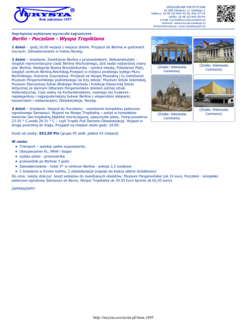 SPÓŁDZIELNIA TURYSTYCZNA 32-600 Oświęcim, ul. Solskiego 2 telefony: (0 48 33) 842-43-76, 842-27-19 tel/fax: (0 48 33) 842-59-94 e-mail: [email protected] Internet: www.turysta.oswiecim.pl Portal internetowy: www.nawakacje24.pl Berlin - Poczdam - Wyspa Tropiklana 1 dzień - godz.16.00 wyjazd z miejsca zbiórki. Przyjazd do Berlina w godzinach nocnych. Zakwaterowanie w hotelu.Nocleg. 2 dzień – śniadanie. Zwiedzanie Berlina z przewodnikiem. Aleksanderplatz niegdyś reprezentacyjna część Berlina Wschodniego, dziś nadal najbardziej znany plac Berlina. Następnie Brama Brandenburska - symbol miasta, Potsdamer Platz, niegdyś centrum Berlina,Reichstag.Przejazd w miejscu przebiegu byłego Muru Berlińskiego, Kolumna Zwycięstwa. Przejazd na Wyspę Muzealną i tu zwiedzanie Muzeum Pergamońskiego podzielonego na trzy sekcje: Muzeum Sztuki Islamskiej, Muzeum Starożytnej Sztuki Bliskiego Wschodu i Kolekcję Klasycznej Sztuki Antycznej ze słynnym Ołtarzem Pergamońskim dziełem późnej sztuki hellenistycznej. Czas wolny na Kurfurstendamm, zwanego też Kudamm najelegantszy i najpopularniejszy bulwar Berlina z eleganckimi sklepami, kawiarniami i restauracjami. Obiadokolacja. Nocleg. 3 dzień – śniadanie. Wyjazd do Poczdamu - zwiedzanie kompleksu pałacowoogrodowego Sanssouci. Wyjazd na Wyspę Tropikalną – pobyt w kompleksie basenów (las tropikalny,błękitne morze,laguny, piaszczyste plaże, Temp.powietrza 23-25 ° C,woda 28-31 ° C – czyli Tropiki Pod Dachem.Obiadokolacja. Wyjazd w drogę powrotną do Kraju. Przyjazd na miejsce około godz. 24.00. (Źródło: Wikimedia Commons) (Źródło: Wikimedia Commons) (Źródło: Wikimedia Commons) (Źródło: Wikimedia Commons) Koszt od osoby: 652,00 Pln (grupa 45 osób ,płatne 43 miejsca) W cenie: Transport – autokar pełne wyposażenie, Ubezpieczenie KL, NNW i bagaż opieka pilota - przewodnika przewodnik po Berlinie 3 godz. Zakwaterowanie - hotel 3* w centrum Berlina - pokoje 2,3 osobowe 2 śniadania w formie bufetu, 2 obiadokolacje (napoje do kolacji płatne dodatkowo) Do ceny należy doliczyć koszt wstepów do zwiedzanych obiektów: Muzeum Pergamońskie (ok.14 euro, Poczdam - kompleks pałacowo-ogrodowy Sanssouci ok 8euro, Wyspa Tropikalna ok 34.50 Euro łącznie ok.65,50 euro). ZAPRASZAMY! http://turysta.oswiecim.pl/item,1895