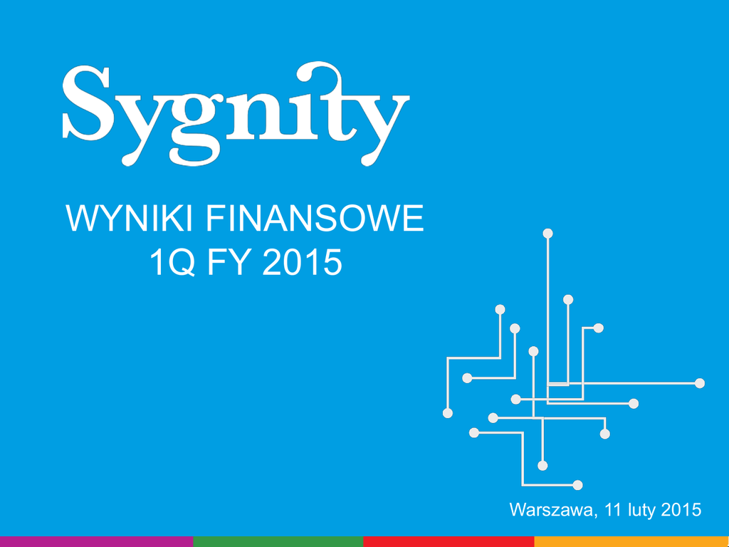 WYNIKI FINANSOWE 1Q FY 2015 Warszawa, 11 luty 2015 ZASTRZEŻENIA PRAWNE Niniejsza prezentacja nie stanowi oferty sprzedaży jakichkolwiek papierów wartościowych Spółki Sygnity S.A. (“Spółka”), w szczególności nie zawiera informacji o papierach wartościowych oraz warunkach ich nabywania, jak również nie stanowi zaproszenia do sprzedaży papierów wartościowych, składania ofert ich nabycia lub zapisu na papiery wartościowe Spółki. Niniejsza prezentacja ani żadna jej część jak też fakt jej dystrybucji nie będą stanowić podstawy do zawarcia jakiejkolwiek umowy lub zaciągnięcia jakiegokolwiek zobowiązania. Nie stanowi ona też źródła informacji, które mogłyby być podstawą decyzji o zawarciu jakiejkolwiek umowy lub zaciągnięciu jakiegokolwiek zobowiązania. Nie należy dla jakichkolwiek potrzeb polegać na informacjach zawartych w niniejszej prezentacji, ani też zakładać, że informacje te są kompletne, ścisłe lub rzetelne. Wszelkie takie założenia czynione są wyłącznie na własne ryzyko. Ani Spółka, ani osoby działające w jej imieniu, w szczególności członkowie Zarządu Spółki, ani jakiekolwiek inne osoby nie udzieliły żadnych wyraźnych ani dorozumianych gwarancji ani zapewnień co do ścisłości, kompletności lub rzetelności informacji bądź opinii zawartych w niniejszej prezentacji. Oświadczenia zawarte w niniejszej prezentacji, które nie stanowią faktów historycznych są „oświadczeniami dotyczącymi przyszłości”. Oświadczenia dotyczące przyszłości, w szczególności takich jak przewidywania co do przychodów z określonych rynków czy rozważania dotyczące rozwoju Spółki jej podmiotów zależnych oraz podmiotów stowarzyszonych i powiązanych („Grupa Kapitałowa”), nie należy traktować jako wiążących prognoz. Ani Spółka, ani osoby działające w jej imieniu, w szczególności członkowie Zarządu Spółki, ani jakiekolwiek inne osoby nie udzielają zapewnienia, że przewidywania dotyczące przyszłości zostaną spełnione, w szczególności nie gwarantują zgodności przyszłych wyników lub wydarzeń z tymi oświadczeniami jak również tego, że przyszłe wyniki Grupy Kapitałowej nie będą się istotnie różnić od przewidywanych. Informacje zamieszczone w niniejszej prezentacji mogą ulegać istotnym zmianom. Ani Spółka ani żadna inna osoba nie ma obowiązku aktualizowania lub dbania o aktualność informacji zawartych w niniejszej prezentacji ani też poprawiania jakichkolwiek ewentualnych nieścisłości; wszelkie wyrażone w niniejszej prezentacji opinie mogą ulec zmianie bez uprzedzenia. Ani Spółka, ani jakikolwiek członek jej organów, pracownik wyższego lub niższego szczebla, ani też jakakolwiek inna osoba nie ponosi jakiejkolwiek odpowiedzialności z tytułu jakichkolwiek szkód wynikających z wykorzystania niniejszej prezentacji lub jej treści. Poprzez udział w niniejszej prezentacji lub przyjęcie kopii niniejszego dokumentu, zobowiązują się Państwo do przestrzegania wspomnianych wyżej ograniczeń i warunków. AGENDA Podsumowanie Działalność operacyjna Istotne projekty Wyniki finansowe za 1Q FY2015 PODSUMOWANIE KONSEKWENTNA BUDOWA WARTOŚCI DWA LATA (9 KOLEJNYCH KWARTAŁÓW) Z POZYTYWNYM WYNIKIEM FINANSOWYM W 1Q FY 2015: Przychody 144,1 mln PLN marża operacyjna na poziomie 4,9% (7,0 mln PLN) marża EBITDA na poziomie 7,6% (10,9 mln PLN) marża netto na poziomie 2,9% (4,1 mln PLN) ZWIĘKSZONY UDZIAŁ SEGMENTU UTILITIES I BANKOWO-FINANSOWEGO W STRUKTURZE SPRZEDAŻY, KTÓRA OSIĄGNĘŁA PORÓWNYWALNY POZIOM W UJĘCIU R/R AGENDA Podsumowanie Działalność operacyjna Istotne projekty Wyniki finansowe za 1Q FY2015 DZIAŁALNOŚĆ OPERACYJNA KONCENTRACJA NA KLUCZOWYCH PIONACH I PRODUKTACH 1QFY15 vs. 1QFY14 STRUKTURA SPRZEDAŻY STRUKTURA SPRZEDAŻY WG PIONÓW KLIENCKICH WG GRUP PRODUKTOWYCH ~ 92% 8% 14% sprzedaży w kluczowych pionach 35% 31% -1 p.p. r/r 1QFY 2015 13% 1QFY15 47% 26% 10% 22% + 11 p.p. r/r 14% 44% 1QFY14 24% Publiczny Utilities* 18% Bankowy Pozostałe 1QFY14 16% 52% Usługi wdrożeniowe Usługi serwisowe Sprzęt Licencje * Segment utilities od 1Q 2015 zawiera także obszar Obszar Biznesowy Rynek Paliw i Handel Detaliczny, dane historyczne przeliczone w formie porównywalnej 26% DZIAŁALNOŚĆ OPERACYJNA BACKLOG I ZABEZPIECZENIE PRZYCHODÓW ZABEZPIECZENIE PRZYCHODÓW (%)** i PORTFEL ZAMÓWIEŃ (mln PLN) 215 mln PLN 203 mln PLN 91% 75% -6% 70% FY14 FY15 61% 57% FY14 FY15 69% 99% FY14 FY15 68% FY14 FY15 portfel zamówień (backlog) : -2-4QFY15 - przychody wynikające z umów zawartych do 26.01.2015 -2-4QFY14 – przychody wynikające z umów zawartych do 26.01.2014 **zabezpieczenie przychodów na rok jako procent zrealizowanych przychodów roku poprzedniego - obejmuje sumę wykonania 1Q oraz backlogu na 2-4Q segment utilities od 1Q 2015 zawiera także Obszar Biznesowy Rynek Paliw i Handel Detaliczny, dane historyczne przeliczone w formie porównywalnej AGENDA Podsumowanie Działalność operacyjna Istotne projekty Wyniki finansowe za 1Q FY2015 KLUCZOWE SEGMENTY SYGNITY Sektor bankowy Sektor publiczny Sektor utilities Kontynuacja procesów konsolidacji rynku Rozliczanie budżetów inwestycyjnych 2014 Audyty KNFu związane z Rekomendacją D Nowe inicjatywy rozwojowe po zakończeniu procesów M&A Banki hipoteczne Do końca 2015 finalizacja projektów perspektywy 2007-2013 Przygotowanie wniosków nowej perspektywy 2014-2020 (w tym POPC 10 mld PLN) Prace przygotowawcze do uruchomienia projektów ICT w obszarze obronności Projekt pakietu ustaw energetycznych, Dyrektywy UE, Umowy ESCO Przetargi na nowe i modernizacje istniejących systemów bilingowych / CRM / MDM Zmiany na rynku energii i nowe podmioty : sprzedawcy energii elektrycznej i gazu AGENDA Podsumowanie Działalność operacyjna Istotne projekty Wyniki finansowe za 1Q FY2015 Wyniki finansowe za 1Q FY2015 WYNIKI FINANSOWE 1Q FY15 1Q FY14 144 054 25 715 17,9% 148 138 30 257 20,4% 7 000 4,9% 9 792 6,6% 