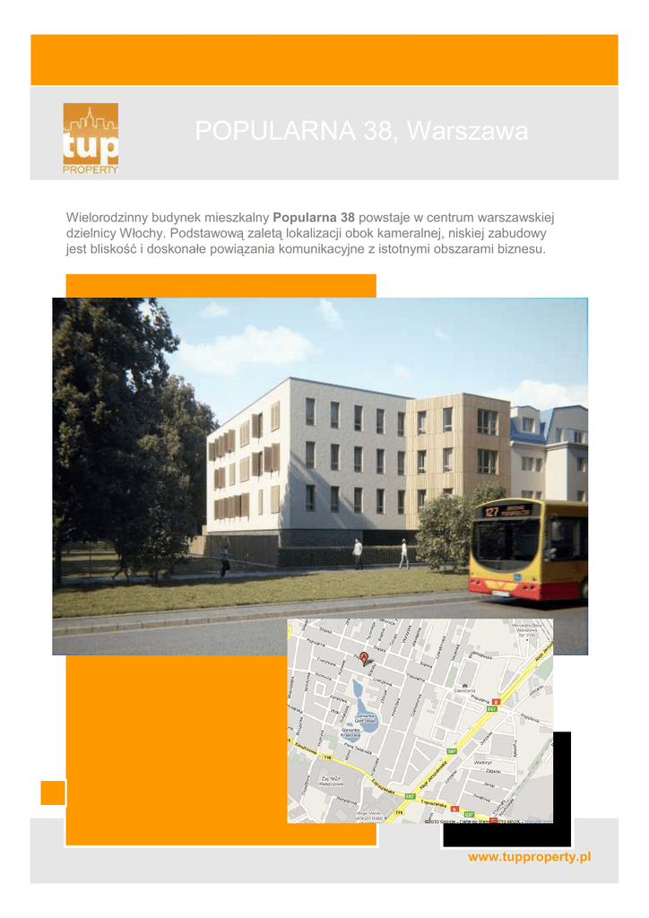 POPULARNA 38, Warszawa Wielorodzinny budynek mieszkalny Popularna 38 powstaje w centrum warszawskiej dzielnicy Włochy. Podstawową zaletą lokalizacji obok kameralnej, niskiej zabudowy jest bliskość i doskonałe powiązania komunikacyjne z istotnymi obszarami biznesu. www.tupproperty.pl OPIS INWESTYCJI Popularna 38 to kameralny budynek mieszkalny wznoszony w technologii tradycyjnej, z wykorzystaniem wysokiej jakości materiałów wykończeniowych. Mieszkania o metraŜach od 46 m2 do 83 m2 oferowane są w standardzie deweloperskim. Istnieje moŜliwość przygotowania mieszkań w wersji „pod klucz”, zgodnie z indywidualnym zapotrzebowaniem klienta. Budynek jest w pełni przystosowany do potrzeb osób niepełnosprawnych. www.tupproperty.pl OPIS INWESTYCJI W naziemnym parkingu zlokalizowanym na parterze budynku znajdzie się 14 miejsc postojowych oraz jedno, przeznaczone dla osoby niepełnosprawnej, na zewnątrz, bezpośrednio przy wejściu do budynku. Ponadto obiekt wyposaŜony będzie w wózkarnię oraz zadaszony parking dla rowerów. Na terenie nieruchomości przewidziano miejsce słuŜące mieszkańcom wspólnemu spędzaniu wolnego czasu na świeŜym powietrzu. Istnieje moŜliwość stworzenia recepcji oraz kontrolowanego dostępu do budynku. Struktura mieszkań jak teŜ lokalizacja inwestycji na mapie Warszawy stwarzają idealne warunki do oferowania lokali na cele wynajmu. www.tupproperty.pl WYPOSAśENIE BUDYNKU Budynek wyposaŜony będzie we wszystkie niezbędne instalacje takie jak: miejski wodociąg i kanalizację, kotłownię gazową oraz logotermy, pozwalające na ekonomiczne wykorzystanie instalacji grzewczej, trójfazowe zasilanie, okablowanie teletechniczne oraz videodomofony. Od strony ulicy Popularnej zaprojektowano okna o podwyŜszonej izolacji akustycznej, zaś elewacje południowa i zachodnia wyposaŜone są w okiennice. Podwójne ściany między lokalami zapewniają podniesiony komfort akustyczny w mieszkaniach. www.tupproperty.pl KOMUNIKACJA W pobliŜu znajdują się trasy wylotowe w kierunkach Katowice, Wrocław, Kraków, Łódź, Poznań. Powstające obecnie: węzeł Łopuszańska oraz południowa obwodnica Warszawy dodatkowo usprawnią komunikację na tym obszarze. www.tupproperty.pl INFRASTRUKTURA Potrzeby związane z aktywnym spędzaniem wolnego czasu zaspokaja połoŜony w odległości 6 minut jazdy samochodem Park Szczęśliwicki, posiadający doskonałą infrastrukturę rekreacyjną i sportową, w tym całoroczny stok narciarski, kompleks odkrytych basenów, ścieŜki zdrowia, place zabaw, trasy do jazdy na rolkach, liczne punkty gastronomiczne itd.). Ponadto na terenie Włoch funkcjonuje kilka kortów tenisowych oraz liczne boiska do gier zespołowych. W dzielnicy działa: 14 przedszkoli (w tym jedno anglojęzyczne Polish - Canadian Preschool, przy ul. Czereśniowej), 6 szkół podstawowych, 5 gimnazjów, oraz 3 szkoły średnie. www.tupproperty.pl LOKALIZACJA komunikacja Dworzec Centralny ……………………………………………………….…… 13 minut* Portu Lotniczy Okęcie ……………………………………………………..……12 minut biznes al. Jerozolimskie ………………………………………………………………… 7 minut działają tu przedstawicielstwa największych światowych koncernów, takich jak np.: Addidas, BASF, Bayer, Bosch, Era GSM, Fuji, LG, Mercedes – Benz, Microsoft, Philips, Renault, Siemens, Timex, Yamaha oraz wiele innych Służewiec Przemysłowy ………………………………………………………. 12 minut największy w Warszawie kompleks nowoczesnej powierzchni biurowej warszawska Wall Street ………………………………………………………. 11minut okolice Ronda Daszyńskiego oraz ulic Kasprzaka, Grzybowskiej, Towarowej i Prostej, dynamicznie rozwijająca się dzielnica biznesu w Warszawie czas wolny Reduta i Blue City - kompleksy handlowo-rozrywkowe ……………………...7 minut kompleks sportowo - rekreacyjny Okęcie (w budowie) …………………..… 8 minut •podany czas dojazdu liczony poza godzinami szczytu www.tupproperty.pl LOKALIZACJA www.tupproperty.pl INWESTOR TUP Property SA jest częścią Grupy TUP, na czele której stoi giełdowa firma inwestycyjna TUP SA. Spółka tworzy i realizuje projekty inwestycyjne, dysponuje bankiem ziemi o przeznaczeniu deweloperskim oraz zarządza portfelem nieruchomości komercyjnych na wynajem, w tym budynków handlowych, centrów logistycznych, magazynów i obiektów biurowych. W ramach optymalizacji posiadanego portfela spółka prowadzi równieŜ krótkoterminowe projekty deweloperskie. „Wykorzystujemy wizjonerskie rozwiązania i nowoczesne technologie. Nasze inwestycje biorą pod uwagę zarówno środowisko naturalne, jak i społeczne, w którym są realizowane. Misją TUP Property jest wypracowywanie zysku poprzez realizację projektów urbanistycznych, opartych na zasadach zrównowaŜonego rozwoju oraz odpowiedzialności społecznej. Zasada zrównowaŜonego rozwoju to dla nas filozofia i metoda działania.” Robert Jacek Moritz Prezes TUP Property SA www.tupproperty.pl KONTAKT sprzedaŜ mieszkań Anna Mitkowska kom. 504 23 62 36 tel. (22) 338 66 37 [email protected] Biuro handlowe: TUP Property SA 00-108 Warszawa ul. Zielna 37 Siedziba: TUP Property S.A. 60-792 Poznań ul. Wojskowa 4 Tel: (4822) 338 66 20 Fax: (4822) 730 89 55 NIP: 782-237-10-68 Tel: (4861) 882 49 30 Fax: (4861) 882 49 39 NIP: 782-237-10-68 www.tupproperty.pl