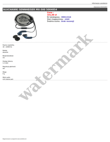 Informacje o produkcie Utworzono 03-03-2017 SŁUCHAWKI SENNHEISER MX-500 5004854 Cena : 101,00 zł er m ar k Nr katalogowy : 00011516 Stan magazynowy : niski Średnia ocena : brak recenzji Pasmo częstotliw. 18 - 22000 Hz Rodzaj douszne Bezprzewodowe nie Zasięg roboczy 1.2 metr Regulacja głośności tak Waga 9g w at Wtyk audio mini stereo jack Wygenerowano w programie www.oscGold.com