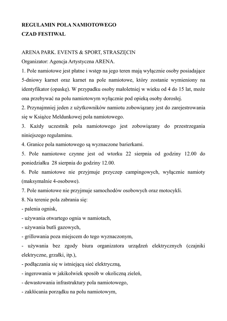 REGULAMIN POLA NAMIOTOWEGO CZAD FESTIWAL ARENA PARK. EVENTS & SPORT, STRASZĘCIN Organizator: Agencja Artystyczna ARENA. 1. Pole namiotowe jest płatne i wstęp na jego teren mają wyłącznie osoby posiadające 5-dniowy karnet oraz karnet na pole namiotowe, który zostanie wymieniony na identyfikator (opaskę). W przypadku osoby małoletniej w wieku od 4 do 15 lat, może ona przebywać na polu namiotowym wyłącznie pod opieką osoby dorosłej. 2. Przynajmniej jeden z użytkowników namiotu zobowiązany jest do zarejestrowania się w Książce Meldunkowej pola namiotowego. 3. Każdy uczestnik pola namiotowego jest zobowiązany do przestrzegania niniejszego regulaminu. 4. Granice pola namiotowego są wyznaczone barierkami. 5. Pole namiotowe czynne jest od wtorku 22 sierpnia od godziny 12.00 do poniedziałku 28 sierpnia do godziny 12.00. 6. Pole namiotowe nie przyjmuje przyczep campingowych, wyłącznie namioty (maksymalnie 4-osobowe). 7. Pole namiotowe nie przyjmuje samochodów osobowych oraz motocykli. 8. Na terenie pola zabrania się: - palenia ognisk, - używania otwartego ognia w namiotach, - używania butli gazowych, - grillowania poza miejscem do tego wyznaczonym, - używania bez zgody biura organizatora urządzeń elektrycznych (czajniki elektryczne, grzałki, itp.), - podłączania się w istniejącą sieć elektryczną, - ingerowania w jakikolwiek sposób w okoliczną zieleń, - dewastowania infrastruktury pola namiotowego, - zakłócania porządku na polu namiotowym, - zaśmiecania terenu pola namiotowego, - wnoszenia niebezpiecznych przedmiotów w tym broni, - wnoszenia alkoholu i środków odurzających, - wnoszenia opakowań szklanych i metalowych (puszki), - wprowadzania zwierząt na teren campingu. 9. Dozwolone jest wnoszenie jedzenia. 10. Osoby nie przestrzegające powyższego regulaminu zostaną wydalone poza teren pola namiotowego bez możliwości powrotu. 11. Organizator nie odpowiada za zagubione lub skradzione wartościowe przedmioty pozostawione w namiotach. 12. W razie jakichkolwiek uchybień lub spostrzeżonych zagrożeń wszystkie informacje kierować proszę do biura pola namiotowego lub ochrony. 13. Należy stosować się do zgodnych z prawem poleceń biura organizatora i ochrony. 14. Zabronione jest niszczenie i dewastowanie urządzeń na polu namiotowym oraz kopanie dołków i kanałów dookoła namiotów. W przypadku zaistnienia powyższego faktu, niezbędne jest przywrócenie stanu wyjściowego. Kosztami za ewentualne szkody organizator obciąży odpowiedzialne osoby według uznania. 15. Na terenie pola namiotowego do dyspozycji uczestników udostępniamy: - kabiny prysznicowe (płatne) - toalety, - umywalki, - płatne depozyty 16. Organizator zastrzega sobie prawo do zmiany regulaminu. Życzymy udanego wypoczynku. Dębica, 30.11.2016