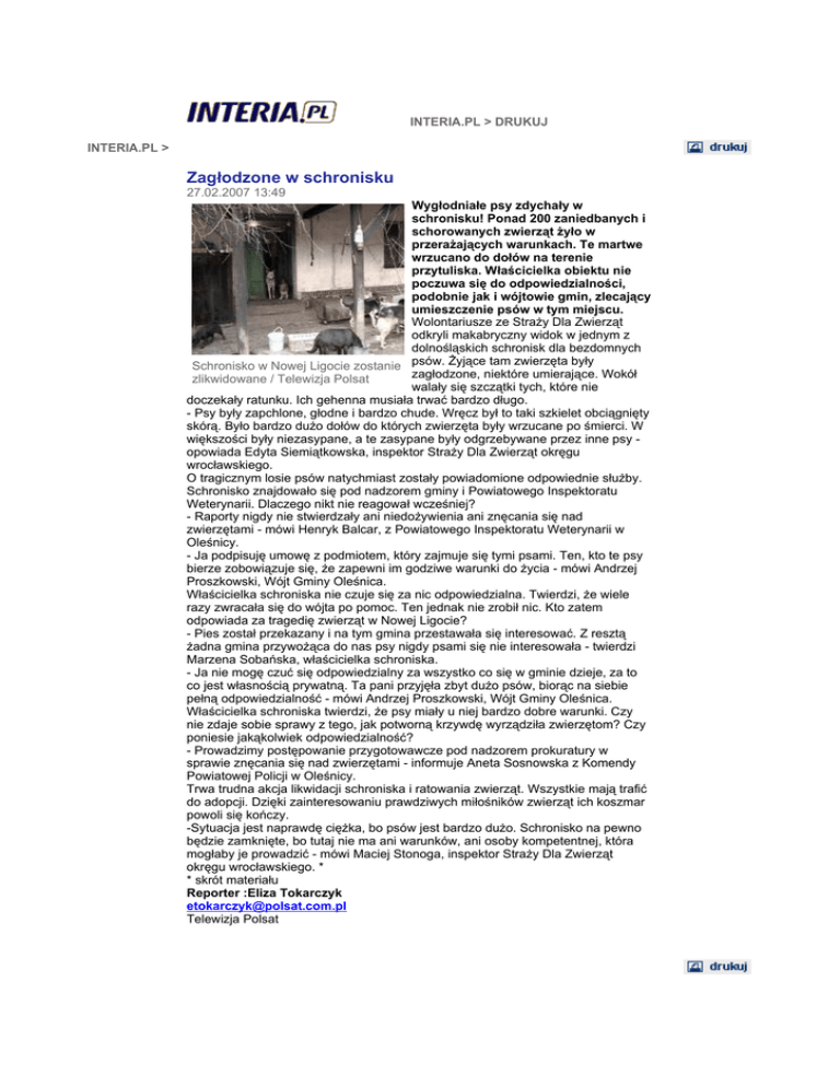 INTERIA.PL > DRUKUJ INTERIA.PL > Zagłodzone w schronisku 27.02.2007 13:49 Wygłodniałe psy zdychały w schronisku! Ponad 200 zaniedbanych i schorowanych zwierząt żyło w przerażających warunkach. Te martwe wrzucano do dołów na terenie przytuliska. Właścicielka obiektu nie poczuwa się do odpowiedzialności, podobnie jak i wójtowie gmin, zlecający umieszczenie psów w tym miejscu. Wolontariusze ze Straży Dla Zwierząt odkryli makabryczny widok w jednym z dolnośląskich schronisk dla bezdomnych Schronisko w Nowej Ligocie zostanie psów. Żyjące tam zwierzęta były zagłodzone, niektóre umierające. Wokół zlikwidowane / Telewizja Polsat walały się szczątki tych, które nie doczekały ratunku. Ich gehenna musiała trwać bardzo długo. - Psy były zapchlone, głodne i bardzo chude. Wręcz był to taki szkielet obciągnięty skórą. Było bardzo dużo dołów do których zwierzęta były wrzucane po śmierci. W większości były niezasypane, a te zasypane były odgrzebywane przez inne psy opowiada Edyta Siemiątkowska, inspektor Straży Dla Zwierząt okręgu wrocławskiego. O tragicznym losie psów natychmiast zostały powiadomione odpowiednie służby. Schronisko znajdowało się pod nadzorem gminy i Powiatowego Inspektoratu Weterynarii. Dlaczego nikt nie reagował wcześniej? - Raporty nigdy nie stwierdzały ani niedożywienia ani znęcania się nad zwierzętami - mówi Henryk Balcar, z Powiatowego Inspektoratu Weterynarii w Oleśnicy. - Ja podpisuję umowę z podmiotem, który zajmuje się tymi psami. Ten, kto te psy bierze zobowiązuje się, że zapewni im godziwe warunki do życia - mówi Andrzej Proszkowski, Wójt Gminy Oleśnica. Właścicielka schroniska nie czuje się za nic odpowiedzialna. Twierdzi, że wiele razy zwracała się do wójta po pomoc. Ten jednak nie zrobił nic. Kto zatem odpowiada za tragedię zwierząt w Nowej Ligocie? - Pies został przekazany i na tym gmina przestawała się interesować. Z resztą żadna gmina przywożąca do nas psy nigdy psami się nie interesowała - twierdzi Marzena Sobańska, właścicielka schroniska. - Ja nie mogę czuć się odpowiedzialny za wszystko co się w gminie dzieje, za to co jest własnością prywatną. Ta pani przyjęła zbyt dużo psów, biorąc na siebie pełną odpowiedzialność - mówi Andrzej Proszkowski, Wójt Gminy Oleśnica. Właścicielka schroniska twierdzi, że psy miały u niej bardzo dobre warunki. Czy nie zdaje sobie sprawy z tego, jak potworną krzywdę wyrządziła zwierzętom? Czy poniesie jakąkolwiek odpowiedzialność? - Prowadzimy postępowanie przygotowawcze pod nadzorem prokuratury w sprawie znęcania się nad zwierzętami - informuje Aneta Sosnowska z Komendy Powiatowej Policji w Oleśnicy. Trwa trudna akcja likwidacji schroniska i ratowania zwierząt. Wszystkie mają trafić do adopcji. Dzięki zainteresowaniu prawdziwych miłośników zwierząt ich koszmar powoli się kończy. -Sytuacja jest naprawdę ciężka, bo psów jest bardzo dużo. Schronisko na pewno będzie zamknięte, bo tutaj nie ma ani warunków, ani osoby kompetentnej, która mogłaby je prowadzić - mówi Maciej Stonoga, inspektor Straży Dla Zwierząt okręgu wrocławskiego. * * skrót materiału Reporter :Eliza Tokarczyk [email protected] Telewizja Polsat