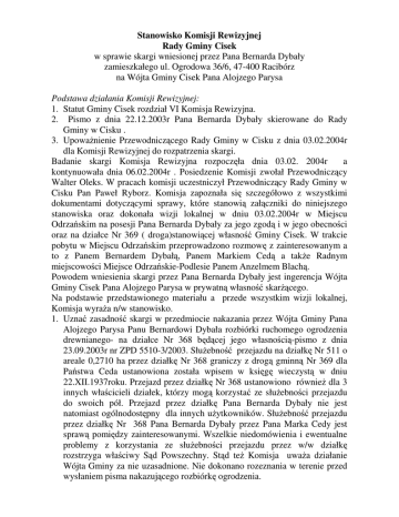 Stanowisko Komisji Rewizyjnej Rady Gminy Cisek w sprawie skargi wniesionej przez Pana Bernarda Dybały zamieszkałego ul. Ogrodowa 36/6, 47-400 Racibórz na Wójta Gminy Cisek Pana Alojzego Parysa Podstawa działania Komisji Rewizyjnej: 1. Statut Gminy Cisek rozdział VI Komisja Rewizyjna. 2. Pismo z dnia 22.12.2003r Pana Bernarda Dybały skierowane do Rady Gminy w Cisku . 3. Upowa nienie Przewodnicz cego Rady Gminy w Cisku z dnia 03.02.2004r dla Komisji Rewizyjnej do rozpatrzenia skargi. Badanie skargi Komisja Rewizyjna rozpocz ła dnia 03.02. 2004r a kontynuowała dnia 06.02.2004r . Posiedzenie Komisji zwołał Przewodnicz cy Walter Oleks. W pracach komisji uczestniczył Przewodnicz cy Rady Gminy w Cisku Pan Paweł Ryborz. Komisja zapoznała si szczegółowo z wszystkimi dokumentami dotycz cymi sprawy, które stanowi zał czniki do niniejszego stanowiska oraz dokonała wizji lokalnej w dniu 03.02.2004r w Miejscu Odrza skim na posesji Pana Bernarda Dybały za jego zgod i w jego obecno ci oraz na działce Nr 369 ( droga)stanowi cej własno Gminy Cisek. W trakcie pobytu w Miejscu Odrza skim przeprowadzono rozmow z zainteresowanym a to z Panem Bernardem Dybał , Panem Markiem Ced a tak e Radnym miejscowo ci Miejsce Odrza skie-Podlesie Panem Anzelmem Blach . Powodem wniesienia skargi przez Pana Bernarda Dybały jest ingerencja Wójta Gminy Cisek Pana Alojzego Parysa w prywatn własno skar cego. Na podstawie przedstawionego materiału a przede wszystkim wizji lokalnej, Komisja wyra a n/w stanowisko. 1. Uzna zasadno skargi w przedmiocie nakazania przez Wójta Gminy Pana Alojzego Parysa Panu Bernardowi Dybała rozbiórki ruchomego ogrodzenia drewnianego- na działce Nr 368 b d cej jego własno ci -pismo z dnia 23.09.2003r nr ZPD 5510-3/2003. Słu ebno przejazdu na działk Nr 511 o areale 0,2710 ha przez działk Nr 368 graniczy z drog gminn Nr 369 dla Pa stwa Ceda ustanowiona została wpisem w ksi g wieczyst w dniu 22.XII.1937roku. Przejazd przez działk Nr 368 ustanowiono równie dla 3 innych wła cicieli działek, którzy mog korzysta ze słu ebno ci przejazdu do swoich pół. Przejazd przez działk Pana Bernarda Dybały nie jest natomiast ogólnodost pny dla innych u ytkowników. Słu ebno przejazdu przez działk Nr 368 Pana Bernarda Dybały przez Pana Marka Cedy jest spraw pomi dzy zainteresowanymi. Wszelkie niedomówienia i ewentualne problemy z korzystania ze słu ebno ci przejazdu przez w/w działk rozstrzyga wła ciwy S d Powszechny. St d te Komisja uwa a działanie Wójta Gminy za nie uzasadnione. Nie dokonano rozeznania w terenie przed wysłaniem pisma nakazuj cego rozbiórk ogrodzenia. Nale y dokona sprostowania pisma ZPD-5510-3 z dnia 23.09.2003r. 2. Uzna niezasadno skargi w przedmiocie zwrotu od Gminy Cisek kwoty: 1.115,05zł z tytułu poniesionych kosztów wykonania pomiarów geodezyjnych. Pomiary zostały wykonane na zlecenie Pana Bernarda Dybały bez zachowania procedur okre lonych w ustawie : Prawo Geodezyjne i Kartograficzne . Przepisy tej e ustawy przewiduj mo liwo wszcz cia przez Wójta Gminy na wniosek zainteresowanej strony post powania administracyjnego, w sprawie rozgraniczenia nieruchomo ci nale cej do strony wnioskuj cej i nieruchomo ci s siednich. Pan Dybała wniosku takiego nie zło ył, a wi c poniesione przez niego koszty pomiarów geodezyjnych wykonanych poza procedur administracyjnego post powania o rozgraniczeniu nieruchomo ci nie mog obci a Gminy Cisek. Na tym prace zako czono . Tre stanowiska Komisja Rewizyjna przyj ła jednomy lnie 5 głosami obecnych na posiedzeniu członków. Do stanowiska doł cza si 11 n/w zał czników. 1.Pismo Kancelarii Adwokackiej skierowane do P.Cedy-07.08.2003r 2.Pismo P.Cedy do Wójta Gminy Cisek- 19.08.2003r 3.Pismo Wójta Gminy do P. Dybały-23.09.2003r 4.Pismo P.Dybała do Wójta Gminy Cisek- 20.12.2003r 5.Skarga P.Dybały na Wójta Gminy Cisek z dn.22.12.2003r 6.Pismo – odpowied Wójta Gminy Cisek na pismo z dn. 20.12.2003r 7.Pismo P.Dybały do Urz du Gminy Cisek – 19.01.2004r. 8.Ksero Faktury VAT 85/2003 za pomiary geodezyjne. 9. Mapka geodezyjna. 10.Wypis z ksi gi wieczystej NR 12266. 11. Upowa nienie Komisji Rewizyjnej do przeprowadzenia kontroli. Stanowisko sporz dzono w 3 jednobrzmi cych egzemplarzach z których otrzymuj : 1. Przewodnicz cy Rady Gminy 2. Wójt Gminy Cisek 3. Komisja Rewizyjna Podpisy członków Komisji: 1. Walter Oleks - Przewodnicz cy 2. Alojzy Ketzler - Z-ca Przewodnicz cego 3. Blana Lucja - Członek Komisji 4. Bustrycka Sylwia - -„5. Michalczyk Maria - -„-