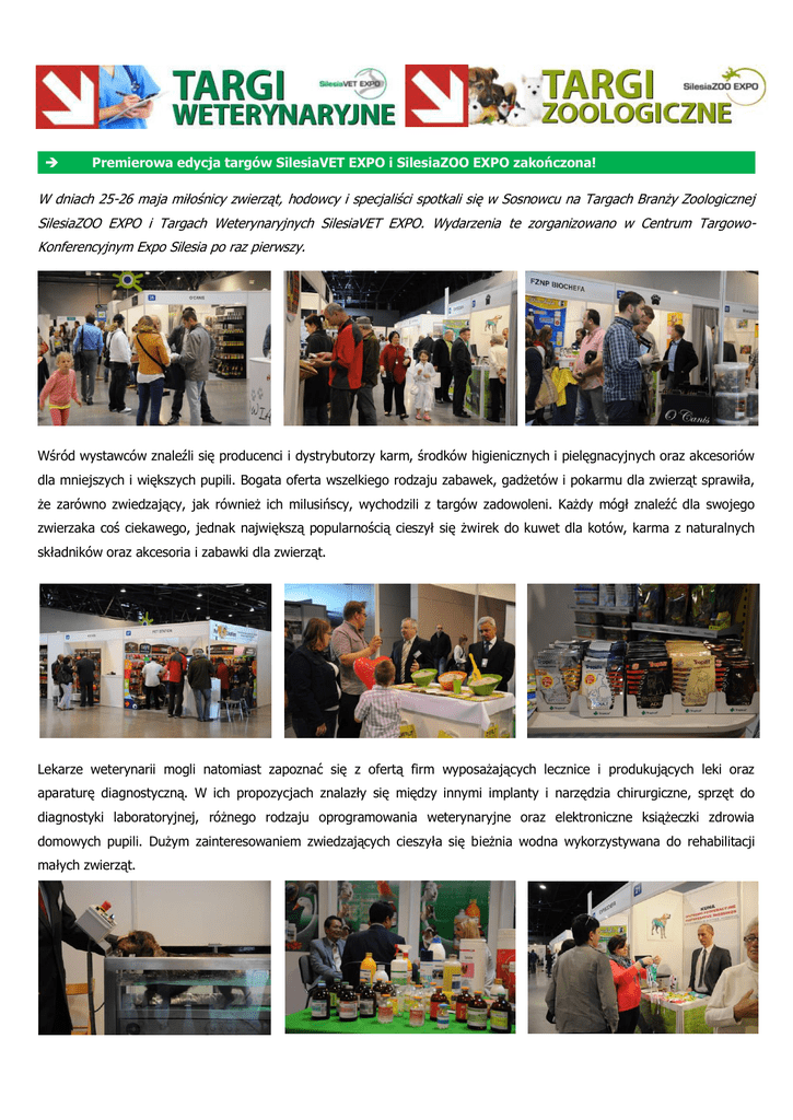 Premierowa edycja targów SilesiaVET EXPO i SilesiaZOO EXPO zakończona! W dniach 25-26 maja miłośnicy zwierząt, hodowcy i specjaliści spotkali się w Sosnowcu na Targach Branży Zoologicznej SilesiaZOO EXPO i Targach Weterynaryjnych SilesiaVET EXPO. Wydarzenia te zorganizowano w Centrum TargowoKonferencyjnym Expo Silesia po raz pierwszy. Wśród wystawców znaleźli się producenci i dystrybutorzy karm, środków higienicznych i pielęgnacyjnych oraz akcesoriów dla mniejszych i większych pupili. Bogata oferta wszelkiego rodzaju zabawek, gadżetów i pokarmu dla zwierząt sprawiła, że zarówno zwiedzający, jak również ich milusińscy, wychodzili z targów zadowoleni. Każdy mógł znaleźć dla swojego zwierzaka coś ciekawego, jednak największą popularnością cieszył się żwirek do kuwet dla kotów, karma z naturalnych składników oraz akcesoria i zabawki dla zwierząt. Lekarze weterynarii mogli natomiast zapoznać się z ofertą firm wyposażających lecznice i produkujących leki oraz aparaturę diagnostyczną. W ich propozycjach znalazły się między innymi implanty i narzędzia chirurgiczne, sprzęt do diagnostyki laboratoryjnej, różnego rodzaju oprogramowania weterynaryjne oraz elektroniczne książeczki zdrowia domowych pupili. Dużym zainteresowaniem zwiedzających cieszyła się bieżnia wodna wykorzystywana do rehabilitacji małych zwierząt. Na targach nie zabrakło także samych zwierząt. Zwiedzający mieli okazję obejrzeć rasowe świnki morskie oraz wybrać najpiękniejszą świnkę domową w konkursie zorganizowanym przez Stowarzyszenie Cavies Club of Poland. Można było zaprzyjaźnić się z ciekawskimi fretkami na stoisku Stowarzyszenia Przyjaciół Fretek, poznać Szanownego Pana Kota oraz zaadoptować psy ze schroniska w Sosnowcu i Rudzie Śląskiej. W programie wydarzeń towarzyszących znalazł się także pokaz groomerski i szkolenie dotyczące modelowania pudli i innych ras, spotkania z behawiorystą, a także cykl rozmów i wykładów na temat posiadania zwierząt, ich odżywiania i pielęgnacji oraz tego czym jest dom tymczasowy i dlaczego warto adoptować zwierzęta ze schroniska. W programie targów znalazł się również pokaz pracy psów asystujących, podczas którego zaprezentowano umiejętności czworonogów, które na co dzień pomagają osobom niepełnosprawnym w wielu czynnościach. Prezentację zorganizowała Fundacja DOGIQ we współpracy ze Związkiem Kynologicznym w Polsce Odział w Będzinie. Z kolei Katowicki Klub Jeździecki przygotował dla odwiedzających przejażdżki konne. Targi SilesiaZOO EXPO i SilesiaVET EXPO były świetną okazją do wymiany doświadczeń oraz zapoznania się z nowościami z branży zoologicznej i weterynaryjnej. Multimedia FOTOGALERIA RELACJA VIDEO MEDIA O TARGACH Dziękujemy Wystawcom i Partnerom za pomoc w realizacji tych wydarzeń!