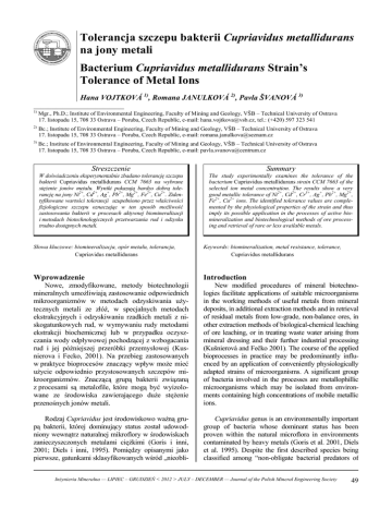 Tolerancja szczepu bakterii Cupriavidus metallidurans na jony metali Bacterium Cupriavidus metallidurans Strain’s Tolerance of Metal Ions Hana VOJTKOVÁ 1), Romana JANULKOVÁ 2), Pavla ŠVANOVÁ 3) _________________________ 1) Mgr., Ph.D.; Institute of Environmental Engineering, Faculty of Mining and Geology, VŠB – Technical University of Ostrava 17. listopadu 15, 708 33 Ostrava – Poruba, Czech Republic, e-mail: [email protected], tel.: (+420) 597 323 541 2) Bc.; Institute of Environmental Engineering, Faculty of Mining and Geology, VŠB – Technical University of Ostrava 17. listopadu 15, 708 33 Ostrava – Poruba, Czech Republic, e-mail: [email protected] 3) Bc.; Institute of Environmental Engineering, Faculty of Mining and Geology, VŠB – Technical University of Ostrava 17. listopadu 15, 708 33 Ostrava – Poruba, Czech Republic, e-mail: [email protected] Streszczenie Summary W doświadczeniu eksperymentalnie zbadano tolerancję szczepu bakterii Cupriavidus metallidurans CCM 7663 na wybrane stężenie jonów metalu. Wyniki pokazują bardzo dobrą tolerancję na jony Ni2+, Cd2+, Ag+, Pb2+, Mg2+, Fe2+, Cu2+. Zidentyfikowane wartości tolerancji uzupełniono przez właściwości fizjologiczne szczepu oznaczając w ten sposób możliwość zastosowania bakterii w procesach aktywnej biomineralizacji i metodach biotechnologicznych przetwarzania rud i odzysku trudno dostępnych metali. The study experimentally examines the tolerance of the bacterium Cupriavidus metallidurans strain CCM 7663 of the selected ion metal concentration. The results show a very good metallic tolerance of Ni2+, Cd2+, Cr3+, Ag+, Pb2+, Mg2+, Fe2+, Cu2+ ions. The identified tolerance values are complemented by the physiological properties of the strain and thus imply its possible application in the processes of active biomineralization and biotechnological methods of ore processing and retrieval of rare or less available metals. Słowa kluczowe: biomineralizacja, opór metalu, tolerancja, Cupriavidus metallidurans Keywords: biomineralization, metal resistance, tolerance, Cupriavidus metallidurans Wprowadzenie Introduction Nowe, zmodyfikowane, metody biotechnologii mineralnych umożliwiają zastosowanie odpowiednich mikroorganizmów w metodach odzyskiwania użytecznych metali ze złóż, w specjalnych metodach ekstrakcyjnych i odzyskiwaniu rzadkich metali z niskogatunkowych rud, w wymywaniu rudy metodami ekstrakcji biochemicznej lub w przypadku oczyszczania wody odpływowej pochodzącej z wzbogacania rud i jej późniejszej przeróbki przemysłowej (Kusnierova i Fecko, 2001). Na przebieg zastosowanych w praktyce bioprocesów znaczący wpływ może mieć użycie odpowiednio przystosowanych szczepów mikroorganizmów. Znaczącą grupą bakterii związaną z procesami są metalofile, które mogą być wyizolowane ze środowiska zawierającego duże stężenie przenośnych jonów metali. New modified procedures of mineral biotechnologies facilitate applications of suitable microorganisms in the working methods of useful metals from mineral deposits, in additional extraction methods and in retrieval of residual metals from low-grade, non-balance ores, in other extraction methods of biological-chemical leaching of ore leaching, or in treating waste water arising from mineral dressing and their further industrial processing (Kušnierová and Fečko 2001). The course of the applied bioprocesses in practice may be predominantly influenced by an application of conveniently physiologically adapted strains of microorganisms. A significant group of bacteria involved in the processes are metallophillic microorganisms which may be isolated from environments containing high concentrations of mobile metallic ions. Rodzaj Cupriavidus jest środowiskowo ważną grupą bakterii, której dominujący status został udowodniony wewnątrz naturalnej mikroflory w środowiskach zanieczyszczonych metalami ciężkimi (Goris i inni, 2001; Diels i inni, 1995). Pomiędzy opisanymi jako pierwsze, gatunkami sklasyfikowanych wśród „nieobli- Cupriavidus genus is an environmentally important group of bacteria whose dominant status has been proven within the natural microflora in environments contaminated by heavy metals (Goris et al. 2001, Diels et al. 1995). Despite the first described species being classified among “non-obligate bacterial predators of Inżynieria Mineralna — LIPIEC – GRUDZIEŃ < 2012 > JULY – DECEMBER — Journal of the Polish Mineral Engineering Society 49 gatoryjnych bakteryjnych drapieżników różnych gleb” (Makkar i Casida, 1987; Vandamme i Coenye, 2004), kilkadziesiąt przedstawicieli rodzaju zostało zastosowane w wielu ciekawych procesach biotechnologicznych, głównie w obszarze biotechnologii mineralnej (Reith i inni, 2006; Seo i inni, 2009). Cupriavidus metallidurnas jest obecnie charakteryzowany jako ważny reprezentant rodzaju z gramujemną komórką w postaci pręcików wokołorzęsych. Metabolizm jest oksydacyjny z kilkoma aminokwasami użytymi jako źródła węgla i azotu, katalaza i oksydaza są aktywne i opór wobec różnych metale można określić. Taksonomia szczepu bakteryjnego jest poddawana wielu przemianom – nazwę szczepu zmieniono z Ralstonia metallidurans (Vandamme i Coenye, 2004), poprzednio znany był jako Ralstoniaeutropha i Alcaligeneseutrophus (Gori i inni, 2001; Vaneechoutte i inni, 2004). various soil bacteria” (Makkar and Casida 1987, Vandamme and Coenye 2004), to date several tens of representatives of the genus have been characterized with a number of interesting biotechnological applications, mainly in the field of mineral biotechnology (Reith et al. 2006) and environmental biotechnology (Cuadrado et al. 2010, Monchy et al. 2006, Seo et al. 2009). Cupriavidus metallidurnas is nowadays characterized as an important representative of the genus with a Gram-negative cell of peritrichously flagellated rods. The metabolism is oxidative with several aminacids used as sole ca