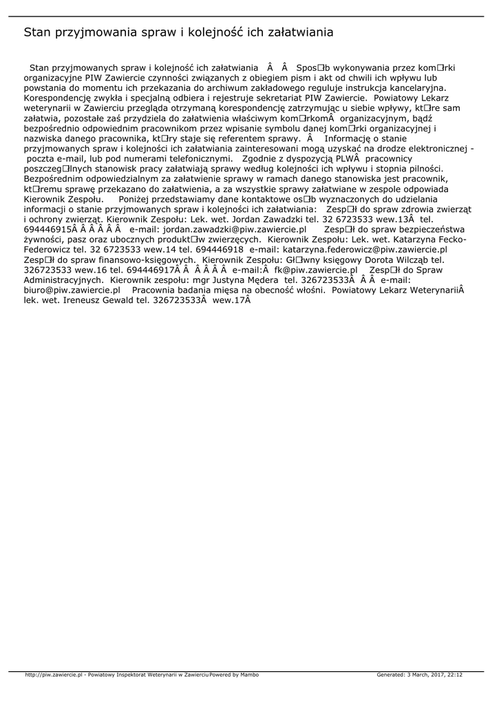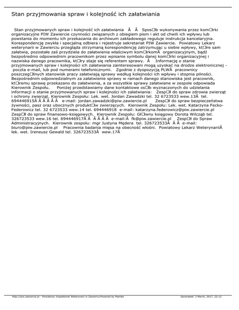 Stan przyjmowania spraw i kolejność ich załatwiania Stan przyjmowanych spraw i kolejność ich załatwiania   SposÃłb wykonywania przez komÃłrki organizacyjne PIW Zawiercie czynności związanych z obiegiem pism i akt od chwili ich wpływu lub powstania do momentu ich przekazania do archiwum zakładowego reguluje instrukcja kancelaryjna. Korespondencję zwykła i specjalną odbiera i rejestruje sekretariat PIW Zawiercie. Powiatowy Lekarz weterynarii w Zawierciu przegląda otrzymaną korespondencję zatrzymując u siebie wpływy, ktÃłre sam załatwia, pozostałe zaś przydziela do załatwienia właściwym komÃłrkom organizacyjnym, bądź bezpośrednio odpowiednim pracownikom przez wpisanie symbolu danej komÃłrki organizacyjnej i nazwiska danego pracownika, ktÃłry staje się referentem sprawy.  Informację o stanie przyjmowanych spraw i kolejności ich załatwiania zainteresowani mogą uzyskać na drodze elektronicznej poczta e-mail, lub pod numerami telefonicznymi. Zgodnie z dyspozycją PLW pracownicy poszczegÃłlnych stanowisk pracy załatwiają sprawy według kolejności ich wpływu i stopnia pilności. Bezpośrednim odpowiedzialnym za załatwienie sprawy w ramach danego stanowiska jest pracownik, ktÃłremu sprawę przekazano do załatwienia, a za wszystkie sprawy załatwiane w zespole odpowiada Kierownik Zespołu. Poniżej przedstawiamy dane kontaktowe osÃłb wyznaczonych do udzielania informacji o stanie przyjmowanych spraw i kolejności ich załatwiania: ZespÃłł do spraw zdrowia zwierząt i ochrony zwierząt. Kierownik Zespołu: Lek. wet. Jordan Zawadzki tel. 32 6723533 wew.13 tel. 694446915      e-mail: [email protected] ZespÃłł do spraw bezpieczeństwa żywności, pasz oraz ubocznych produktÃłw zwierzęcych. Kierownik Zespołu: Lek. wet. Katarzyna FeckoFederowicz tel. 32 6723533 wew.14 tel. 694446918 e-mail: [email protected] ZespÃłł do spraw finansowo-księgowych. Kierownik Zespołu: GłÃłwny księgowy Dorota Wilcząb tel. 326723533 wew.16 tel. 694446917      e-mail: [email protected] ZespÃłł do Spraw Administracyjnych. Kierownik zespołu: mgr Justyna Mędera tel. 326723533   e-mail: [email protected] Pracownia badania mięsa na obecność włośni. Powiatowy Lekarz Weterynarii lek. wet. Ireneusz Gewald tel. 326723533 wew.17 http://piw.zawiercie.pl - Powiatowy Inspektorat Weterynarii w Zawierciu Powered by Mambo Generated: 3 March, 2017, 22:12