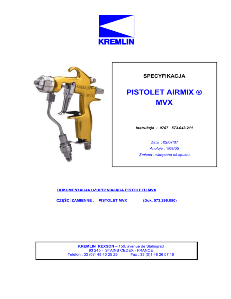 SPECYFIKACJA PISTOLET AIRMIX MVX Instrukcja : 0707 573.043.211 Data : 02/07/07 Anuluje : 1/09/05 Zmiana : wkręcana oś spustu DOKUMENTACJA UZUPEŁNIAJĄCA PISTOLETU MVX CZĘŚCI ZAMIENNE : PISTOLET MVX (Dok. 573.296.050) KREMLIN REXSON – 150, avenue de Stalingrad 93 245 - STAINS CEDEX - FRANCE Telefon : 33 (0)1 49 40 25 25 Fax : 33 (0)1 48 26 07 16 SPECYFIKACJA RĘCZNY PISTOLET AIRMIX MVX CHARAKTERYSTYKA Pistolet zalecany do rozpylania : werniksów lakierów farb produktów rozpuszczalnikowych i wodorozcieńczalnych górnych ekstraktów suchych poliuretanów dwukomponentowych CHARAKTERYSTYKA PISTOLET MVX 60 Ciśnienie zasilania powietrzem 3 PISTOLET MVX 120 60 bar max. Natężenie przepływu produktu zależnie od dyszy 120 bar max. 575 g Maksymalna temperatura eksploatacji 50°C Zużycie powietrza Ciśnienie powietrza = 1 bar na kolbie Ciśnienie powietrza = 2 bar na kolbie 5 m3/h 7,5 m3/h Współczynnik transferu (¤) według normy (Pr EN 13966-1) 81 1 % Materiały w kontakcie z produktem 200 bar max. (patrz Dok. 573.296.050) Waga (pistolet + głowica + dysza) Stal nierdzewna, PTFE Poliacetal Węglik Stal nierdzewna Złącze produktu (1) M 1/2 JIC Złącze powietrza (2) M 1/4 NPS Bezpieczeństwo Dźwignia blokady Filtr (3) z sitkiem nr 6 Zainstalowany na kolbie (¤) warunki badań : PISTOLET MVX 200 6 bar max. Ciśnienie zasilania produktem Gniazdo (demontowalne) 2 1 Ciśnienie produktu = 60 bar Lepkość = 25 s (CA 4) lub 50 mPas.s Ciśnienie powietrza kolba = 1,5 bar Temperatura = 20,5 °C KREMLIN REXSON Strona 1 Manuel : 573.043.211 SZEROKOŚĆ STRUMIENIA Z GŁOWICĄ VX14 Głowica z 2 kołkami i dysza z 2 rowkami Pp = 35 bar Pp = 70 bar DYSZE L 1 (cm) L 2 (cm) L 1 (cm) L 2 (cm) 04/094 20 7 20 9 04/114 22 7 23 9 06/094 21 8 21 10 06/114 23 8 23 12 06/134 25 10 27 14 06/154 28 11 31 17 09/094 21 9 23 10 09/114 21 8 23 12 09/134 28 10 30 14 09/154 28 12 29 16 12/094 21 9 22 11 12/114 24 10 26 12 12/134 26 10 28 14 12/154 26 10 30 16 12/174 31 12 33 18 14/094 22 9 22 11 14/114 23 9 24 12 14/134 27 10 28 16 14/154 29 12 32 19 14/174 30 12 34 21 18/134 30 12 31 20 18/154 29 12 32 20 18/174 31 12 33 22 L 1 : maksymalna szerokość strumienia (iglica odpowietrzników zamknięta) L 2 : zmniejszona szerokość strumienia (iglica odpowietrzników otwarta) Pp : ciśnienie produktu Warunki badań : Ciśnienie powietrza kolba = 1,5 bar Lepkość = 45 s (CA 4) lub 120 mPas.s Temperatura : 20°C Odległość między pistoletem a malowanym obiektem : 20 cm KREMLIN REXSON Strona 2 Manuel : 573.043.211 2. DEMONTAŻ – PONOWNY MONTAŻ UWAGA : Przed wszelką interwencją w pistolet, odciąć zasilanie sprężonym powietrzem i rozprężyć obwody naciskając na spust pistoletu. SIEGE (64) Zdjąć głowicę, następnie odkręcić uchwyt gniazda (63) kluczem (72) dostarczonym razem z pistoletem. Oczyścić wnętrze pistoletu. Jeżeli potrzeba, zastąpić nowym zespołem (patrz części zamienne, poz. 62 & 64). Poluzować śrubę (66) za pomocą śrubokręta, wyjąć gniazdo (64) i wymienić je. Założyć gniazdo według schematu obok (stożek uszczelniający w kierunku iglicy), nie zapominając o uszczelce gniazda (65) dla pistoletu MVX 120 i MVX 200. Zamontować ponownie części w odwrotnej kolejności operacji. 67 63 66 (65) Dokręcić uchwyt gniazda kluczem. Przestrzegać momentu obrotowego dokręcenia wskazanego w paragrafie "Instrukcje montażu". 64 IGLICA I USZCZELNIACZ (20) Zdjąć uchwyt gniazda (62) jak wskazano porzednio. Zdjąć spust (53) wyjmując śrubę (55) i oś spustu (54). Zdjąć zewnętrzny pierścień sprężynujący (23) uszczelnienia. Pociągnąć iglicę do przodu popychając tył uszczelniacza. Wyjąć zespół iglica-uszczelniacz z przodu pistoletu. W miarę potrzeby, zastąpić nowym zespołem (patrz części zamienne). Zamontować ponownie części w odwrotnej kolejności operacji. Ind. 20 22 21 SOUPAPE D'AIR ASSEMBLEE (25) Zdemontować spust pistoletu (53). Zdemontować uchwyt gniazda (62). Odkręcić osłonę (60) z linii iglicy. Zdjąć sprężynę iglicy (61), zabierak iglicy (33) i trzon iglicy (32). Wyjąć zawór powietrza (25) popychając go w kierunku tyłu pistoletu. Uważać na sprężynę zaworu (31). W miarę potrzeby, zastąpić nowym zespołem (patrz części zamienne). Zamontować ponownie najpierw zawór, spust, trzon iglicy, sprężynę zaworu, zabierak iglicy, sprężynę iglicy, a następnie osłonę. Uważać na kierunek ponownego montażu trzonu iglicy. Montować śrdnicę najmniejszą w kierunku osłony linii iglicy. KREMLIN REXSON Strona 3 Manuel : 573.043.211 WYMIANA USZCZELKI ZAWORU POWIETRZA (29) Wyjąć zawór powietrza (25) - (patrz poprzedni paragraf). Zdjąć uszczelkę (29). Założyć nową uszczelkę (29) w jej gnieździe. Posmarować ją. Dla ponownego montażu : Poz. 25 27 29 Ostrożnie wprowadzić zawór do korpusu pistoletu wykonując ruchy obrotowe, aby wstępnie uformować uszczelkę zaworu (29). Ponownie zamontować inne części, jak poprzednio. WYMIANA SITKA (48) Odkręcić moletowaną nakrętkę (51) znajdującą się na kolbie pistoletu. Oczyścić filtr i ręcznie odkręcić wspornik filtra (49). Pozwolić wyśliznąć się sitku (48), wymienić je. Zamontować ponownie w odwrotnej kolejności operacji. Poz. 45 47 48 49 50 51 Przed ponownym montażem różnych elementów, należy przedsięwziąć pewne środki ostrożności : - Umyć wszystkie części stosownym rozpuszczalnikiem myjącym za pomocą pędzla i szczotki. - Zakładać nowe uszczelki po posmarowaniu ich smarem PTFE. - Zakładać nowe części, jeżeli potrzeba. KREMLIN REXSON Strona 4 Manuel : 573.043.211 3. INSTRUCTIONS DE MONTAGE 1 7 2 3 4 5 36 8 S1 6 37 38 10 A1 21 23 22 32 A1 62 25 56+57 55 31 43 54 33 61 60 A1 46 53 47 11 S1 48 49 45 42 50 51 67 63 S3 66 Poz. 62 + 64 (65) S2 64 Poz. Instrukcje Opis A1 Smar PTFE Tuba smaru "TECHNILUB" (10 ml) S1 moment obrotowy dokręcenia : 9 - 11 Nm S2 moment obrotowy dokręcenia : 24 Nm S3 moment obrotowy dokręcenia : 2 Nm 