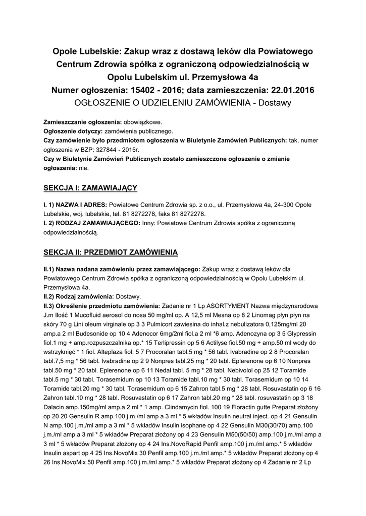 Opole Lubelskie: Zakup wraz z dostawą leków dla Powiatowego Centrum Zdrowia spółka z ograniczoną odpowiedzialnością w Opolu Lubelskim ul. Przemysłowa 4a Numer ogłoszenia: 15402 - 2016; data zamieszczenia: 22.01.2016 OGŁOSZENIE O UDZIELENIU ZAMÓWIENIA - Dostawy Zamieszczanie ogłoszenia: obowiązkowe. Ogłoszenie dotyczy: zamówienia publicznego. Czy zamówienie było przedmiotem ogłoszenia w Biuletynie Zamówień Publicznych: tak, numer ogłoszenia w BZP: 327844 - 2015r. Czy w Biuletynie Zamówień Publicznych zostało zamieszczone ogłoszenie o zmianie ogłoszenia: nie. SEKCJA I: ZAMAWIAJĄCY I. 1) NAZWA I ADRES: Powiatowe Centrum Zdrowia sp. z o.o., ul. Przemysłowa 4a, 24-300 Opole Lubelskie, woj. lubelskie, tel. 81 8272278, faks 81 8272278. I. 2) RODZAJ ZAMAWIAJĄCEGO: Inny: Powiatowe Centrum Zdrowia spółka z ograniczoną odpowiedzialnością. SEKCJA II: PRZEDMIOT ZAMÓWIENIA II.1) Nazwa nadana zamówieniu przez zamawiającego: Zakup wraz z dostawą leków dla Powiatowego Centrum Zdrowia spółka z ograniczoną odpowiedzialnością w Opolu Lubelskim ul. Przemysłowa 4a. II.2) Rodzaj zamówienia: Dostawy. II.3) Określenie przedmiotu zamówienia: Zadanie nr 1 Lp ASORTYMENT Nazwa międzynarodowa J.m Ilość 1 Mucofluid aerosol do nosa 50 mg/ml op. A 12,5 ml Mesna op 8 2 Linomag płyn płyn na skóry 70 g Lini oleum virginale op 3 3 Pulmicort zawiesina do inhal.z nebulizatora 0,125mg/ml 20 amp.a 2 ml Budesonide op 10 4 Adenocor 6mg/2ml fiol.a 2 ml *6 amp. Adenozyna op 3 5 Glypressin fiol.1 mg + amp.rozpuszczalnika op.* 15 Terlipressin op 5 6 Actilyse fiol.50 mg + amp.50 ml wody do wstrzyknięć * 1 fiol. Alteplaza fiol. 5 7 Procoralan tabl.5 mg * 56 tabl. Ivabradine op 2 8 Procoralan tabl.7,5 mg * 56 tabl. Ivabradine op 2 9 Nonpres tabl.25 mg * 20 tabl. Eplerenone op 6 10 Nonpres tabl.50 mg * 20 tabl. Eplerenone op 6 11 Nedal tabl. 5 mg * 28 tabl. Nebivolol op 25 12 Toramide tabl.5 mg * 30 tabl. Torasemidum op 10 13 Toramide tabl.10 mg * 30 tabl. Torasemidum op 10 14 Toramide tabl.20 mg * 30 tabl. Torasemidum op 6 15 Zahron tabl.5 mg * 28 tabl. Rosuvastatin op 6 16 Zahron tabl.10 mg * 28 tabl. Rosuvastatin op 6 17 Zahron tabl.20 mg * 28 tabl. rosuvastatin op 3 18 Dalacin amp.150mg/ml amp.a 2 ml * 1 amp. Clindamycin fiol. 100 19 Floractin gutte Preparat złożony op 20 20 Gensulin R amp.100 j.m./ml amp a 3 ml * 5 wkładów Insulin neutral inject. op 4 21 Gensulin N amp.100 j.m./ml amp a 3 ml * 5 wkładów Insulin isophane op 4 22 Gensulin M30(30/70) amp.100 j.m./ml amp a 3 ml * 5 wkładów Preparat złożony op 4 23 Gensulin M50(50/50) amp.100 j.m./ml amp a 3 ml * 5 wkładów Preparat złożony op 4 24 Ins.NovoRapid Penfil amp.100 j.m./ml amp.* 5 wkładów Insulin aspart op 4 25 Ins.NovoMix 30 Penfil amp.100 j.m./ml amp.* 5 wkładów Preparat złożony op 4 26 Ins.NovoMix 50 Penfil amp.100 j.m./ml amp.* 5 wkładów Preparat złożony op 4 Zadanie nr 2 Lp ASORTYMENT Nazwa międzynarodowa J.m Ilość 1 Niskoobjętościowy lek przeczyszczający do przygotowania do kolonoskopii i zabiegów operacyjnych, zawierający dwie substancje czynne: Pikosiarczan sodu i cytrynian magnezu. op. a. 1 saszetka Preparat złożony szt. 300. II.4) Wspólny Słownik Zamówień (CPV): 33.60.00.00-6. SEKCJA III: PROCEDURA III.1) TRYB UDZIELENIA ZAMÓWIENIA: Przetarg nieograniczony III.2) INFORMACJE ADMINISTRACYJNE Zamówienie dotyczy projektu/programu finansowanego ze środków Unii Europejskiej: nie SEKCJA IV: UDZIELENIE ZAMÓWIENIA Część NR: 1 Nazwa: zadanie nr 1 - Leki IV.1) DATA UDZIELENIA ZAMÓWIENIA: 23.12.2015. IV.2) LICZBA OTRZYMANYCH OFERT: 1. IV.3) LICZBA ODRZUCONYCH OFERT: 0. IV.4) NAZWA I ADRES WYKONAWCY, KTÓREMU UDZIELONO ZAMÓWIENIA: PGF URTICA Sp. z o. o., ul. Krzemieniecka 120, 64-613 Wrocław, kraj/woj. dolnośląskie. IV.5) Szacunkowa wartość zamówienia (bez VAT): 22689,40 PLN. IV.6) INFORMACJA O CENIE WYBRANEJ OFERTY ORAZ O OFERTACH Z NAJNIŻSZĄ I NAJWYŻSZĄ CENĄ Cena wybranej oferty: 24059,56 Oferta z najniższą ceną: 24059,56 / Oferta z najwyższą ceną: 24059,56 Waluta: PLN . Część NR: 2 Nazwa: Zadanie nr 2 - Preparat diagnostyczny IV.1) DATA UDZIELENIA ZAMÓWIENIA: 23.12.2015. IV.2) LICZBA OTRZYMANYCH OFERT: 1. IV.3) LICZBA ODRZUCONYCH OFERT: 0. IV.4) NAZWA I ADRES WYKONAWCY, KTÓREMU UDZIELONO ZAMÓWIENIA: PGF URTICA Sp. zo. o., ul. Krzemieniecka 120, 54-613 Wrocław, kraj/woj. dolnośląskie. IV.5) Szacunkowa wartość zamówienia (bez VAT): 4080,00 PLN. IV.6) INFORMACJA O CENIE WYBRANEJ OFERTY ORAZ O OFERTACH Z NAJNIŻSZĄ I NAJWYŻSZĄ CENĄ Cena wybranej oferty: 4101,72 Oferta z najniższą ceną: 4101,72 / Oferta z najwyższą ceną: 4101,72 Waluta: PLN .