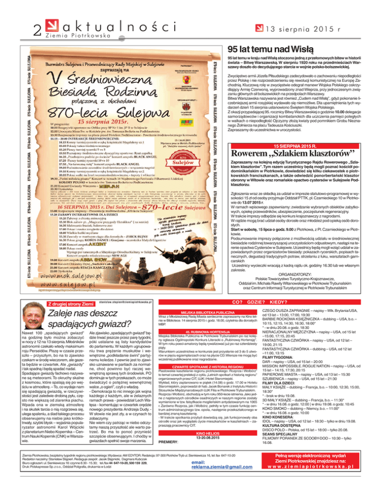 2 aktualności 13 sierpnia 2015 r Ziemia Piotrkowska 95 lat temu nadWisłą 95 lat temu w kraju nadWisłą stoczono jedną z przełomowych bitew w historii świata – Bitwę Warszawską. W sierpniu 1920 roku na przedmieściach Warszawy doszło do decydującego starcia w wojnie polsko-bolszewickiej. Zwycięstwo armii Józefa Piłsudskiego zadecydowało o zachowaniu niepodległości przez Polskę i nie rozprzestrzenieniu się rewolucji komunistycznej na Europę Zachodnią. Kluczową rolę w zwycięstwie odegrał manewr Wojska Polskiego oskrzydlający Armię Czerwoną, wyprowadzony znad Wieprza, przy jednoczesnym związaniu głównych sił bolszewickich na przedpolach Warszawy. Bitwa Warszawska nazywana jest również „Cudem nad Wisłą”, gdyż pokonanie liczebniejszej armii rosyjskiej wydawało się niemożliwe. Dla upamiętnienia tych wydarzeń dzień 15 sierpnia ustanowiono Świętem Wojska Polskiego. Z okazji przypadającej 95.rocznicy Bitwy Warszawskiej o godzinie 10.00 delegacje samorządowców i organizacji kombatanckich dla uczczenia pamięci poległych w walkach o niepodległość Ojczyzny złożą kwiaty pod pomnikiem Grobu Nieznanego Żołnierza na placu Tadeusza Kościuszki. Zapraszamy do uczestnictwa w uroczystości. 15 SIERPNIA 2015 R. Rowerem „Szlakiem klasztorów” Zapraszamy na kolejną edycję Turystycznego Rajdu Rowerowego „Szlakiem klasztorów”.Tym razem uczestnicy będą mogli poznać kościół podominikańskim w Piotrkowie, dowiedzieć się kilku ciekawostek o piotrkowskich franciszkanach, a także odwiedzić ponorbertański klasztor obronny w Witowie oraz romańskie opactwo cystersów w Sulejowie Podklasztorzu. Zgłoszenia wraz ze składką za udział w imprezie statutowo-programowej w wysokości 15 zł od osoby przyjmuje Oddział PTTK, pl.Czarnieckiego 10 w Piotrkowie do 13.07 2015 r. W ramach wpisowego zapewniamy: zwiedzanie wybranych obiektów zabytkowych, opiekę przewodników, ubezpieczenie, poczęstunek regeneracyjny. W trakcie imprezy odbędzie się konkurs krajoznawczy z nagrodami. W rajdzie mogą brać udział osoby dorosłe oraz młodzież pod opieką osób dorosłych. Start w sobotę, 15 lipca o godz. 9.00 z Piotrkowa, z Pl. Czarnieckiego w Piotrkowie. Podsumowanie imprezy połączone z możliwością udziału w średniowiecznej biesiadzie rodzinnej towarzyszącej uroczystościom odpustowym, nastąpi na terenie opactwa Cystersów w Sulejowie.Uczestnicy będą mogli wziąć udział w zapowiadanych przez organizatorów biesiady: pokazach rycerskich, popisach tanecznych, degustacji tradycyjnych potraw, strzelaniu z łuku, warsztatach garncarskich Uczestnicy wycieczki wracają z kadrą rajdu ok. godziny 16.30 lub we własnym zakresie. ORGANIZATORZY: Polskie Towarzystwo Turystyczno-Krajoznawcze, Oddział im. Michała Rawity Witanowskiego w Piotrkowie Trybunalskim oraz Centrum Informacji Turystycznej w Piotrkowie Trybunalskim Z drugiej strony Ziemi Zaleje nas deszcz spadających gwiazd? Nawet 100 „spadających gwiazd” na godzinę było można zobaczyć w nocy z 12 na 13 sierpnia.Miłośników astronomii czekało wtedy maksimum roju Perseidów. Piszę w czasie przeszło – przyszłym, bo na to zjawisko czekam w środę wieczorem, ale gazeta będzie w czwartek. Ale „gwiazdy” i tak spadną i będą spadać nadal. Spadające gwiazdy fachowo nazywane są meteorami. To okruchy skalne z kosmosu, które spalają się po wejściu w atmosferę. – To, co wydaje nam się spadającą gwiazdą, w rzeczywistości jest zaledwie drobiną pyłu, często nie większą od ziarenka piachu. Wpada ona w ziemską atmosferę i na skutek tarcia o nią rozgrzewa się, ulega spaleniu, a ślad takiego procesu obserwujemy na niebie jako krótkotrwały, szybki błysk – wyjaśnia popularyzator astronomii Karol Wójcicki z planetarium Niebo Kopernika – Centrum Nauki Kopernik (CNK) wWarszawie. CO? [email protected] Ale zjawisko „spadających gwiazd” będzie trwać jeszcze przez parę tygodni, póki ustalane są listy kandydatów do parlamentu. W każdym ugrupowaniu trwa prężenie muskułów i wewnętrzne „podkładanie świni” partyjnemu koledze. I pewnie jest to zjawisko uznawane w partiach za normalne, choć powinno być raczej wewnętrzną sprawą tych środowisk. PO dominuje w tych przekazach, co może świadczyć o potężnej wewnętrznej walce „o ogień”, czyli o władzę. - Demokracja to nic innego jak wojna każdego z każdym, ale w żelaznych ramach prawa - powiedział Lech Wałęsa - komentując w czwartek orędzie nowego prezydenta Andrzeja Dudy. W słowie nie jest zły, a w czynach to zobaczymy. Nie wiem czy patrząc w niebo odczytamy naszą przyszłość ale warto patrzeć. Bo ma to ponoć przynieść szczęście obserwującym. I choćby w gwiazdach spełnić swoje marzenia. GDZIE? MIEJSKA BIBLIOTEKA PUBLICZNA Wraz z Młodzieżową Radą Miasta serdecznie zapraszamy na Kino letnie w Bibliotece. 14 sierpnia 2015 r. godz. 18.00, czytelnia dla dorosłych MBP. ul. Jerozolimska 29 45. RUBINOWA HORTENSJA Miejska Biblioteka Publiczna w Piotrkowie Trybunalskim po raz kolejny ogłasza Ogólnopolski Konkurs Literacki o „Rubinową Hortensję”. W tym roku poeci-amatorzy będą rywalizować już po raz czterdziesty piąty. Warunkiem uczestnictwa w konkursie jest przysłanie od 3 do 5 utworów w pięciu egzemplarzach oraz na płycie CD.Wiersze nie mogą być wcześniej publikowane oraz nagradzane. CZWARTE SPOTKANIE Z HISTORIĄ REGIONU Piastowskie kasztelanie regionu piotrkowskiego: Rozprza i Wolbórz” to temat czwartej prelekcji z cyklu „Letnich spotkań z historią regionu” organizowanych przez CIT, UJK i Hotel Staromiejski. Wykład, który zaplanowano w piątek (14.08) o godz. 17.00 w Hotelu Staromiejskim, poprowadzi dr hab. Jacek Bonarek z Instytutu Historii i Stosunków Międzynarodowych UJK Filia w Piotrkowie Trybunalskim. Rozprza i Wolbórz, obchodzą w tym roku 950-lecie istnienia. Jako jedne z najstarszych ośrodków osadniczych w naszym re