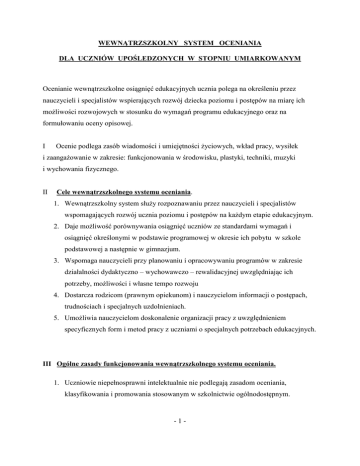 WEWNĄTRZSZKOLNY SYSTEM OCENIANIA DLA UCZNIÓW UPOŚLEDZONYCH W STOPNIU UMIARKOWANYM Ocenianie wewnątrzszkolne osiągnięć edukacyjnych ucznia polega na określeniu przez nauczycieli i specjalistów wspierających rozwój dziecka poziomu i postępów na miarę ich możliwości rozwojowych w stosunku do wymagań programu edukacyjnego oraz na formułowaniu oceny opisowej. I Ocenie podlega zasób wiadomości i umiejętności życiowych, wkład pracy, wysiłek i zaangażowanie w zakresie: funkcjonowania w środowisku, plastyki, techniki, muzyki i wychowania fizycznego. II Cele wewnątrzszkolnego systemu oceniania. 1. Wewnątrzszkolny system służy rozpoznawaniu przez nauczycieli i specjalistów wspomagających rozwój ucznia poziomu i postępów na każdym etapie edukacyjnym. 2. Daje możliwość porównywania osiągnięć uczniów ze standardami wymagań i osiągnięć określonymi w podstawie programowej w okresie ich pobytu w szkole podstawowej a następnie w gimnazjum. 3. Wspomaga nauczycieli przy planowaniu i opracowywaniu programów w zakresie działalności dydaktyczno – wychowawczo – rewalidacyjnej uwzględniając ich potrzeby, możliwości i własne tempo rozwoju 4. Dostarcza rodzicom (prawnym opiekunom) i nauczycielom informacji o postępach, trudnościach i specjalnych uzdolnieniach. 5. Umożliwia nauczycielom doskonalenie organizacji pracy z uwzględnieniem specyficznych form i metod pracy z uczniami o specjalnych potrzebach edukacyjnych. III Ogólne zasady funkcjonowania wewnątrzszkolnego systemu oceniania. 1. Uczniowie niepełnosprawni intelektualnie nie podlegają zasadom oceniania, klasyfikowania i promowania stosowanym w szkolnictwie ogólnodostępnym. -1- 2. W ocenianiu stosuje się indywidualną ocenę opisową uwzględniającą efekty rozwoju we wszystkich sferach: psychicznej, fizycznej i emocjonalnej, a także wskazującą tok dalszego postępowania i oddziaływania na dziecko. 3. System oceniania uwzględnia trzy podstawowe funkcje oceny: motywującą czyli wspierającą informującą czyli diagnostyczną instruktażowo – korekcyjną czyli doradczą. 4. Ocenianie opisowe oraz wytyczanie kierunków oddziaływań dokonuje zespół rewalidacyjny osób pracujących z danymi uczniami. 5. W ocenianiu wykorzystywane są narzędzia diagnostyczne: Ocena postępów w rozwoju społecznym ucznia raz w roku przy ocenie końcowo rocznej (według diagramu Ganzburga) Oceny cząstkowe notowane po zajęciach w ciągu dnia. IV Oceniając słownie lub opisowo nauczyciel stara się, aby ocena: uwzględniała postęp na miarę możliwości dziecka, wskazywała wkład pracy, wysiłek, zaangażowanie, dotyczyła sytuacji, zachowania, nie zaś dziecka jako osoby, angażowała do samooceny, uwzględniała sytuację rodzinną, inicjowała sprzężenie zwrotne – zarówno ze strony ucznia jak i jego rodziców. Do rejestrowania oceny osiągnięć służą: 1. Dokumentacja , z której wynika , czego uczniowie się nauczyli: teczki prac uczniowskich, zeszyty uczniowskie do pracy indywidualnej podczas zajęć, materiał reportażowy (zdjęcia, nagrania, filmy, itp.). 2. Indywidualny program edukacyjny dla zespołu edukacyjno – terapeutycznego z uwzględnieniem przewidywanych efektów dydaktyczno – wychowawczych ucznia (osiągnięcia ucznia). 3. Prezentacja dokonań uczniowskich na forum klasy, szkoły i poza nią. -2- 4. Ankiety i arkusze ewaluacyjne w formie zadań niedokończonych, swobodnych wypowiedzi lub innych. 5. Oceny opisowe. 6. Rozmowy i inne opracowane przez nauczyciela. Ocena opisowa jest systematycznie dokonywana raz w semestrze. V Kryteria oceniania uczniów. W szkole stosowane są następujące rodzaje ocen: 1. Ocena opisowa (adresatem są rodzice) według dowolnie wybranego przez nauczyciela wzorca np.: listu, relacji z pracy ucznia. 2. Ocena słowna adresowana do ucznia w trakcie prowadzonych zajęć w najbardziej odpowiednim momencie: Ocena niezaplanowana, spontaniczna, połączona z gestem, uśmiechem, Ocena o charakterze wspierającym, zachęcającym do kontynuowania pracy, wsparta radą bądź wskazówką, uznaniem. 3. Dyplom, list gratulacyjny, odznaka, medal. 4. Ocena symboliczna w postaci znaczków, stempli oraz różnego rodzaju kodu ilustrującego tzw. „wyrazy uznania”. Podczas zajęć, ćwiczeń i innych prac uczniowie otrzymują ocenę w formie symbolu i tak słoneczko uśmiechnięte oznacza wspaniale, słoneczko smutne – postaraj się. 5. Ocena opisowa semestralna i końcoworoczna: a) Za okres I i II semestru nauczyciele przygotowują ocenę opisową w stosunku do każdego ucznia w oparciu o oceny cząstkowe dzienne (w planach pracy) oraz oceny cząstkowe miesięczne ( w dziennikach zajęć). Ocenę postępów w rozwoju społecznym ucznia dokonuje się raz na końcu roku szkolnego według diagramu Gunzburga i opracowanego inwentarza: - dla uczniów upośledzonych w stopniu umiarkowanym diagram PAC-1, Diagram wypełnia się kolorami stosując umowną legendę: - wykonuje samodzielnie (kolor żółty) - wykonuje z pomocą (kolor zielony) - w ogóle nie wykonuje (kolor czerwony) -3- a po jego zakończeniu wyznacza wskazówki do dalszej pracy (ewaluacja). Ocena opisowa jest odzwierciedleniem osiągnięć ucznia. Nakreśla kierunki pracy wspomagające rozwój dziecka z zachowaniem proporcji między wymaganiami, jakie stawia życie, a możliwościami psychofizycznymi uczniów. Kryteria do oceny opisowej w zakresie szkolnych standardów na końcu kolejnych progów edukacyjnych (kl. III, VI, III Gimnazjum) stanowi załącznik nr 1. b) Ocena z zachowania jest oceną opisową i uwzględnia: - funkcjonowanie ucznia w środowisku klasowym i szkolnym, - przestrzeganie zasad współżycia w zespole. Rada Pedagogiczna Zespołu Szkół Nr 5 w Bytomiu ustala kryteria oceny opisowej dotyczącej zachowania się ucznia. 1. Stosunek do nauczyciela i rodziców. 2. Stosunek do kolegów słabszych i młodszych. 3. Współżycie i współdziałanie w zespole: a) w klasie b) n