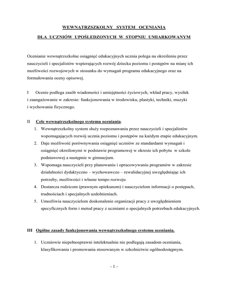 WEWNĄTRZSZKOLNY SYSTEM OCENIANIA DLA UCZNIÓW