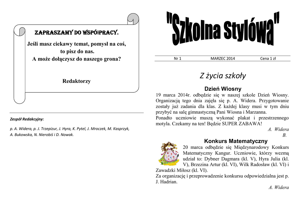 Zapraszamy do współpracy. Jeśli masz ciekawy temat, pomysł na coś, to pisz do nas. A może dołączysz do naszego grona? Redaktorzy Nr 1 MARZEC 2014 Cena 1 zł Z życia szkoły Dzień Wiosny Zespół Redakcyjny: p. A. Widera, p. J. Trzepizur, J. Hyra, K. Pytel, J. Mroczek, M. Kasprzyk, A. Bukowska, N. Nierobiś i D. Nowak. 19 marca 2014r. odbędzie się w naszej szkole Dzień Wiosny. Organizacją tego dnia zajęła się p. A. Widera. Przygotowanie zostały już zadania dla klas. Z każdej klasy musi w tym dniu przybyć na salę gimnastyczną Pani Wiosna i Marzanna. Ponadto uczniowie muszą wykonać plakat i przestrzennego motyla. Czekamy na ten! Będzie SUPER ZABAWA! A. Widera B. Konkurs Matematyczny 20 marca odbędzie się Międzynarodowy Konkurs Matematyczny Kangur. Uczniowie, którzy wezmą udział to: Dybner Dagmara (kl. V), Hyra Julia (kl. V), Brzezina Artur (kl. VI), Wilk Radosław (kl. VI) i Zawadzki Miłosz (kl. VI). Za organizację i przeprowadzenie konkursu odpowiedzialna jest p. J. Hadrian. A. Widera Dzień Pszczoły Rebus 11kwietnia 2014 roku w naszej szkole organizowany będzie Dzień Pszczoły. Przyjadą do nas uczniowie z pobliskich szkół. Za przeprowadzenie imprezy odpowiedzialna jest p. A. Walczak. Tego dnia wszyscy muszą być przebrani za pszczoły. J. Hyra Co było… czyli dyskotekowe tańce Ostatnia dyskoteka odbyła się na walentynki. Przyjechały do nas koleżanki ze szkoły w Kulejach im. Orła Białego. Nauczyciele aby ulepszyć naszą zabawę zorganizowali konkurs na królową i króla parkietu. Chłopaki spośród tańczących dziewczyn wybierali królową, a dziewczyny króla. Dyskoteka skończyła się o godzinie 20:00. To była SUPER ZABAWA!!! J. Hyra Na sportowo… 14 stycznia 2014 roku w naszej szkole odbył się SZKOLNY TURNIEJ TENISA STOŁOWEGO .Brali w nim udział prawie wszyscy nasi uczniowie .Osoby, które zajęły I lub II miejsce z grupy żeńskiej i męskiej pod opieką pana Michała Wręczyckiego pojadą na turniej do innej szkoły. D. Nowak Odpowiedzi w następnym numerze… Konkurs!!! Wszystkich chętnych zapraszamy do konkursu, zadaniem którego jest napisanie strasznej historii, która nas „wbije w fotel”. Na zwycięzcę czeka ciekawa nagroda. Piszcie i wygrywajcie!!! Powodzenia!!! Prace należy dostarczyć do 4 kwietnia 2014 roku. Grupa żeńska : I miejsce Dagmara Dybner (uczenica klasy V ) II miejsce Julia Hyra (uczennica klasy V) Czas na relaks Krzyżówka Grupa męska : I miejsce Mateusz Hepner (uczeń klasy VI) II miejsce Artur Brzezina (uczeń klasy VI) J. Hyra Moda i uroda Im większe, tym modniejsze... D. Nowak Jeszcze kilka lat temu w salonach optycznych dostępne były jedynie okulary malutkie, z cieniutkimi oprawkami. Tak jakby noszenie okularów trzeba było ukrywać. Nic dziwnego, że przy takim trendzie, soczewki stały się tak popularne. Dziś koniec z tym! Okulary ma być widać, bo stały się modnym dodatkiem! Najmodniejsze modele to te z plastikowymi oprawkami. Wciąż trendowe są tzw. kocie oczy, ale też kwadratowe oprawki w męskim stylu jak u Clarka Kenta. A nowości? Absolutnym hitem dla odważnych są retro oprawki w totalnie okrągłym kształcie. Odważycie się? K. Pytel Nowa kolekcja wiosna/lato 2014 CCC przygotowuje się do nowego sezonu. W sklepach już pojawiła się kolekcja CCC wiosna lato 2014. Najpopularniejsza obuwnicza sieciówka zapowiada ciekawy miszmasz trendów w dobrze sobie znanym, minimalistycznym wydaniu. Klientki mogą się spodziewać szerokiego wyboru obuwia na wiosnę - od pełnych fasonów na pierwsze słoneczne dni po lekkie, przewiewne buty na majowe upały. Sukienki na wiosnę 2014 powinny być zwiewne i lekkie, a przede wszystkim supermodne! Kupując sukienkę na nowy sezon, nie zapomnij o modnych fasonach (przede wszystkim rozkloszowane sukienki będą modne), kolorach (pudrowy róż, biel, jaskrawa zieleń i mocny róż) i wzorach (kwiatowe czy orientalne!). Pikowania, które kiedyś zarezerwowane była dla grubych, zimowych kurtek w tym sezonie zagościły na ich krótkich, wiosennych wersjach. Pikowana, krótka kurtka będzie Ci świetnie służyła podczas okresu przejściowego pomiędzy zimą a wiosną, kiedy jest jeszcze zbyt zimno, by założyć ramoneską albo trencz, ale jest już zbyt ciepło na wełniane płaszcze i grube, ciepłe kurtki. Na wiosnę, marka Mosquito przygotowała kolekcję torebek w delikatnych, pastelowych kolorach. Tańce latynoamerykańskie to: - rumba - cha cha - samba - paso doble - jive Taniec towarzyski to oczywiście nie tylko dziesięć wymienionych wyżej tańców, istnieją dziesiątki, a nawet jeśli się uprzeć to setki innych tańców towarzyskich. Jednak style te nie podlegają ocenie na turniejach tańca. Obecnie najbardziej popularnym stylem tańca, co możemy zaobserwować czy to w klubach, czy w ofertach szkoły tańca jest salsa. Salsa to latynoski, klimatyczny, żywy, pełen energii i efektownych ruchów taniec towarzyski. Poza salsą popularne tańce to disco blues, disco fox czy twist. Sukienka do tańców latynoskich Sukienka do tańców standardowych M. Kasprzyk Taniec towarzyski Krótka Historia tańca towarzyskiego Taniec towarzyski jest popularną formą rozrywki na całym świecie. Jednak nie wszyscy wiedzą jakie były początki tańców towarzyskich. Taniec towarzyski wywodzi się z tańców salonowych i zabaw ludowych. Początki tańca towarzyskiego datuje się na koniec XIX i początek XX wieku. Taniec towarzyskie to również dyscyplina sportowa, która rządzi się ścisłymi zasadami. Każdy tancerz, który bierze udział w turnieju posiada klasę taneczną, wyróżniamy klasy od E (początkujący), poprzez D, C, B, A i S (mistrz). Najważniejszą organizacją, która zrzesza wszystkich tancerzy, ustala zasady oraz organizuje zawody i turnieje tańca w Polsce jest Polskie Towarzystwo Taneczne, natomiast pieczę nad turniejami klasy międzynarodowej i światowej sprawuje Międzynarodowy Związek Tańców Towarz