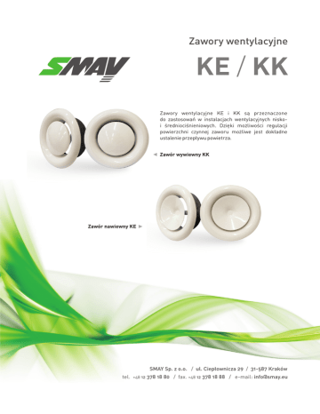 Zawory wentylacyjne KE / KK Zawory wentylacyjne KE i KK s¹ przeznaczone do zastosowañ w instalacjach wentylacyjnych niskoi œredniociœnieniowych. Dziêki mo¿liwoœci regulacji powierzchni czynnej zaworu mo¿liwe jest dok³adne ustalenie przep³ywu powietrza. Zawór wywiewny KK Zawór nawiewny KE SMAY Sp. z o.o. / ul. Ciep³ownicza 29 / 31-587 Kraków tel. +48 12 378 18 80 / fax. +48 12 378 18 88 / e-mail: [email protected] Zawory wentylacyjne KE i KK Wykonanie Zawory wentylacyjne s¹ dostêpne w wersji nawiewnej KE i wywiewnej KK. S¹ wykonane ze stali lakierowanej proszkowo na kolor bia³y RAL9010. Na zamówienie mo¿liwe jest lakierowanie na inny kolor RAL. Zawory posiadaj¹ element regulacyjny w postaci okr¹g³ego talerza. Dziêki obracaniu talerza mo¿liwe jest zwiêkszenie lub zmniejszenie powierzchni czynnej zaworu a tym samym dok³adne wyregulowanie parametrów pracy zaworu. Po zakoñczeniu regulacji talerz zaworu jest blokowany w wybranej pozycji poprzez dokrêcenie nakrêtki kontruj¹cej. Monta¿ Zawory s¹ dostarczane z ko³nierzami monta¿owymi. Ko³nierze s¹ montowane do przegród budowlanych przy u¿yciu wkrêtów. Monta¿ zaworu odbywa siê poprzez wkrêcenie korpusu zaworu w ko³nierz monta¿owy. Wymiary, masa zaworów wentylacyjnych Zawór nawiewny KE Zawór wywiewny KK Wymiar øD øD1 B Masa Wymiar øD øD1 B Masa [mm] [mm] 79 99 124 159 199 [mm] 120 140 170 210 250 [mm] 31 31 37 46 50 [kg] 0,14 0,19 0,31 0,5 0,73 [mm] [mm] 79 99 124 [mm] 120 140 170 [mm] 31 31 37 [kg] 0,15 0,195 0,31 159 199 210 250 46 50 0,47 0,66 80 100 125 160 200 80 100 125 160 200 Ko³nierz monta¿owy Wysokoœæ øD øD1 Masa [mm] [mm] [mm] 80 100 125 160 200 79 105 [kg] 0,04 99 125 124 150 0,05 0,07 159 180 0,10 199 225 0,14 49 92 wersja 5.2.7 Dobór KE i KK Oznaczenia: wydajnoœæ przep³ywu miejscowa strata ciœnienia Nomogram I Charakterystyki regulacyjne oporów przep³ywu i g³oœnoœci pracy w funkcji wydajnoœci powietrza i po³o¿enia grzybka: wersja 5.2.7 KK-80 KE-80 KK-100 KE-100 93 Dobór KE i KK KK-125 94 KE-125 KK-160 KE-160 KK-200 KE-200 wersja 5.2.7 Dobór KE i KK wersja 5.2.7 95 Akcesoria i sposób zamówienia Przy zamówieniu nale¿y podaæ informacje wed³ug poni¿szego sposobu: <TYP ZAWORU> - <oD> - SL<RAL> Gdzie: <TYP ZAWORU> <oD> SL <RAL> - KE lub KK - œrednica nominalna: 80, 100, 125, 160, 200 - wykoñczenie: stal lakierowana - kolor wg palety RAL * * wartoœci opcjonalne, w przypadku ich nie podania zostan¹ zastosowane wartoœci domyœlne Przyk³ad zamówienia: KK – 160 – SL9010 96 wersja 5.2.7