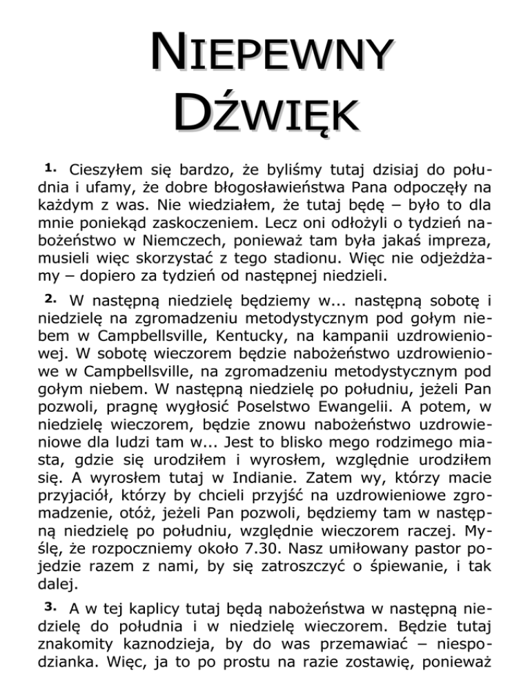 NIEPEWNY DŹWIĘK 1. Cieszyłem się bardzo, że byliśmy tutaj dzisiaj do południa i ufamy, że dobre błogosławieństwa Pana odpoczęły na każdym z was. Nie wiedziałem, że tutaj będę – było to dla mnie poniekąd zaskoczeniem. Lecz oni odłożyli o tydzień nabożeństwo w Niemczech, ponieważ tam była jakaś impreza, musieli więc skorzystać z tego stadionu. Więc nie odjeżdżamy – dopiero za tydzień od następnej niedzieli. W następną niedzielę będziemy w... następną sobotę i niedzielę na zgromadzeniu metodystycznym pod gołym niebem w Campbellsville, Kentucky, na kampanii uzdrowieniowej. W sobotę wieczorem będzie nabożeństwo uzdrowieniowe w Campbellsville, na zgromadzeniu metodystycznym pod gołym niebem. W następną niedzielę po południu, jeżeli Pan pozwoli, pragnę wygłosić Poselstwo Ewangelii. A potem, w niedzielę wieczorem, będzie znowu nabożeństwo uzdrowieniowe dla ludzi tam w... Jest to blisko mego rodzimego miasta, gdzie się urodziłem i wyrosłem, względnie urodziłem się. A wyrosłem tutaj w Indianie. Zatem wy, którzy macie przyjaciół, którzy by chcieli przyjść na uzdrowieniowe zgromadzenie, otóż, jeżeli Pan pozwoli, będziemy tam w następną niedzielę po południu, względnie wieczorem raczej. Myślę, że rozpoczniemy około 7.30. Nasz umiłowany pastor pojedzie razem z nami, by się zatroszczyć o śpiewanie, i tak dalej. 2. 3. A w tej kaplicy tutaj będą nabożeństwa w następną niedzielę do południa i w niedzielę wieczorem. Będzie tutaj znakomity kaznodzieja, by do was przemawiać – niespo dzianka. Więc, ja to po prostu na razie zostawię, ponieważ 2 będziemy się starać zaprosić kogoś, kto będzie dla was niespodzianką w następną niedzielę. A więc teraz, wy którzy nie możecie być tam w Campbellsville, by być razem z nami na tym zgromadzeniu, patrzcie, przyjdźcie wprost do tej małej kaplicy, a nabożeństwa będą kontynuowane jak zwykle – w następną niedzielę rano i w niedzielę wieczorem. 4. Odwołalibyśmy to, gdyby tutaj przypadkowo był ktoś z pobliża Campbellsville – zawsze staramy się je odwołać z powodu innych nabożeństw, ale tam... lecz mamy ludzi, którzy po prostu nie mogą w tym czasie wyjechać na tamte zgromadzenia. I będziemy mieć nabożeństwa specjalnie dla nich i dla młodych ludzi. Więc każdy jest serdecznie zapro szony na te wspaniałe nabożeństwa. 5. Zatem, przypadkowo dostaniemy... Mówmy teraz po prostu o czasie – jak on się naprawdę przyśpiesza. Pomyślcie tylko. Ja odlecę stąd o jedenastej do południa – z Lo uisville, a następnego popołudnia, zaraz po obiedzie, będę przemawiał w Luksemburgu i w Frankfurcie w Niemczech. Pomyślcie tylko, od jedenastej godziny tutaj w... Odlatuję z Louisville o jedenastej godzinie, a następnego popołudnia będę głosił w Frankfurcie, w Niemczech; mając ponad to minus pięć godzin czasowej różnicy. Pomyślcie tylko o tym! Moi drodzy! Trudno w to uwierzyć, nieprawdaż? Tak szybko! Lecz przypadkowo, z łaski Bożej, dostaliśmy dobrą, bezpośrednią linię – DC-9 stąd do Nowego Jorku, a stamtąd dalej linią Pan American. Ona nas zabierze prosto do Frankfurtu. 6. Będziemy tam potem kilka dni, a następnie udamy się stamtąd do Berlina. I u sławnego Hala Hermana – mam być u niego dwa wieczory w Berlinie, w Niemczech. Ten słynny nawrócony reżyser filmowy z Hollywoodu, który się nawrócił na jednym ze zgromadzeń ewangelizacyjnych. A on jest z urodzenia Niemcem. I on jest z powrotem w Niemczech i głosi Ewangelię pod wielkim namiotem w Berlinie. A przychodzi tam wiele tysięcy spoza żelaznej kurtyny. To jest... 3 7. Jest to naprawdę wzruszające. Pewnego poranka siedziałem w Zürychu, w Szwajcarii, a wówczas było tam tak dużo ludzi. Mieliśmy tam na zgromadzeniu sto dwadzieścia sześć tysięcy ludzi, więc nie mogliśmy się niemal wydostać z tego miejsca. A zatem każdy, wiecie to wzruszające – i błagali, bym się za nich modlił, i chcieli wiedzieć, co Pan ma im do powiedzenia. A Pan powiedział mi: „Wyjdź i idź w kierunku brzegu morza, względnie brzegu jeziora”. Szwajcaria jest takim pięknym krajem. 8. A ja powiedziałem: „Billy, chodź razem ze mną”. On powiedział: „Nuże, tato, ty się tam wplątasz w kabałę i będziesz musiał zawezwać policję, by cię stamtąd wydostali”. 9. 10. A ja powiedziałem: „Trudno, Pan mi mówi, żebym szedł w kierunku brzegu”. Zszedłem więc nad brzeg i spacerowałem długo wzdłuż niego, a nikt... Niemcy, Szwajcarzy, Belgowie, Francuzi i Włosi – na zgromadzeniu. Nikt mnie nie poznał – w ogóle. Szedłem tuż koło wybrzeża. I mam pewien sposób, jak się zamaskować trochę. Wątpię, czy by mnie poznał mój własny brat – gdyby się ze mną spotkał. Więc... A on był... Szedłem tuż koło brzegu – wyszliśmy tam i usiedliśmy. A Billy powiedział: „Patrz, ty wiesz, że oni mnie znają, tato”. 11. Ja powiedziałem: „No cóż” – powiedziałem – „może cię znają”. Lecz powiedziałem: „Pan mi powiedział, abym wyszedł”. 12. Powiedział: „Lecz co Pan chce, żebyś uczynił?” Niecierpliwość dziecka, wiecie. 13. Ja odrzekłem: „On się o to zatroszczy”. Rozumiecie? 14. Zaczęliśmy więc spacerować z powrotem wzdłuż wybrzeża. Zobaczyłem starego człowieka, który tam siedział, płakał, czytał, ot tak. Powiedziałem: „Tam on jest. O niego chodzi”. 4 On rzekł: „Czy nie podejdziesz do tego człowieka, by z nim rozmawiać?” 15. Ja rzekłem: „Nie, on podejdzie do mnie i będzie rozma wiał ze mną”. Rzekłem: „On...” Powiedziałem: „Otóż, on jest z dalekich stron”. I rzekłem: „On tutaj przyszedł; jest to nagląca sprawa. Obserwuj a zobaczysz, czy ten człowiek nie ma czegoś dla mnie. A dotyczy to ramienia kobiety. Rozumiesz?” Powiedziałem... Powiedział: „Jak wiesz?” Ja powiedziałem: „Właśnie przyszła wizja, a to jest te