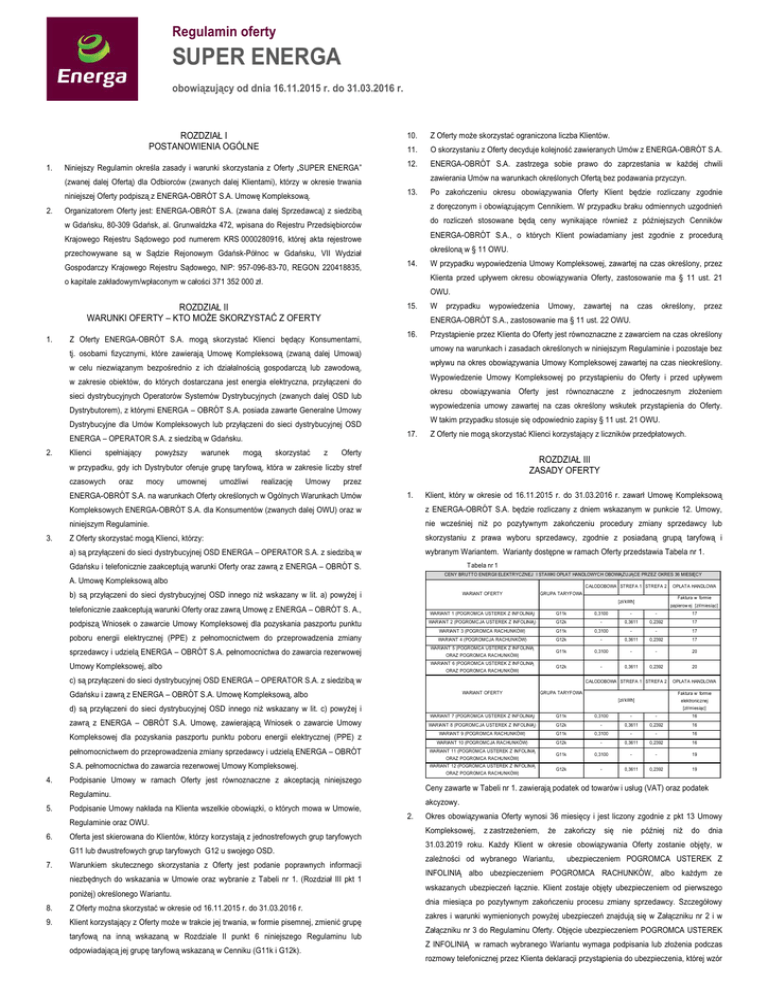 Regulamin oferty SUPER ENERGA obowiązujący od dnia 16.11.2015 r. do 31.03.2016 r. ROZDZIAŁ I POSTANOWIENIA OGÓLNE 1. 10. Niniejszy Regulamin określa zasady i warunki skorzystania z Oferty „SUPER ENERGA” O skorzystaniu z Oferty decyduje kolejność zawieranych Umów z ENERGA-OBRÓT S.A. 12. ENERGA-OBRÓT S.A. zastrzega sobie prawo do zaprzestania w każdej chwili 13. Po zakończeniu okresu obowiązywania Oferty Klient będzie rozliczany zgodnie zawierania Umów na warunkach określonych Ofertą bez podawania przyczyn. (zwanej dalej Ofertą) dla Odbiorców (zwanych dalej Klientami), którzy w okresie trwania niniejszej Oferty podpiszą z ENERGA-OBRÓT S.A. Umowę Kompleksową. 2. Z Oferty może skorzystać ograniczona liczba Klientów. 11. Organizatorem Oferty jest: ENERGA-OBRÓT S.A. (zwana dalej Sprzedawcą) z siedzibą z doręczonym i obowiązującym Cennikiem. W przypadku braku odmiennych uzgodnień w Gdańsku, 80-309 Gdańsk, al. Grunwaldzka 472, wpisana do Rejestru Przedsiębiorców do rozliczeń stosowane będą ceny wynikające również z późniejszych Cenników Krajowego Rejestru Sądowego pod numerem KRS 0000280916, której akta rejestrowe ENERGA-OBRÓT S.A., o których Klient powiadamiany jest zgodnie z procedurą określoną w § 11 OWU. przechowywane są w Sądzie Rejonowym Gdańsk-Północ w Gdańsku, VII Wydział Gospodarczy Krajowego Rejestru Sądowego, NIP: 957-096-83-70, REGON 220418835, 14. W przypadku wypowiedzenia Umowy Kompleksowej, zawartej na czas określony, przez Klienta przed upływem okresu obowiązywania Oferty, zastosowanie ma § 11 ust. 21 o kapitale zakładowym/wpłaconym w całości 371 352 000 zł. OWU. 15. ROZDZIAŁ II WARUNKI OFERTY – KTO MOŻE SKORZYSTAĆ Z OFERTY 1. Z Oferty ENERGA-OBRÓT S.A. mogą skorzystać Klienci będący Konsumentami, 16. wpływu na okres obowiązywania Umowy Kompleksowej zawartej na czas nieokreślony. Wypowiedzenie Umowy Kompleksowej po przystąpieniu do Oferty i przed upływem w zakresie obiektów, do których dostarczana jest energia elektryczna, przyłączeni do okresu obowiązywania Oferty jest równoznaczne z jednoczesnym złożeniem sieci dystrybucyjnych Operatorów Systemów Dystrybucyjnych (zwanych dalej OSD lub wypowiedzenia umowy zawartej na czas określony wskutek przystąpienia do Oferty. Dystrybutorem), z którymi ENERGA – OBRÓT S.A. posiada zawarte Generalne Umowy W takim przypadku stosuje się odpowiednio zapisy § 11 ust. 21 OWU. Dystrybucyjne dla Umów Kompleksowych lub przyłączeni do sieci dystrybucyjnej OSD 17. ENERGA – OPERATOR S.A. z siedzibą w Gdańsku. spełniający powyższy warunek mogą skorzystać z Przystąpienie przez Klienta do Oferty jest równoznaczne z zawarciem na czas określony umowy na warunkach i zasadach określonych w niniejszym Regulaminie i pozostaje bez w celu niezwiązanym bezpośrednio z ich działalnością gospodarczą lub zawodową, Klienci Z Oferty nie mogą skorzystać Klienci korzystający z liczników przedpłatowych. Oferty ROZDZIAŁ III ZASADY OFERTY w przypadku, gdy ich Dystrybutor oferuje grupę taryfową, która w zakresie liczby stref czasowych oraz mocy umownej umożliwi realizację Umowy przez ENERGA-OBRÓT S.A. na warunkach Oferty określonych w Ogólnych Warunkach Umów 3. określony, przez ENERGA-OBRÓT S.A., zastosowanie ma § 11 ust. 22 OWU. tj. osobami fizycznymi, które zawierają Umowę Kompleksową (zwaną dalej Umową) 2. W przypadku wypowiedzenia Umowy, zawartej na czas 1. Klient, który w okresie od 16.11.2015 r. do 31.03.2016 r. zawarł Umowę Kompleksową Kompleksowych ENERGA-OBRÓT S.A. dla Konsumentów (zwanych dalej OWU) oraz w z ENERGA-OBRÓT S.A. będzie rozliczany z dniem wskazanym w punkcie 12. Umowy, niniejszym Regulaminie. nie wcześniej niż po pozytywnym zakończeniu procedury zmiany sprzedawcy lub Z Oferty skorzystać mogą Klienci, którzy: skorzystaniu z prawa wyboru sprzedawcy, zgodnie z posiadaną grupą taryfową i a) są przyłączeni do sieci dystrybucyjnej OSD ENERGA – OPERATOR S.A. z siedzibą w wybranym Wariantem. Warianty dostępne w ramach Oferty przedstawia Tabela nr 1. Tabela nr 1 Gdańsku i telefonicznie zaakceptują warunki Oferty oraz zawrą z ENERGA – OBRÓT S. CENY BRUTTO ENERGII ELEKTRYCZNEJ I STAWKI OPŁAT HANDLOWYCH OBOWIĄZUJĄCE PRZEZ OKRES 36 MIESIĘCY A. Umowę Kompleksową albo CAŁODOBOWA STREFA 1 STREFA 2 b) są przyłączeni do sieci dystrybucyjnej OSD innego niż wskazany w lit. a) powyżej i WARIANT OFERTY GRUPA TARYFOWA telefonicznie zaakceptują warunki Oferty oraz zawrą Umowę z ENERGA – OBRÓT S. A., papierow ej [zł/miesiąc] WARIANT 1 (POGROMCA USTEREK Z INFOLINIĄ) G11k 0,3100 - - 17 podpiszą Wniosek o zawarcie Umowy Kompleksowej dla pozyskania paszportu punktu WARIANT 2 (POGROMCJA USTEREK Z INFOLINIĄ) G12k - 0,3611 0,2392 17 WARIANT 3 (POGROMCA RACHUNKÓW) G11k 0,3100 - - 17 poboru energii elektrycznej (PPE) z pełnomocnictwem do przeprowadzenia zmiany WARIANT 4 (POGROMCJA RACHUNKÓW) G12k - 0,3611 0,2392 17 G11k 0,3100 - - 20 G12k - 0,3611 0,2392 20 WARIANT 5 (POGROMCA USTEREK Z INFOLINIĄ sprzedawcy i udzielą ENERGA – OBRÓT S.A. pełnomocnictwa do zawarcia rezerwowej ORAZ POGROMCA RACHUNKÓW) WARIANT 6 (POGROMCA USTEREK Z INFOLINIĄ Umowy Kompleksowej, albo ORAZ POGROMCA RACHUNKÓW) c) są przyłączeni do sieci dystrybucyjnej OSD ENERGA – OPERATOR S.A. z siedzibą w CAŁODOBOWA STREFA 1 STREFA 2 WARIANT OFERTY Gdańsku i zawrą z ENERGA – OBRÓT S.A. Umowę Kompleksową, albo GRUPA TARYFOWA elektronicznej [zł/miesiąc] zawrą z ENERGA – OBRÓT S.A. Umowę, zawierającą Wniosek o zawarcie Umowy Kompleksowej dla pozyskania paszportu punktu poboru energii elektrycznej (PPE) z WARIANT 7 (POGROMCA USTEREK Z INFOLINIĄ) G11k 0,3100 - - 16 WARIANT 8 (POGROMCJA USTEREK Z INFOLINIĄ) G12k - 0,3611 0,2392 16 WARIANT 9 (POGROMCA RACHUNKÓW) G11k 0,3100 - - 16 WARIANT 10 (POGROMCJA RACHUNKÓW) G12k - 0,3611 0,2392 16 G11k 0,3100 - - 19 G12k - 0,3611 0,2392 19 pełnomocni