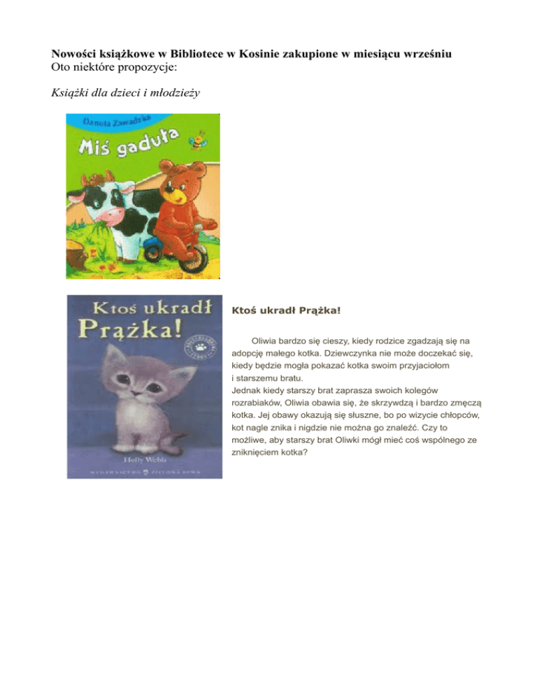 Nowości książkowe w Bibliotece w Kosinie zakupione w miesiącu wrześniu Oto niektóre propozycje: Książki dla dzieci i młodzieży Ktoś ukradł Prążka! Oliwia bardzo się cieszy, kiedy rodzice zgadzają się na adopcję małego kotka. Dziewczynka nie może doczekać się, kiedy będzie mogła pokazać kotka swoim przyjaciołom i starszemu bratu. Jednak kiedy starszy brat zaprasza swoich kolegów rozrabiaków, Oliwia obawia się, że skrzywdzą i bardzo zmęczą kotka. Jej obawy okazują się słuszne, bo po wizycie chłopców, kot nagle znika i nigdzie nie można go znaleźć. Czy to możliwe, aby starszy brat Oliwki mógł mieć coś wspólnego ze zniknięciem kotka? Koszmarny Karolek i cuchnąca bomba Koszmarny Karolek ma głowę pełną koszmarnych pomysłów, które pomagają mu zrealizować jego koleżanki i koledzy z klasy: Wredna Wandzia, Bezwzględny Bolo, Chciwy Henio i Muskularny Miecio. Wszystko psuje młodszy brat Karolka – Doskonały Damianek. Czy chcielibyście dowiedzieć się: – jak wygrać konkurs czytelniczy, nie czytając ani jednej książki? – jak zamienić grecką świątynię w rakietę kosmiczną? – jak skonstruować cuchnącą bombę? Figa tęskni za domem Główna bohaterka jest podekscytowana przenosinami do nowego domu na wieś. Nie może się doczekać, kiedy dołączy do niej jej suczka – labradorka. Rodzice postanowili, że suczkę na czas przeprowadzki wezmą do siebie dziadkowie. Dziewczynka i suczka nigdy jeszcze nie rozstawały się na tak długo. Dziewczynka okropnie tęskni za swoją małą przyjaciółką, a i suczka chciałaby już być w nowym domu swojej pani… Dziura w sercu Fusia czuje się niekochana i niepotrzebna. Mieszka w obcym mieście z oschłą i wciąż wpatrzoną w telewizor ciotką. Nie ma ani prawdziwej przyjaciółki, ani chłopaka. Nagle w życiu dziewczyny pojawia się pewien szczerbaty dzieciak i oskarżona o kradzież Hanka, szkolna czarna owca. A także Damian, gitarzysta zespołu rockowego. Czy Fusi wreszcie dopisze szczęście? Igrzyska Śmierci Po powodzi i innych kataklizmach, z Ameryki Północnej zostaje naprawdę niewiele. Ludzie głodują i walczą o przetrwanie. Władzę objął Kapitol, otoczony trzynastoma dystryktami, które dostarczają pożywienie, dobra materialne i surowce. Naród jednak nie jest zadowolony. Wybucha powstanie. Walka kończy się krwawą rzezią i zagładą trzynastego dystryktu, który nie chciał się poddać. Od tej pory każdego roku organizowane są głodowe igrzyska, do udziału w których losowane są dzieci pomiędzy dwunastym, a osiemnastym rokiem życia – z każdego okręgu, rok rocznie, chłopiec i dziewczynka. Jest to walka na śmierć i życie, ponieważ zwycięzca może być tylko jeden – reszta musi umrzeć. Literatura dla dorosłych Kwiaty na poddaszu Po tragicznej śmierci ojca w wypadku samochodowym czwórka rodzeństwa Dollangangerów i ich matka zmuszeni są szukać pomocy u dziadków. Ci niezwykle bogaci starzy ludzie, mieszkający w ogromnym domu, wyrzekli się córki z powodu jej małżeństwa z bliskim krewnym, a narodzone z tego związku dzieci uważają za przeklęte. W tajemnicy przed dziadkiem rodzeństwo zamieszkuje w pomieszczeniach na poddaszu, których nigdy nie opuszcza; jedynie matka jest łączniczką między nimi a światem. Dzieci żyją w strachu i niepewności, a zapowiadany przez matkę i babkę moment ujawnienia ich obecności nie nadchodzi. Odkrycie, jakiego dokonuje najstarszy brat, stawia rodzeństwo w obliczu grozy i zła, których istnienia nawet się nie domyślali... Płatki na wietrze Po tajemniczej śmierci jednego z braci rodzeństwo Dollangangerów decyduje się na ucieczkę z ponurego poddasza w domu dziadków, gdzie matka i babka więziły je przez blisko trzy i pół roku. Cathy, Chris i mała Carrie trafiają do domu doktora Paula Sheffielda, który - osamotniony po śmierci żony i syna - roztacza opiekę nad dziećmi. Wydaje się, że ich los się wreszcie odmienił i że każde z nich znalazło właściwą drogę w życiu. Jednak koszmary przeszłości nie dają się tak łatwo zapomnieć, a wiszące nad młodymi bohaterami rodzinne przekleństwo wciąż daje o sobie znać... A jeśli ciernie... Narratorem III części cyklu są dwaj synowie Cathy, Jory i Bart. Cathy i Chris żyją obecnie jako „żona” i „mąż” i wspólnie adoptują dziecko – Cindy. Jory uczy się tańca w balecie, natomiast Bart jest dzieckiem skrytym. Do domu obok wprowadza się starsza pani, która chce zachować anonimowość. Chłopcy są bardzo ciekawi, kim ona jest i zaczynają szpiegować w jej domu. W końcu starsza pani zaprasza do siebie chłopców. Bart staje się jej częstym gościem. Wkrótce dostaje od lokaja do przeczytania tajemniczy dziennik, który zmienia sposób myślenia małego chłopca... Odruch serca Najnowsza, poruszająca i nastrojowa powieść laureatki Nagrody Nobla i Nagrody Pulitzera, autorki Umiłowanej i Pieśni Salomonowej. Amerykańskie kolonie, schyłek XVII wieku. Szesnastoletnia Florence, czarnoskóra niewolnica, opowiada o swojej przeszłości. Odrzucona przez matkę, oddana jako ośmioletnie dziecko nowojorskiemu farmerowi, Jacobowi Vaarkowi, próbuje dojść przyczyny, dla której została potraktowana jak przedmiot przez najbliższą jej osobę. Historia dziewczyny splata się z opowieścią Rebeki, żony Vaarka, która po opuszczeniu Anglii, poślubieniu obcego mężczyzny i stracie kolejnych dzieci nie radzi sobie z życiem w nieprzychylnym jej środowisku. Mąż Rebeki wierzy, że obecność małej Florence pozwoli Rebece przezwyciężyć samotność. Blondynka na safari Wszystko co powinieneś wiedzieć o safari: Informacje praktyczne: pogoda i klimat, fotografowanie, zakupy, słownik języków suahili i afrikaans, obozowiska i hotele. Zdrowie: szczepienia, skaleczenia, ukąszenia, żółta febra, ameba, malaria i inne zagrożenia, o których trzeba wiedzieć; Bezpieczeństwo: bagaż podręc