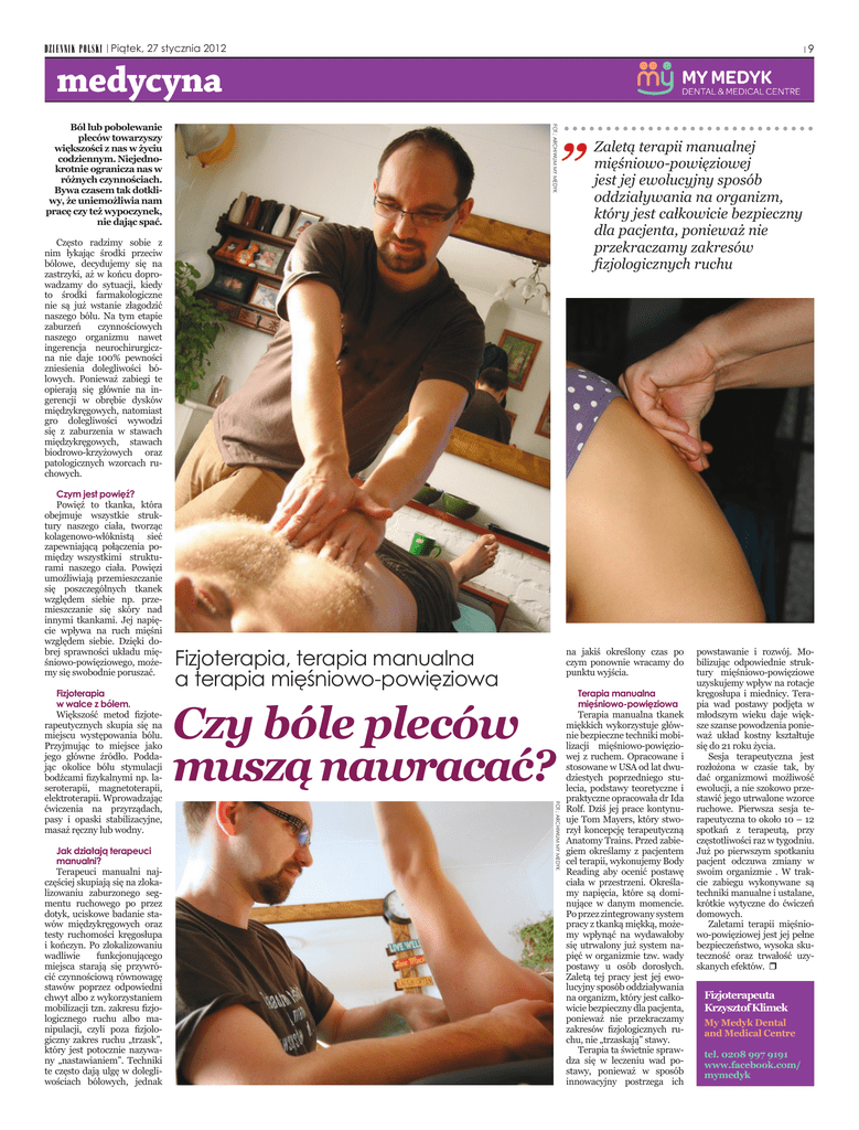 Piątek, 27 stycznia 2012 9 medycyna FOT.: ARCHIWUM MY MEDYK Ból lub pobolewanie pleców towarzyszy większości z nas w życiu codziennym. Niejednokrotnie ogranicza nas w różnych czynnościach. Bywa czasem tak dotkliwy, że uniemożliwia nam pracę czy też wypoczynek, nie dając spać. Często radzimy sobie z nim łykając środki przeciw bólowe, decydujemy się na zastrzyki, aż w końcu doprowadzamy do sytuacji, kiedy to środki farmakologiczne nie są już wstanie złagodzić naszego bólu. Na tym etapie zaburzeń czynnościowych naszego organizmu nawet ingerencja neurochirurgiczna nie daje 100% pewności zniesienia dolegliwości bólowych. Ponieważ zabiegi te opierają się głównie na ingerencji w obrębie dysków międzykręgowych, natomiast gro dolegliwości wywodzi się z zaburzenia w stawach międzykręgowych, stawach biodrowo-krzyżowych oraz patologicznych wzorcach ruchowych. Czym jest powięź? Powięź to tkanka, która obejmuje wszystkie struktury naszego ciała, tworząc kolagenowo-włóknistą sieć zapewniającą połączenia pomiędzy wszystkimi strukturami naszego ciała. Powięzi umożliwiają przemieszczanie się poszczególnych tkanek względem siebie np. przemieszczanie się skóry nad innymi tkankami. Jej napięcie wpływa na ruch mięśni względem siebie. Dzięki dobrej sprawności układu mięśniowo-powięziowego, możemy się swobodnie poruszać. Jak działają terapeuci manualni? Terapeuci manualni najczęściej skupiają się na zlokalizowaniu zaburzonego segmentu ruchowego po przez dotyk, uciskowe badanie stawów międzykręgowych oraz testy ruchomości kręgosłupa i kończyn. Po zlokalizowaniu wadliwie funkcjonującego miejsca starają się przywrócić czynnościową równowagę stawów poprzez odpowiedni chwyt albo z wykorzystaniem mobilizacji tzn. zakresu fizjologicznego ruchu albo manipulacji, czyli poza fizjologiczny zakres ruchu „trzask”, który jest potocznie nazywany „nastawianiem”. Techniki te często dają ulgę w dolegliwościach bólowych, jednak Zaletą terapii manualnej mięśniowo-powięziowej jest jej ewolucyjny sposób oddziaływania na organizm, który jest całkowicie bezpieczny dla pacjenta, ponieważ nie przekraczamy zakresów fizjologicznych ruchu na jakiś określony czas po czym ponownie wracamy do punktu wyjścia. Czy bóle pleców muszą nawracać? FOT.: ARCHIWUM MY MEDYK Fizjoterapia w walce z bólem. Większość metod fizjoterapeutycznych skupia się na miejscu występowania bólu. Przyjmując to miejsce jako jego główne źródło. Poddając okolice bólu stymulacji bodźcami fizykalnymi np. laseroterapii, magnetoterapii, elektroterapii. Wprowadzając ćwiczenia na przyrządach, pasy i opaski stabilizacyjne, masaż ręczny lub wodny. Fizjoterapia, terapia manualna a terapia mięśniowo-powięziowa „„ Terapia manualna mięśniowo-powięziowa Terapia manualna tkanek miękkich wykorzystuje głównie bezpieczne techniki mobilizacji mięśniowo-powięziowej z ruchem. Opracowane i stosowane w USA od lat dwudziestych poprzedniego stulecia, podstawy teoretyczne i praktyczne opracowała dr Ida Rolf. Dziś jej prace kontynuuje Tom Mayers, który stworzył koncepcję terapeutyczną Anatomy Trains. Przed zabiegiem określamy z pacjentem cel terapii, wykonujemy Body Reading aby ocenić postawę ciała w przestrzeni. Określamy napięcia, które są dominujące w danym momencie. Po przez zintegrowany system pracy z tkanką miękką, możemy wpłynąć na wydawałoby się utrwalony już system napięć w organizmie tzw. wady postawy u osób dorosłych. Zaletą tej pracy jest jej ewolucyjny sposób oddziaływania na organizm, który jest całkowicie bezpieczny dla pacjenta, ponieważ nie przekraczamy zakresów fizjologicznych ruchu, nie „trzaskają” stawy. Terapia ta świetnie sprawdza się w leczeniu wad postawy, ponieważ w sposób innowacyjny postrzega ich powstawanie i rozwój. Mobilizując odpowiednie struktury mięśniowo-powięziowe uzyskujemy wpływ na rotacje kręgosłupa i miednicy. Terapia wad postawy podjęta w młodszym wieku daje większe szanse powodzenia ponieważ układ kostny kształtuje się do 21 roku życia. Sesja terapeutyczna jest rozłożona w czasie tak, by dać organizmowi możliwość ewolucji, a nie szokowo przestawić jego utrwalone wzorce ruchowe. Pierwsza sesja terapeutyczna to około 10 – 12 spotkań z terapeutą, przy częstotliwości raz w tygodniu. Już po pierwszym spotkaniu pacjent odczuwa zmiany w swoim organizmie . W trakcie zabiegu wykonywane są techniki manualne i ustalane, krótkie wytyczne do ćwiczeń domowych. Zaletami terapii mięśniowo-powięziowej jest jej pełne bezpieczeństwo, wysoka skuteczność oraz trwałość uzyskanych efektów. r Fizjoterapeuta Krzysztof Klimek My Medyk Dental and Medical Centre tel. 0208 997 9191 www.facebook.com/ mymedyk