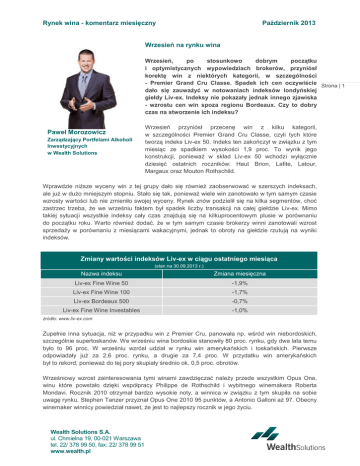 Rynek wina - komentarz miesięczny Październik 2013 Wrzesień na rynku wina Wrzesień, po stosunkowo dobrym początku i optymistycznych wypowiedziach brokerów, przyniósł korektę win z niektórych kategorii, w szczególności - Premier Grand Cru Classe. Spadek ich cen oczywiście Strona | 1 dało się zauważyć w notowaniach indeksów londyńskiej giełdy Liv-ex. Indeksy nie pokazały jednak innego zjawiska - wzrostu cen win spoza regionu Bordeaux. Czy to dobry czas na stworzenie ich indeksu? Paweł Morozowicz Zarządzający Portfelami Alkoholi Inwestycyjnych w Wealth Solutions Wrzesień przyniósł przecenę win z kilku kategorii, w szczególności Premier Grand Cru Classe, czyli tych które tworzą indeks Liv-ex 50. Indeks ten zakończył w związku z tym miesiąc ze spadkiem wysokości 1,9 proc. To wynik jego konstrukcji, ponieważ w skład Liv-ex 50 wchodzi wyłącznie dziesięć ostatnich roczników: Haut Brion, Lafite, Latour, Margaux oraz Mouton Rothschild. Wprawdzie niższe wyceny win z tej grupy dało się również zaobserwować w szerszych indeksach, ale już w dużo mniejszym stopniu. Stało się tak, ponieważ wiele win zanotowało w tym samym czasie wzrosty wartości lub nie zmieniło swojej wyceny. Rynek znów podzielił się na kilka segmentów, choć zastrzec trzeba, że we wrześniu faktem był spadek liczby transakcji na całej giełdzie Liv-ex. Mimo takiej sytuacji wszystkie indeksy cały czas znajdują się na kilkuprocentowym plusie w porównaniu do początku roku. Warto również dodać, że w tym samym czasie brokerzy winni zanotowali wzrost sprzedaży w porównaniu z miesiącami wakacyjnymi, jednak to obroty na giełdzie rzutują na wyniki indeksów. Zmiany wartości indeksów Liv-ex w ciągu ostatniego miesiąca (stan na 30.09.2013 r.) Nazwa indeksu Zmiana miesięczna Liv-ex Fine Wine 50 -1,9% Liv-ex Fine Wine 100 -1,7% Liv-ex Bordeaux 500 -0,7% Liv-ex Fine Wine Investables -1,0% źródło: www.liv-ex.com Zupełnie inna sytuacja, niż w przypadku win z Premier Cru, panowała np. wśród win niebordoskich, szczególnie supertoskanów. We wrześniu wina bordoskie stanowiły 80 proc. rynku, gdy dwa lata temu było to 96 proc. W wrześniu wzrósł udział w rynku win amerykańskich i toskańskich. Pierwsze odpowiadały już za 2,6 proc. rynku, a drugie za 7,4 proc. W przydatku win amerykańskich był to rekord, ponieważ do tej pory skupiały średnio ok. 0,5 proc. obrotów. Wrześniowy wzrost zainteresowania tymi winami zawdzięczać należy przede wszystkim Opus One, winu które powstało dzięki współpracy Philippe de Rothschild i wybitnego winemakera Roberta Mondavi. Rocznik 2010 otrzymał bardzo wysokie noty, a winnica w związku z tym skupiła na sobie uwagę rynku. Stephen Tanzer przyznał Opus One 2010 95 punktów, a Antonio Galloni aż 97. Obecny winemaker winnicy powiedział nawet, że jest to najlepszy rocznik w jego życiu. Wealth Solutions S.A. ul. Chmielna 19, 00-021 Warszawa tel. 22/ 378 99 50, fax: 22/ 378 99 51 www.wealth.pl Rynek wina - komentarz miesięczny Październik 2013 Wrzesień był również dobrym miesiącem dla win włoskich. Cały czas można było dostrzec skutek przyznania pozytywnych not Sassicai z rocznika 2010. Wino to stało się najpopularniejszym trunkiem wśród supertoskanów. Jednak dało się zauważyć wzmożony ruch również na starszych rocznikach pochodzących z tej winnicy (2001, 2005, 2006, 2008, czy 2009). Podobna sytuacja panowała także na rynku szampanów. Z tego też powodu to właśnie wina niebordoskie po raz kolejny zdominowały zastawienie najszybciej drożejących win w danym miesiącu. Taka sytuacja jest również powodem naszej rekomendacji, by uzupełniać obecnie portfele takimi właśnie trunkami. Pięć najszybciej drożejących win we wrześniu 2013 r. Wino Rocznik Średnia cena we wrześniu 2013 r. (GBP)* Ornellaia 2005 1 454 12,6% Sassicaia 2001 1 500 11,1% Ducru Beaucaillou 2001 812 10,6% Krug, Clos Mesnil 1985 12 612 10,4% Lafite Rothschild 1997 5 463 6,0% źródło: www.liv-ex.com Wzrost ceny *za 12-butelkową skrzynkę Zbiory w Bordeaux Ważnym wydarzaniem na rynku wina są zawsze zbiory w Bordeaux. Już teraz możemy powiedzieć, że w 2013 r. pogoda nie sprzyjała producentom i nie zapewniła warunków do powstania rocznika wybitnego. Nie oznacza to jednak, że wśród win z 2013 r. nie będzie win, które będą posiadały wysoką jakość. Można się spodziewać, że będzie to - podobnie jak w przypadku roczników 2011 i 2012 - rocznik winemakerów. To od ich umiejętności i doświadczenia zależeć będzie finalny kształt poszczególnych win. Taka sytuacja może zaowocować kilkoma ciekawymi pozycjami, które będzie można wykorzystać inwestycyjnie. Zastrzec jednak trzeba, że dopiero na wiosnę przyszłego roku poznamy pierwsze opinie krytyków na temat rocznika 2013. Jedna rzecz już jest pewna. W Bordeaux zbiory będą bardzo niskie. Zimny maj (najchłodniejszy od dekady) był przyczyną późniejszego rozwoju kwiatów i winogron oraz w efekcie późnych i małych zbiorów. Według wstępnych danych zbiory będę najmniejsze od ok. 20 lat. Oznacza to, że na rynek wypuczona będzie również mniejsza ilość wina. Jaki może mieć to skutek dla rynku wina w dłuższej perspektywie? W Bordeaux będziemy mieli do czynienia najprawdopodobniej z trzema wyprodukowanymi pod rząd rocznikami, których z pewnością nie można zaliczyć do wybitnych (2011, 2012, 2013). To może z kolei przełożyć się na wzrost zainteresowania dwoma ostatnimi wielkim rocznikami znad Żyrondy, czyli 2009 i 2010, które już teraz są najczęściej kupowanymi w segmencie win Bordeaux. Wealth Solutions S.A. ul. Chmielna 19, 00-021 Warszawa tel. 22/ 378 99 50, fax: 22/ 378 99 51 www.wealth.pl Strona | 2 Rynek wina - komentarz miesięczny Październik 2013 Wino miesiąca Petrus, Pomerol Z pierwszymi sukcesami posiadłości związana jest rodzina Arnaud, która stała się właścicielem tego majątku 