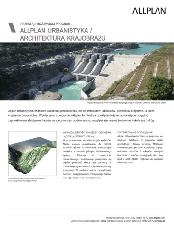 PRZEGLĄD MOŻLIWOŚCI PROGRAMU ALLPLAN URBANISTYKA / ARCHITEKTURA KRAJOBRAZU Project: Hydroelectric Power Plant Middle Marsyangdi, Nepal, Constructor DYWIDAG International GmbH Allplan Urbanistyka/architektura krajobrazu przeznaczony jest do architektów, urbanistów i architektów krajobrazu, a także inżynierów budownictwa. W połączeniu z programem Allplan Architektura czy Allplan Inżynieria, inwestycje mogą być zaprojektowane efektywnie, bazując na rzeczywistym modelu terenu, uwzględniając rozwój środowiska i okolicznych dróg WSPÓŁZALEŻNOŚĆ POMIĘDZY INŻYNIERIĄ ZINTEGROWANE ROZWIĄZANIE LĄDOWĄ A STRUKTURALNĄ Allplan Urbanistyka/architektura krajobrazu jest W przeciwieństwie do wielu innych systemów, idealnym dodatkiem do programu Allplan Allplan potrzeb Architektura i Allplan Inżynieria. Możliwości inżynierii lądowej i strukturalnej wykorzystując stosowania począwszy od wizualizacji, poprzez narzędzia w ramach jednego, zintegrowanego obliczenia nasypów / wykopów ziemnych, systemu. wspiera projektowanie dla konieczność tworzenie z planów sytuacyjnych ulic, dróg, czasochłonnego i kosztownego przełączania się rond i stref (Allplan Highway) do projektów między systemami, skraca czas potrzebny na urbanistycznych. Eliminuje to poznanie oprogramowania i optymalizuje procesy koordynacji. W rezultacie można zaprojektować budynki z uwzględnieniem rzeczywistego terenu, Project: Dam project in Macedonia, Jörg Selbmann CAD-Management, Finsing, Germany wymogów środowiska i okolicznych dróg. Obszerne informacje, wideo, oraz raporty na www.allplan.com Jeśli są Panstwo zainteresowani, proszę skontaktować się z lokalnym partnerem handlowym www.kge.pl Cyfrowy Model Terenu Allplan Urbanistyka/architektura krajobrazu pozwala na łatwe tworzenie cyfrowych modeli terenu i skartografowanie ich realistyczną kartografię. Cyfrowy model terenu jest podstawą projektów, prezentacji, ilości robót ziemnych oraz ich wizualizacji. Podstawę d tego stanowią współrzędne punktów, które można importować i eksportować w różnych formatach (np. REB, ASCII). Możliwe jest również wykorzystanie współrzędnych Gaussa-Krügera. Cyfrowy modelu terenu uwzględnia także zewnętrzne granice, linie przerwy i wgłębienia. Trasy mogą być generowane ze stałymi lub zmiennymi pochyłościami. Mapowanie odbywa się przy użyciu siatki punktów z dokładnym opisem punktów wysokościowych. Można wygenerować przekroje podłużne i poprzeczne wzdłuż trasy. Możliwe są także obliczenia nasypów i wykopów (bilans mas ziemnych). Atrakcyjne plany sytuacyjne Można użyć potężnych narzędzi Allplan do tworzenia prezentacji inżynierii lądowej i strukturalnej, planów urbanistycznych oraz architektury krajobrazu i projektów dróg. W rezultacie, można tworzyć obszary kreskowania, linie wzorów, kolory i cienie oraz folie zawierające mapy bitowe i przekonujące wizualizacje. Można również zapisać zeskanowane dokumenty i zdjęcia lotnicze oraz opracować przez trzypunktowe wyrównanie. Plany urbanistyczne oraz projektowanie pomieszczeń Można tworzyć plany zagospodarowania przestrzennego z funkcjami w zakresie planowania urbanistycznego i projektowania pomieszczeń. Można tworzyć pojemne modele z działek i inteligentnych konstrukcji budowlanych, stosując różne formy dachu i pokazujących swój układ obszarów. Można otrzymywać zestawienia powierzchni lub objętości budynku, ilości kondygnacji.. Architektura krajobrazu Do projektowania zagospodarowania terenów zielonych i ogrodów, tworzy się schematy roślinne wprowadzające rośliny na wiele różnych sposobów, używając trasy dróg i rysunków drzew. Można otrzymywać zestawienia, legendy i ilości roślin. Projekt drogi Klotoidy i funkcje do sprawnego projektowania niwelety drogi z definiowaną ilością stacji i przekrojów poprzecznych. Z cyfrowego modelu terenu można otrzymać profil drogi, jak również tory skrętu i przekroje poprzeczne ze skarpami. Obiekty mostowe Dla potrzeb projektowania obiektów mostowych dostępny jest specjalistyczny moduł do projektowania mostów, tuneli, estakad, przepustów, ramp, zapór i kanałów. Trójwymiarowa krzywa jest generowana z pierwszego planu budowy, która może być przypisany każdemu przekrojowi, biorąc pod uwagę nachylenie poprzeczne. To tworzy bardzo złożony trójwymiarowy model, który może być używany jako wiarygodna podstawa dla projektu i konstrukcji żelbetowych. Projektowanie ronda Allplan Urbanistyka / architektura krajobrazu wspomaga również projektowanie rond. Podstawowa geometria ronda jest generowana jest na podstawie kilku parametrów, takich jak rodzaj jezdni, szerokość jezdni, promienie skrętu i położenie zjazdów. Realistycznych symulacja krzywej skrętu Dostępne jest specjalne narzędzie krzywej skrętu, dzięki któremu można sprawdzić funkcjonalność ronda, skrzyżowania, zjazdów łuków róg. To pozwala na wykonywanie symulacji realistycznych tras dla różnych samochodów, ciężarówek i autobusów w sytuacjach krytycznych. AKTUALNE WYMAGANIA SYSTEMOWE DOSTĘPNE SĄ NA WWW.ALLPLAN.COM/INFO/SYSINFO OSIĄGNIJ WIĘCEJ Z ALLPLAN – UMOWA SERWISOWA PLUS! Minimalne wymagania systemowe: - karta graficzna z pamięcią 1 GB RAM - system Windows 64Bit. W ramach Umowy serwisowej plus oprócz naszych usług oferujemy dodatkowo ciągłą aktualizację programu Allplan więcej informacji na: http://kge.pl KGE Sp. z.o.o. Sp. k. ul. Krokwi 32 lok.25 Tel +48 22 300 25 00 03-114 WARSZAWA Fax +48 22 300 25 01 www.kge.pl © 07.2016 Allplan GmbH, Munich, Germany PRZEGLĄD MOŻLIWOŚCI ALLPLAN URBANISTYKA
