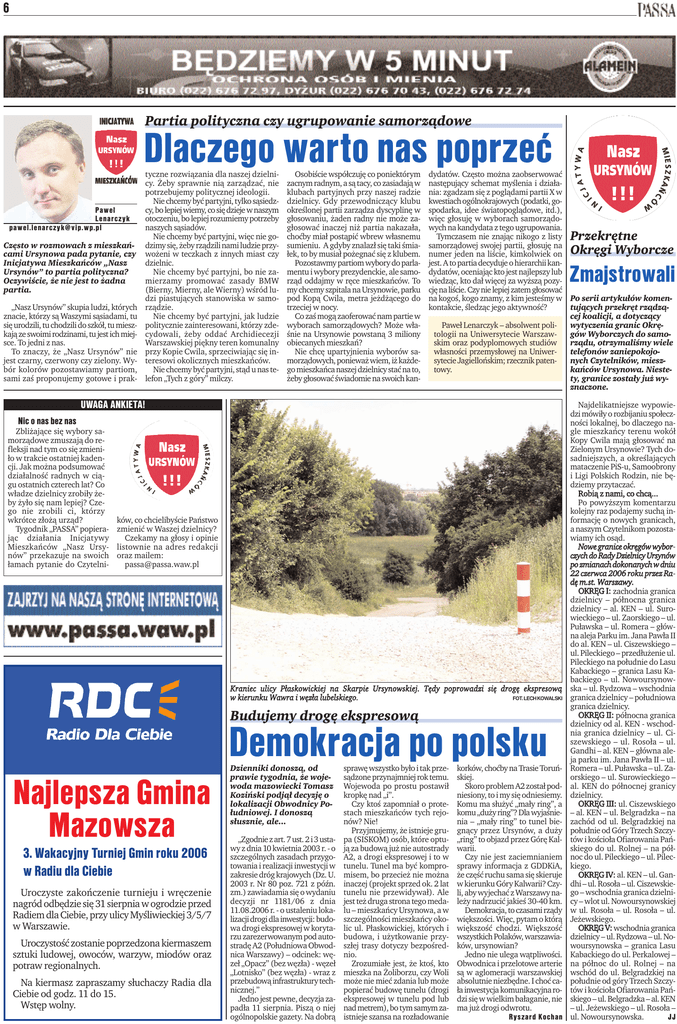 6 Partia polityczna czy ugrupowanie samorządowe Dlaczego warto nas poprzeć Paweł Lenarczyk [email protected] Często w rozmowach z mieszkańcami Ursynowa pada pytanie, czy Inicjatywa Mieszkańców „Nasz Ursynów” to partia polityczna? Oczywiście, że nie jest to żadna partia. „Nasz Ursynów” skupia ludzi, których znacie, którzy są Waszymi sąsiadami, tu się urodzili, tu chodzili do szkół, tu mieszkają ze swoimi rodzinami, tu jest ich miejsce. To jedni z nas. To znaczy, że „Nasz Ursynów” nie jest czarny, czerwony czy zielony. Wybór kolorów pozostawiamy partiom, sami zaś proponujemy gotowe i prak- tyczne rozwiązania dla naszej dzielnicy. Żeby sprawnie nią zarządzać, nie potrzebujemy politycznej ideologii. Nie chcemy być partyjni, tylko sąsiedzcy, bo lepiej wiemy, co się dzieje w naszym otoczeniu, bo lepiej rozumiemy potrzeby naszych sąsiadów. Nie chcemy być partyjni, więc nie godzimy się, żeby rządzili nami ludzie przywożeni w teczkach z innych miast czy dzielnic. Nie chcemy być partyjni, bo nie zamierzamy promować zasady BMW (Bierny, Mierny, ale Wierny) wśród ludzi piastujących stanowiska w samorządzie. Nie chcemy być partyjni, jak ludzie politycznie zainteresowani, którzy zdecydowali, żeby oddać Archidiecezji Warszawskiej piękny teren komunalny przy Kopie Cwila, sprzeciwiając się interesowi okolicznych mieszkańców. Nie chcemy być partyjni, stąd u nas telefon „Tych z góry” milczy. Osobiście współczuję co poniektórym zacnym radnym, a są tacy, co zasiadają w klubach partyjnych przy naszej radzie dzielnicy. Gdy przewodniczący klubu określonej partii zarządza dyscyplinę w głosowaniu, żaden radny nie może zagłosować inaczej niż partia nakazała, choćby miał postąpić wbrew własnemu sumieniu. A gdyby znalazł się taki śmiałek, to by musiał pożegnać się z klubem. Pozostawmy partiom wybory do parlamentu i wybory prezydenckie, ale samorząd oddajmy w ręce mieszkańców. To my chcemy szpitala na Ursynowie, parku pod Kopą Cwila, metra jeżdżącego do trzeciej w nocy. Co zaś mogą zaoferować nam partie w wyborach samorządowych? Może właśnie na Ursynowie powstaną 3 miliony obiecanych mieszkań? Nie chcę upartyjnienia wyborów samorządowych, ponieważ wiem, iż każdego mieszkańca naszej dzielnicy stać na to, żeby głosować świadomie na swoich kan- dydatów. Często można zaobserwować następujący schemat myślenia i działania: zgadzam się z poglądami partii X w kwestiach ogólnokrajowych (podatki, gospodarka, idee światopoglądowe, itd.), więc głosuję w wyborach samorządowych na kandydata z tego ugrupowania. Tymczasem nie znając nikogo z listy Przekrętne samorządowej swojej partii, głosuję na numer jeden na liście, kimkolwiek on Okręgi Wyborcze jest. A to partia decyduje o hierarchii kandydatów, oceniając kto jest najlepszy lub wiedząc, kto dał więcej za wyższą pozycję na liście. Czy nie lepiej zatem głosować na kogoś, kogo znamy, z kim jesteśmy w Po serii artykułów komentujących przekręt rządząkontakcie, śledząc jego aktywność? cej koalicji, a dotyczący wytyczenia granic OkręPaweł Lenarczyk – absolwent poligów Wyborczych do samotologii na Uniwersytecie Warszawrządu, otrzymaliśmy wiele skim oraz podyplomowych studiów telefonów zaniepokojowłasności przemysłowej na Uniwernych Czytelników, mieszsytecie Jagiellońskim; rzecznik patenkańców Ursynowa. Niestetowy. ty, granice zostały już wyznaczone. Zmajstrowali UWAGA ANKIETA! Nic o nas bez nas Zbliżające się wybory samorządowe zmuszają do refleksji nad tym co się zmieniło w trakcie ostatniej kadencji. Jak można podsumować działalność radnych w ciągu ostatnich czterech lat? Co władze dzielnicy zrobiły żeby żyło się nam lepiej? Czego nie zrobili ci, którzy wkrótce złożą urząd? Tygodnik „PASSA” popierając działania Inicjatywy Mieszkańców „Nasz Ursynów” przekazuje na swoich łamach pytanie do Czytelni- ków, co chcielibyście Państwo zmienić w Waszej dzielnicy? Czekamy na głosy i opinie listownie na adres redakcji oraz mailem: [email protected] Kraniec ulicy Płaskowickiej na Skarpie Ursynowskiej. Tędy poprowadzi się drogę ekspresową w kierunku Wawra i węzła lubelskiego. FOT. LECH KOWALSKI Budujemy drogę ekspresową Demokracja po polsku Najlepsza Gmina Mazowsza 3. Wakacyjny Turniej Gmin roku 2006 w Radiu dla Ciebie Uroczyste zakończenie turnieju i wręczenie nagród odbędzie się 31 sierpnia w ogrodzie przed Radiem dla Ciebie, przy ulicy Myśliwieckiej 3/5/7 w Warszawie. Uroczystość zostanie poprzedzona kiermaszem sztuki ludowej, owoców, warzyw, miodów oraz potraw regionalnych. Na kiermasz zapraszamy słuchaczy Radia dla Ciebie od godz. 11 do 15. Wstęp wolny. Dzienniki donoszą, od prawie tygodnia, że wojewoda mazowiecki Tomasz Koziński podjął decyzję o lokalizacji Obwodnicy Południowej. I donoszą słusznie, ale... „Zgodnie z art. 7 ust. 2 i 3 ustawy z dnia 10 kwietnia 2003 r. - o szczególnych zasadach przygotowania i realizacji inwestycji w zakresie dróg krajowych (Dz. U. 2003 r. Nr 80 poz. 721 z późn. zm.) zawiadamia się o wydaniu decyzji nr 1181/06 z dnia 11.08.2006 r. - o ustaleniu lokalizacji drogi dla inwestycji: budowa drogi ekspresowej w korytarzu zarezerwowanym pod autostradę A2 (Południowa Obwodnica Warszawy) – odcinek: węzeł „Opacz” (bez węzła) - węzeł „Lotnisko” (bez węzła) - wraz z przebudową infrastruktury technicznej.” Jedno jest pewne, decyzja zapadła 11 sierpnia. Piszą o niej ogólnopolskie gazety. Na dobrą sprawę wszystko było i tak przesądzone przynajmniej rok temu. Wojewoda po prostu postawił kropkę nad „i”. Czy ktoś zapomniał o protestach mieszkańców tych rejonów? Nie! Przyjmujemy, że istnieje grupa (SISKOM) osób, które optują za budową już nie autostrady A2, a drogi ekspresowej i to w tunelu. Tunel ma być kompromisem, bo przecież nie można inaczej (projekt