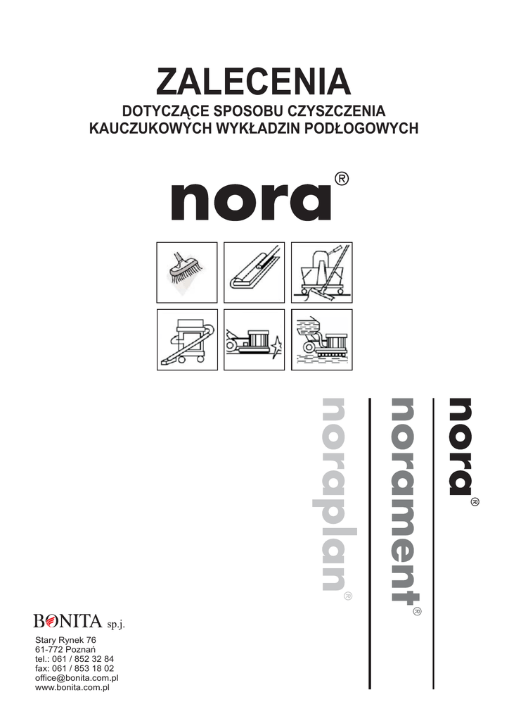 ZALECENIA DOTYCZ¥CE SPOSOBU CZYSZCZENIA KAUCZUKOWYCH WYK£ADZIN POD£OGOWYCH Stary Rynek 76 61-772 Poznañ tel.: 061 / 852 32 84 fax: 061 / 853 18 02 [email protected] www.bonita.com.pl Zalecenia dotycz¹ce sposobów czyszczenia Spis treœci Str. 1. Uwagi ogólne 1.1 Uwagi ogólne 1.2 Œrodki redukuj¹ce pojawianie siê brudu 1.3 Rodzaje czyszczenia 3 3 3 3 2. Standardowe zalecenia 2.1 Wstêpna konserwacja / zabezpieczanie 2.2 Regularna konserwacja / czyszczenie 4 5 5 3. Czyszczenie obszarów o specyficznych wymaganiach 3.1 S³u¿ba zdrowia 3.2 Pomieszczenia o zaostrzonych wymogach utrzymania czystoœci 3.3 Pod³ogi unoszone 3.4 Sale sportowe i wielofunkcyjne 7 7 8 9 9 4. Œrodki czyszcz¹ce i poleruj¹ce 4.1 Produkty do czyszczenia i konserwacji 4.2 Produkty do czyszczenia dla prywatnych u¿ytkowników 4.3 Specjalne produkty czyszcz¹ce 4.4 Specjalne œrodki czyszcz¹ce 11 12 13 13 13 5. Usuwanie plam 5.1 Plamy po substancjach powszechnie stosowanych 5.2 Plamy po zaschniêtych lekach 14 14 15 6. Zalecenia dotycz¹ce czyszczenia pokryæ sto³owych norastat ® 16 7. Zalecenia dot. wstêpnego czyszczenia, wstêpnego polerowania i rutynowych zabiegów czyszcz¹cych ®dla wyk³adzin kauczukowych ® ® ® noraplan /ecoplan oraz norament /ecoment 16 8. Zalecenia dot. wstêpnego czyszczenia, wstêpnego polerowania i rutynowych zabiegów czyszcz¹cych dla pod³óg unoszonych ® i bezspoinowych p³ytek elastycznych noraplan 17 ® 9. Dodatek dla wyk³adzin noraplan z g³adk¹ powierzchni¹ polerowanie na wysokich obrotach. 2 18 1. Uwagi ogólne 1.1. Uwagi ogólne Jeœli zamierzaj¹ Pañstwo stosowaæ odrêbne metody czyszczenia, nieuwzglêdnione w niniejszej instrukcji oraz w przypadku wyst¹pienia specyficznych warunków pracy, nale¿y przeprowadziæ szereg testów sprawdzaj¹cych we w³asnym zakresie, które pomog¹ sprawdziæ, czy sposoby czyszczenia, œrodki i maszyny, które zamierzaj¹ Pañstwo stosowaæ, spe³niaj¹ specjalne wymagania. Nale¿y upewniæ siê, ¿e ¿adne z zastosowanych œrodków ani procesów czyszczenia nie spowoduj¹ efektów przeciwnych do zamierzonych w stosunku do wyk³adzin i ich w³aœciwoœci. 1.2. Œrodki redukuj¹ce pojawianie siê brudu Rozleg³e strefy wy³apywania brudu przed wejœciem oraz strefy wycieraczek w obszarze wejœciowym skutecznie redukuj¹ brud. 1.3. Rodzaje czyszczenia Czyszczenie wstêpne Wszystkie wyk³adziny kauczukowe typu nora® zosta³y w procesie produkcji pokryte specjaln¹ warstw¹ ochronn¹, stanowi¹c¹ zabezpieczenie przed lekkimi zabrudzeniami w fazie instalacji. W zwi¹zku z powy¿szym istnieje koniecznoœæ usuniêcia tej warstwy kryj¹cej, przy pomocy intensywnego lub zasadniczego œrodka czyszcz¹cego. Mo¿liwe procedury zastosowania Maszyny i sprzêt Czyszczenie rêczne przy u¿yciu skrobaka lub mopa (np. Vileda® Padboy/Padmaster). Czyszczenie przy u¿yciu maszyny jednodyskowej lub odkurzacza wodnego. Wstêpne polerowanie wyk³adziny przy u¿yciu œrodka czyszcz¹cego w sprayu. 3 Polerowanie wstêpne kauczukowych wyk³adzin pod³ogowych typu nora. Zastosowanie œrodków pielêgnuj¹cych obni¿a podatnoœæ na zabrudzenia, u³atwia póŸniejsze rutynowe czyszczenie i zabezpiecza wyk³adzinê przed drobnymi uszkodzeniami mechanicznymi (co w efekcie przed³u¿y czas ich u¿ytkowania). Procedura wstêpnego polerowania musi zostaæ poprzedzona czyszczeniem wstêpnym/ochronnym. W zale¿noœci od typu obuwia, podczas chodzenia po wyk³adzinach elastycznych mog¹ pojawiaæ siê dŸwiêki. Piszczenie mo¿na zredukowaæ lub wyeliminowaæ przy pomocy odpowiednio dobranych produktów konserwuj¹cych /zabezpieczaj¹cych w odpowiednim stê¿eniu. Intensywne czyszczenie poœrednie/podstawowe wyk³adzin kauczukowych nora® Celem intensywnego czyszczenia poœredniego jest usuwanie silnych zabrudzeñ od czasu do czasu. Czyszczenie rutynowe wyk³adzin kauczukowych nora® Czyszczenie rêczne: Dobre rezultaty czyszczenia osi¹gniemy stosuj¹c dwuetapowe przecieranie powierzchni przy pomocy p³askiego mopa / œcierki (system z³o¿ony z dwóch mopów i ruchomego uchwytu) lub specjalnego jednoetapowego systemu, takiego jak system SWEP Vileda, oraz odpowiednie œrodki myj¹ce/poleruj¹ce. Tradycyjne mopy ze sznurka mog¹ zostaæ równie¿ u¿yte, jednak s¹ wolniejsze, mniej efektywne i wymagaj¹ wiêcej wysi³ku ni¿ systemy mopów p³askich. Przy u¿yciu maszyny: Czyszczenie automatyczne jest zalecane dla du¿ych, nieskomplikowanych powierzchni. W tym celu u¿ywa siê specjalnych maszyn czyszcz¹cych, zgodnie z zaleceniami producentów œrodków czyszcz¹cych. W celu otrzymania równej i zbitej warstwy ochronnej, wyk³adzina powinna byæ polerowana zgodnie z zaleceniami. 2. Standardowe Zalecenia Wa¿na informacja W celu usuniêcia niezwi¹zanego brudu nale¿y u¿yæ szczotek, maszyn zamiataj¹cych, odkurzacza lub mokrego mopa. Rozcieñczyæ wod¹ rekomendowany intensywny œrodek czyszcz¹cy, zgodnie z zaleceniami producenta i rozprowadziæ go przy pomocy jednodyskowej maszyny czyszcz¹cej z czerwonym padem/szczotk¹ œredni¹ do twardej, upewniaj¹c siê, ze œrodek jest rozprowadzany równomiernie na ca³ym obszarze. Jeœli intensywny œrodek czyszcz¹cy nie jest dostêpny, mo¿na równie¿ Zastosowaæ odpowiedni œrodek podstawowy. 4 Po pozostawieniu powierzchni na 15 min do wyschniêcia, czyœciæ intensywnie przy pomocy jednodyskowej maszyny czyszcz¹cej. Wa¿ne: jeœli u¿ywamy podstawowego œrodka czyszcz¹cego, nie wolno pozwoliæ by wysech³. U¿yæ odkurzacza, aby usun¹æ brudny roztwór detergentu. Powierzchnia wyk³adziny musi byæ wolna od resztek brudu. Jeœli u¿yliœmy intensywnych œrodków czyszcz¹cych i konserwuj¹cych do czyszczenia / zabezpieczania wstêpnego, nie ma koniecznoœci zmywania powierzchni czyst¹ wod¹. Jednak, jeœli u¿yliœmy podstawowego œrodka czyszcz¹cego, wyk³adzinê trzeba zmyæ przy u¿yciu czystej wody. 2.1 Wstêpna konserwacja / zabezpieczanie U¿yæ delikatnego mopa czyszcz¹cego, aby równomiernie r
