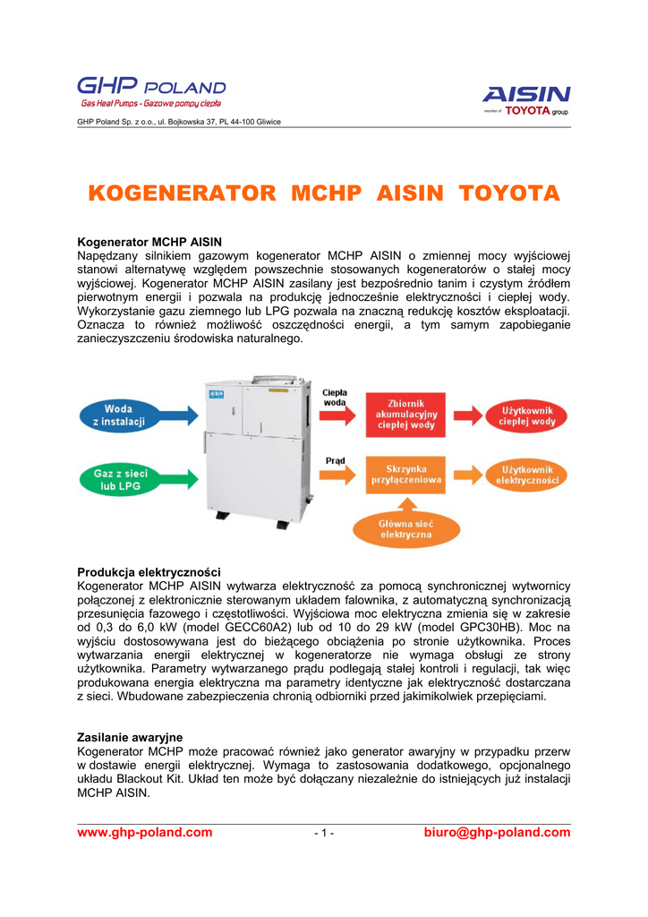 GHP Poland Sp. z o.o., ul. Bojkowska 37, PL 44-100 Gliwice KOGENERATOR MCHP AISIN TOYOTA Kogenerator MCHP AISIN Napędzany silnikiem gazowym kogenerator MCHP AISIN o zmiennej mocy wyjściowej stanowi alternatywę względem powszechnie stosowanych kogeneratorów o stałej mocy wyjściowej. Kogenerator MCHP AISIN zasilany jest bezpośrednio tanim i czystym źródłem pierwotnym energii i pozwala na produkcję jednocześnie elektryczności i ciepłej wody. Wykorzystanie gazu ziemnego lub LPG pozwala na znaczną redukcję kosztów eksploatacji. Oznacza to również możliwość oszczędności energii, a tym samym zapobieganie zanieczyszczeniu środowiska naturalnego. Produkcja elektryczności Kogenerator MCHP AISIN wytwarza elektryczność za pomocą synchronicznej wytwornicy połączonej z elektronicznie sterowanym układem falownika, z automatyczną synchronizacją przesunięcia fazowego i częstotliwości. Wyjściowa moc elektryczna zmienia się w zakresie od 0,3 do 6,0 kW (model GECC60A2) lub od 10 do 29 kW (model GPC30HB). Moc na wyjściu dostosowywana jest do bieżącego obciążenia po stronie użytkownika. Proces wytwarzania energii elektrycznej w kogeneratorze nie wymaga obsługi ze strony użytkownika. Parametry wytwarzanego prądu podlegają stałej kontroli i regulacji, tak więc produkowana energia elektryczna ma parametry identyczne jak elektryczność dostarczana z sieci. Wbudowane zabezpieczenia chronią odbiorniki przed jakimikolwiek przepięciami. Zasilanie awaryjne Kogenerator MCHP może pracować również jako generator awaryjny w przypadku przerw w dostawie energii elektrycznej. Wymaga to zastosowania dodatkowego, opcjonalnego układu Blackout Kit. Układ ten może być dołączany niezależnie do istniejących już instalacji MCHP AISIN. www.ghp-poland.com -1- [email protected] GHP Poland Sp. z o.o., ul. Bojkowska 37, PL 44-100 Gliwice Produkcja ciepłej wody W kogeneratorze MCHP AISIN realizowany jest odzysk ciepła zarówno z układu chłodzenia silnika jaki i ze spalin. Maksymalna moc cieplna na wyjściu z urządzenia wynosi 11,7 kW (model GECC60A2) lub 51,8 kW (model GPC30HB). Zapewnione w tym układzie parametry przepływu wody grzewczej przedstawione zostały w tabeli z danymi technicznymi. Wyprodukowana gorąca woda może zostać zastosowana w szeregu aplikacji: ogrzewanie budynków, ogrzewanie basenów, dostarczanie dodatkowego ciepła do kanałów powietrznych, ciepła woda użytkowa, etc. Możliwość wykorzystania urządzenia do jednoczesnej produkcji elektryczności i ciepła jest cechą wyróżniającą kogenerator MCHP AISIN. Oznacza to możliwość redukcji kosztów eksploatacji o 30% w porównaniu z układem, gdzie obie te energie są kupowane oddzielnie. Możliwe zastosowania Kogeneratory MCHP AISIN mogą być zainstalowane w łatwy i szybki sposób. Jako że urządzenia o mniejszej mocy (model GECC60A2) mają maksymalnie zredukowane gabaryty (110×66×150 cm), mogą one z łatwością być montowane w otoczeniu istniejących już obiektów. Pracując równolegle z sieciową dostawą energii elektrycznej, urządzenia MCHP AISIN gwarantują maksymalną elastyczność mocy wyjściowej i ograniczenie kosztów eksploatacji. Urządzenia mogą być stosowane w każdego rodzaju obiektach mieszkalnych i użytecznych. Jednostki MCHP mogą być łączone w baterie i zapewnić moc elektryczną do 300 kW, przez co kogeneratory MCHP AISIN mogą być z powodzeniem stosowane zarówno w budynkach mieszkalnych jak i w dużych obiektach użytkowych bądź przemysłowych. Jako że istnieje możliwość odprowadzania spalin przedłużonymi przewodami, oraz ze względu na cichą pracę urządzenia, możliwa jest instalacja bezpośrednio przy budynkach i w obszarach gęsto zabudowanych. Zredukowany ciężar urządzenia o mniejszej mocy (465 kg) umożliwia ponadto instalację MCHP na dachach budynków. www.ghp-poland.com -2- [email protected] GHP Poland Sp. z o.o., ul. Bojkowska 37, PL 44-100 Gliwice Silnik AISIN TOYOTA Kogeneratory MCHP AISIN napędzane są gazowymi silnikami spalinowymi o wysokiej trwałości, zaprojektowanymi w Laboratoriach Badawczo-Rozwojowych Toyota specjalnie z przeznaczeniem do tego zastosowania. W przypadku modelu GECC60A2 jest to chłodzona wodą, czterosuwowa, trzycylindrowa jednostka o pojemności 952 cm 3, natomiast w przypadku modelu GPC30HB są to dwa silniki chłodzone wodą, czterosuwowe, czterocylindrowe, każdy o pojemności 2237 cm3. Regularny przegląd kogeneratora musi być wykonywany po każdych 10.000 godzinach pracy urządzenia (co 5 lat). Wymiana oleju i regulacja silnika musi być przeprowadzona co 30.000 godzin pracy (co 15 lat). Niskie zużycie paliwa i podwyższona wydajność osiągane są poprzez zastosowanie silników o specyficznej konstrukcji, różniących się od rozwiązań branży samochodowej. www.ghp-poland.com -3- [email protected] GHP Poland Sp. z o.o., ul. Bojkowska 37, PL 44-100 Gliwice Dane techniczne Model Moc wyjściowa elektryczna kW Rodzaj prądu Dane podstawowe Jednofazowy Trójfazowy V 230 400 Moc wyjściowa cieplna kW 11,7 51,8 Temperatura wody (zasilanie/powrót) °C 65/60 80/75 m3/h 2,01 8,90 Liczba silników 50 Gaz ziemny / LPG 3 Gaz ziemny / LPG 2,15 Nm /h / 3,1 dm /h 8,23 Nm3/h / 11,9 dm3/h Typ silnika szt. 3 Pojemność skokowa cm Prędkość obrotowa obr/min 3 Rzędowy, 4 suwowy, 3 cylindrowy Rzędowy, 4 suwowy, 4 cylindrowy 1 2 952 2237 1600÷1800 1500 Stałomagnetyczny, synchroniczny, 16 biegunowy Typ generatora Wysokość cm 150 230 Szerokość cm 110 230 Głębokość cm 66 90 kg 465 1800 dB(A) 54 68 Masa Hałas 29 (10÷29) Napięcie wyjściowe Zużycie gazu (max) Wymiary 6 (0,3÷6) Hz Typ gazu Generator GPC30HB Częstotliwość Przepływ wody Silnik GECC60A2 (odl. 1 m) Całkowita sprawność % Sprawność przetwarzania Sprawność elektryczna % 28,8 energii z gazu Sprawność cieplna % 56,2 Dostępność kogeneratora 29 kW GPC30HB - od lutego 2011. Specyfikacje techniczne przedstawione w tabeli