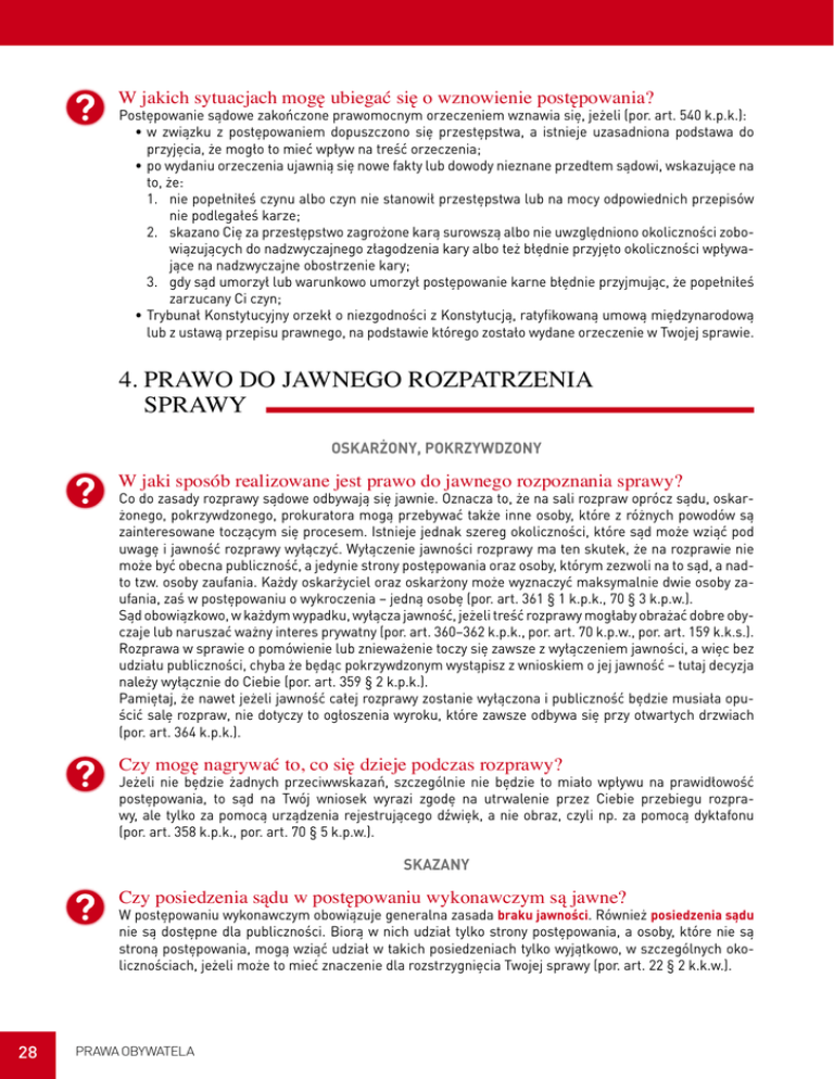 W jakich sytuacjach mogę ubiegać się o wznowienie postępowania? Postępowanie sądowe zakończone prawomocnym orzeczeniem wznawia się, jeżeli (por. art. 540 k.p.k.): •w związku z postępowaniem dopuszczono się przestępstwa, a istnieje uzasadniona podstawa do przyjęcia, że mogło to mieć wpływ na treść orzeczenia; •po wydaniu orzeczenia ujawnią się nowe fakty lub dowody nieznane przedtem sądowi, wskazujące na to, że: 1.nie popełniłeś czynu albo czyn nie stanowił przestępstwa lub na mocy odpowiednich przepisów nie podlegałeś karze; 2.skazano Cię za przestępstwo zagrożone karą surowszą albo nie uwzględniono okoliczności zobowiązujących do nadzwyczajnego złagodzenia kary albo też błędnie przyjęto okoliczności wpływające na nadzwyczajne obostrzenie kary; 3.gdy sąd umorzył lub warunkowo umorzył postępowanie karne błędnie przyjmując, że popełniłeś zarzucany Ci czyn; •Trybunał Konstytucyjny orzekł o niezgodności z Konstytucją, ratyfikowaną umową międzynarodową lub z ustawą przepisu prawnego, na podstawie którego zostało wydane orzeczenie w Twojej sprawie. 4. PRAWO DO JAWNEGO ROZPATRZENIA SPRAWY OSKARŻONY, POKRZYWDZONY W jaki sposób realizowane jest prawo do jawnego rozpoznania sprawy? Co do zasady rozprawy sądowe odbywają się jawnie. Oznacza to, że na sali rozpraw oprócz sądu, oskarżonego, pokrzywdzonego, prokuratora mogą przebywać także inne osoby, które z różnych powodów są zainteresowane toczącym się procesem. Istnieje jednak szereg okoliczności, które sąd może wziąć pod uwagę i jawność rozprawy wyłączyć. Wyłączenie jawności rozprawy ma ten skutek, że na rozprawie nie może być obecna publiczność, a jedynie strony postępowania oraz osoby, którym zezwoli na to sąd, a nadto tzw. osoby zaufania. Każdy oskarżyciel oraz oskarżony może wyznaczyć maksymalnie dwie osoby zaufania, zaś w postępowaniu o wykroczenia – jedną osobę (por. art. 361 § 1 k.p.k., 70 § 3 k.p.w.). Sąd obowiązkowo, w każdym wypadku, wyłącza jawność, jeżeli treść rozprawy mogłaby obrażać dobre obyczaje lub naruszać ważny interes prywatny (por. art. 360–362 k.p.k., por. art. 70 k.p.w., por. art. 159 k.k.s.). Rozprawa w sprawie o pomówienie lub znieważenie toczy się zawsze z wyłączeniem jawności, a więc bez udziału publiczności, chyba że będąc pokrzywdzonym wystąpisz z wnioskiem o jej jawność – tutaj decyzja należy wyłącznie do Ciebie (por. art. 359 § 2 k.p.k.). Pamiętaj, że nawet jeżeli jawność całej rozprawy zostanie wyłączona i publiczność będzie musiała opuścić salę rozpraw, nie dotyczy to ogłoszenia wyroku, które zawsze odbywa się przy otwartych drzwiach (por. art. 364 k.p.k.). Czy mogę nagrywać to, co się dzieje podczas rozprawy? Jeżeli nie będzie żadnych przeciwwskazań, szczególnie nie będzie to miało wpływu na prawidłowość postępowania, to sąd na Twój wniosek wyrazi zgodę na utrwalenie przez Ciebie przebiegu rozprawy, ale tylko za pomocą urządzenia rejestrującego dźwięk, a nie obraz, czyli np. za pomocą dyktafonu (por. art. 358 k.p.k., por. art. 70 § 5 k.p.w.). SKAZANY Czy posiedzenia sądu w postępowaniu wykonawczym są jawne? W postępowaniu wykonawczym obowiązuje generalna zasada braku jawności. Również posiedzenia sądu nie są dostępne dla publiczności. Biorą w nich udział tylko strony postępowania, a osoby, które nie są stroną postępowania, mogą wziąć udział w takich posiedzeniach tylko wyjątkowo, w szczególnych okolicznościach, jeżeli może to mieć znaczenie dla rozstrzygnięcia Twojej sprawy (por. art. 22 § 2 k.k.w.). 28 PRAWA OBYWATELA