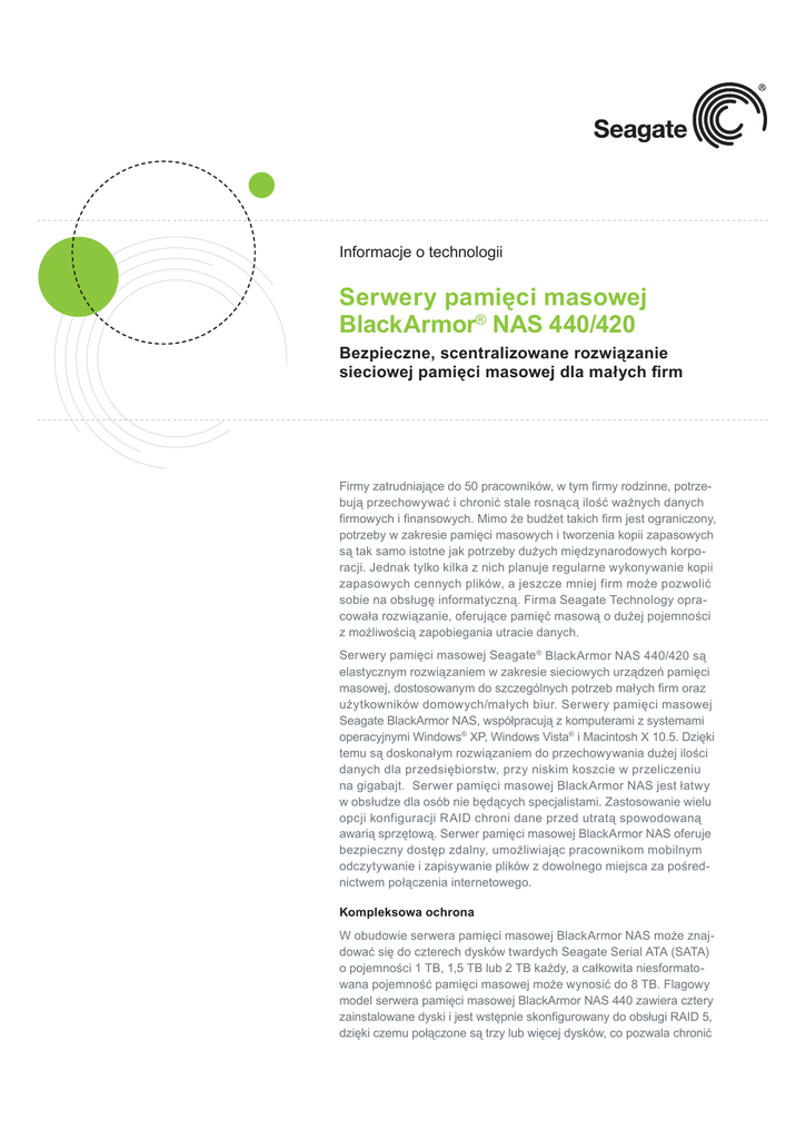 Informacje o technologii Serwery pamięci masowej BlackArmor® NAS 440/420 Bezpieczne, scentralizowane rozwiązanie sieciowej pamięci masowej dla małych firm Firmy zatrudniające do 50 pracowników, w tym firmy rodzinne, potrzebują przechowywać i chronić stale rosnącą ilość ważnych danych firmowych i finansowych. Mimo że budżet takich firm jest ograniczony, potrzeby w zakresie pamięci masowych i tworzenia kopii zapasowych są tak samo istotne jak potrzeby dużych międzynarodowych korporacji. Jednak tylko kilka z nich planuje regularne wykonywanie kopii zapasowych cennych plików, a jeszcze mniej firm może pozwolić sobie na obsługę informatyczną. Firma Seagate Technology opracowała rozwiązanie, oferujące pamięć masową o dużej pojemności z możliwością zapobiegania utracie danych. Serwery pamięci masowej Seagate ® BlackArmor NAS 440/420 są elastycznym rozwiązaniem w zakresie sieciowych urządzeń pamięci masowej, dostosowanym do szczególnych potrzeb małych firm oraz użytkowników domowych/małych biur. Serwery pamięci masowej Seagate BlackArmor NAS, współpracują z komputerami z systemami operacyjnymi Windows® XP, Windows Vista® i Macintosh X 10.5. Dzięki temu są doskonałym rozwiązaniem do przechowywania dużej ilości danych dla przedsiębiorstw, przy niskim koszcie w przeliczeniu na gigabajt. Serwer pamięci masowej BlackArmor NAS jest łatwy w obsłudze dla osób nie będących specjalistami. Zastosowanie wielu opcji konfiguracji RAID chroni dane przed utratą spowodowaną awarią sprzętową. Serwer pamięci masowej BlackArmor NAS oferuje bezpieczny dostęp zdalny, umożliwiając pracownikom mobilnym odczytywanie i zapisywanie plików z dowolnego miejsca za pośrednictwem połączenia internetowego. Kompleksowa ochrona W obudowie serwera pamięci masowej BlackArmor NAS może znajdować się do czterech dysków twardych Seagate Serial ATA (SATA) o pojemności 1 TB, 1,5 TB lub 2 TB każdy, a całkowita niesformatowana pojemność pamięci masowej może wynosić do 8 TB. Flagowy model serwera pamięci masowej BlackArmor NAS 440 zawiera cztery zainstalowane dyski i jest wstępnie skonfigurowany do obsługi RAID 5, dzięki czemu połączone są trzy lub więcej dysków, co pozwala chronić Serwery pamięci masowej BlackArmor® NAS 440/420 Bezpieczne, scentralizowane rozwiązanie sieciowej pamięci masowej dla małych firm wszystkie przechowywane dane w przypadku utraty jednego z nich. W modelu BlackArmor NAS 420 fabrycznie montowane są dwa dyski zainstalowane w konfiguracji RAID 1 (zwanej techniką dysków lustrzanych). Wszystkie dane są przechowywane na każdym z dysków, aby zapewnić ochronę danych w przypadku awarii jednego z nich. Jeśli będzie potrzebna większa ilość miejsca, w łatwy sposób można rozbudować model BlackArmor NAS 420 o jeden lub dwa dodatkowe dyski.1 Serwery pamięci masowej BlackArmor NAS obsługują tworzenie do czterech woluminów logicznych, z których każdy może mieć inny rozmiar i może być skonfigurowany na innym poziomie infrastruktury RAID. Pozwala to na przechowywanie danych oddzielnie i umożliwia wybór najlepszego poziomu ochrony RAID pod względem typu danych w każdym woluminie. Macierz RAID 10, zapewniająca najwyższy poziom ochrony, jest najbardziej odpowiednia dla oddzielnych woluminów, w których przechowywane są ważne firmowe dokumenty i pliki księgowe oraz kopie zapasowe komputerów pracowników. Pliki wymagające ochrony z zachowaniem szybkości odczytu/zapisu, takie jak transakcyjne bazy danych, mogą być przechowywane w innym woluminie w macierzy RAID 1. Dla plików wymagających szybkiego przesyłania danych, takich jak pobrane filmy i inne media strumieniowe, wolumin może być skonfigurowany jako macierz RAID 0. Taka konfi guracja gwarantuje największą prędkość, ale nie zapewnia ochrony danych. Serwer pamięci masowej Seagate BlackArmor NAS umożliwia jednoczesne przechowywanie różnych danych, korzystając z różnych macierzy, oraz łatwą konfigurację poprzez interfejs administracyjny oparty na przeglądarce. Elastyczność serwera pamięci masowej BlackArmor NAS daje możliwość jednoczesnego przeprowadzania różnych operacji na przechowywanych danych. Dwa kluczowe zastosowania to centralne przechowywanie danych i ich udostępnianie oraz możliwość wykonania kopii zapasowych plików z nawet 50 komputerów w sieci za pomocą dołączonego oprogramowania Seagate BlackArmor Backup. 2 Dodatkowe funkcje to przesyłanie strumieniowe multimediów i replikacja zawartości urządzenia do drugiego serwera pamięci masowej BlackArmor NAS poprzez bezpośrednie połączenie 2 bez korzystania z sieci oraz pełna obsługa usługi Microsoft Active Directory. Cztery wbudowane porty USB pozwalają na odczytywanie i zapisywanie na dysku twardym USB lub dyskach typu flash, dostarczanie zasilania przez zasilacz UPS i współdzielenie drukarki USB. Bezpieczny dostęp do plików na serwerze pamięci masowej BlackArmor NAS można uzyskać z dowolnego miejsca na świecie za pomocą bezpłatnej usługi Seagate Global Access™ i funkcji serwera FTP. Autoryzacją korzystania z tych punktów dostępu zarządza główny administrator. Stała niezawodność Serwer pamięci masowej BlackArmor NAS został zaprojektowany tak, aby zapewnić niezawodne, stałe działanie. Dwa do czterech dysków wewnętrznych firmy Seagate można szybko wymienić w trakcie pracy bez konieczności wyłączania serwera. Rezultatem jest zminimalizowanie czasu przestoju w rzadkich przypadkach awarii dysku. Można skonfi gurować podwójne porty Ethernet tak, aby po podłą czeniu do sieci zapewniały możliwość pracy innego dysku w przypadku awarii. Kluczowym zagadnieniem dotyczącym systemu pamięci masowej jest rozpraszanie ciepła. Mimo niskiego poziomu tarcia, dyski twarde generują ciepło w trakcie obracania talerzy z dużą prędkością. Wysoka temperatura stanowi zagrożenie dla obwodów elektronicznych. In