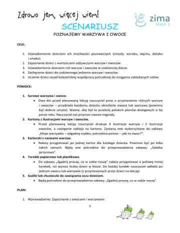 SCENARIUSZ POZNAJEMY WARZYWA I OWOCE CELE: 1. Uświadomienie dzieciom ich możliwości poznawczych (zmysły: wzroku, węchu, dotyku i smaku). 2. Zapoznanie dzieci z wartościami odżywczymi warzyw i owoców. 3. Uświadomienie dzieciom roli warzyw i owoców w codziennej diecie. 4. Zachęcenie dzieci do codziennego jedzenia warzyw i owoców. 5. Uczenie dzieci zasad koleżeńskiej współpracy potrzebnej do osiągania zakładanych celów. POMOCE: 1. Surowe warzywa i owoce. Dwa dni przed planowaną lekcją nauczyciel prosi o przyniesienie różnych warzyw i owoców – przydziela każdemu dziecku określone owoce lub warzywa (powinny być dobrze umyte). Ważne, aby był to przekrój polskich plonów dostępnych o tej porze roku. Nauczyciel zaś przynosi owoce-nagrody. 2. Kartony z ilustracjami warzyw i owoców. Przed planowaną lekcją nauczyciel drukuje 4 ilustracje warzyw i 2 ilustracje owoców, a następnie nakleja na kartony. Zostaną one wykorzystane do zabawy „Moje warzywko – odgadnę szybko, potrzebna pomoc – jaki to owoc?”. 3. Karteczki z nazwami warzyw. Należy przygotować po jednej kartce dla każdego dziecka. Powinno być po kilka takich samych. Będą one potrzebne do przeprowadzenia zabawy: „Sałatka jarzynowa”. 4. Torebki papierowe lub plastikowe. Do zabawy „Zgadnij proszę, co w sobie noszę” należy przygotować o połowę mniej torebek, niż wynosi liczba dzieci w klasie. Do każdej torebki nauczyciel wkłada po jednym owocu lub warzywie (z przyniesionych przez dzieci na lekcję). 5. Szaliki lub chusteczki do zawiązania oczu dzieciom. Będą potrzebne do przeprowadzenia zabawy „Zgadnij proszę, co w sobie noszę”. PLAN: 1. Wprowadzenie: Zapoznanie z owocami i warzywami 1 2. 3. 4. 5. 6. 7. Zabawa „Moje warzywko – odgadnę szybko, potrzebna pomoc – jaki to owoc?”. Burza mózgów: Dlaczego dzieci powinny jeść warzywa i owoce? Zabawa edukacyjna „Zagadki o warzywach”. Sztafeta: „Zgadnij proszę, co w sobie noszę”. Zabawa ruchowa „Sałatka jarzynowa”. Podsumowanie zajęć: rozmowa na temat wiadomości zdobytych przez dzieci w czasie lekcji oraz możliwości wykorzystania ich w życiu codziennym. PRZEBIEG ZAJĘĆ: 1. Wprowadzenie: Zapoznanie z owocami i warzywami. Dzieci oglądają przyniesione warzywa i owoce, wąchają, próbują tych, które można jeść na surowo. 2. Zabawa „Moje warzywko – odgadnę szybko, potrzebna pomoc – jaki to owoc?” Spośród przygotowanych kartonów nauczyciel wybiera 2 z owocami i 4 z warzywami, a następnie losuje sześcioro dzieci. Pierwsze dziecko wychodzi na środek klasy i staje tyłem do tablicy. Na tablicy nauczyciel umieszcza karton w ten sposób, aby dziecko nie widziało, jakie warzywo lub jaki owoc jest tam narysowany. Dziecko ma za zadanie odgadnąć, co przedstawia rysunek, zadając pozostałym dzieciom pytania, na które one odpowiadają „tak” lub „nie”. W zgadywankę po kolei gra pozostała piątka dzieci. Wygrywa to, które zgadło najszybciej. Zwycięzca dostaje owoc. 3. Burza mózgów: Dlaczego dzieci powinny jeść warzywa i owoce? Nauczyciel zapisuje na tablicy odpowiedzi, a później je odczytuje: zdrowe, mają dużo witamin, smaczne, można zastąpić nimi słodycze, itp. Nauczyciel podsumowuje wszystkie odpowiedzi, a następnie podaje dodatkowe wiadomości na temat wartości odżywczych owoców i warzyw. Jakie owoce i warzywa dzieci lubią najbardziej? 4. Zabawa edukacyjna: „Zagadki o warzywach”. Nauczyciel czyta wierszyki-zagadki, dzieci odgadują. Nauczyciel prosi dzieci o wypowiedzi na temat prezentowanych warzyw, a następnie uzupełnia wypowiedzi uczniów. 2 Chrupie ją zajączek, Schrupie ją i Ewka, Bo smaczna i zdrowa Jest właśnie ……… (marchewka). Pęk zielonych włosów, Długa biała nóżka, Mama wkłada ją do zupy, A to jest…………. (pietruszka). Powiem ci zagadkę, Albo wierszyk może, Ma być o selerze, rzodkiewce czy ……. (porze)? Zielone ma liście, W środku głowa pusta, Czy to jest sałata? Czy może ……….. (kapusta)? Lecz zamiast zgadywać, Chyba ruszę głową, Zjem jedną i drugą Sobie na surowo. Kroiła ją mama, A płakała Ula, Chociaż szczypie cię w oczy, Zdrowa jest ………. (cebula). Czy chcesz być silny? Odpowiesz, że tak. Oto jedzie na talerzu Czerwony Pan……... (Burak). Niektóre nasionka Białko maja zdrowe. Jak się nazywają? Chyba wiem,……….. (strączkowe)! 3 5. Sztafeta: „Zgadnij proszę, co w sobie noszę”. Przed rozpoczęciem zabawy należy przygotować metę (stolik) dla każdego zespołu i ułożyć tam torebki z warzywami/owocami. Do przeprowadzenia sztafety bardzo wskazane byłoby poproszenie o pomoc jednej osoby dorosłej. Dzieci dobierają się w pary i nauczyciel dzieli wszystkich na dwa zespoły. Jedna osoba z pary ma mieć zawiązane oczy, druga – będzie odgrywała rolę przewodnika do mety. Na mecie dziecko z zawiązanymi oczami sięga do torby, wyjmuje owoc/warzywo i odgaduje jego nazwę – dotykając, wąchając, a jeśli trzeba – próbując. Za każdą poprawną odpowiedź przyznawany jest 1 punkt. Zespół, który szybciej ukończy sztafetę, otrzymuje dodatkowo 5 punktów. Wygrywa ten zespół, który zgromadził najwięcej punktów. 6. Zabawa ruchowa: „Sałatka jarzynowa”. Dzieci siedzą w kole na krzesłach. Nauczyciel rozdaje uczniom karteczki z rysunkami warzyw i owoców – po kilka takich samych, na przykład 5 buraków, 5 marchewek itd. Zabawę rozpoczyna nauczyciel, który wywołuje wybrane warzywo, np. pietruszki. Dzieci, które mają taki kartonik szybko zamieniają się miejscami. W tym samym czasie nauczyciel zabiera jedno krzesło. Uczeń, który nie zdąży zająć krzesła zostaje na środku i wywołuje kolejne warzywo. Na hasło „sałatka jarzynowa” wszystkie dzieci wstają z miejsca i biorąc się za ręce robią koło. 7. Podsumowanie zajęć: rozmowa na temat wiadomości zdobytych przez dzieci w czasie lekcji oraz możliwości wykorzystania