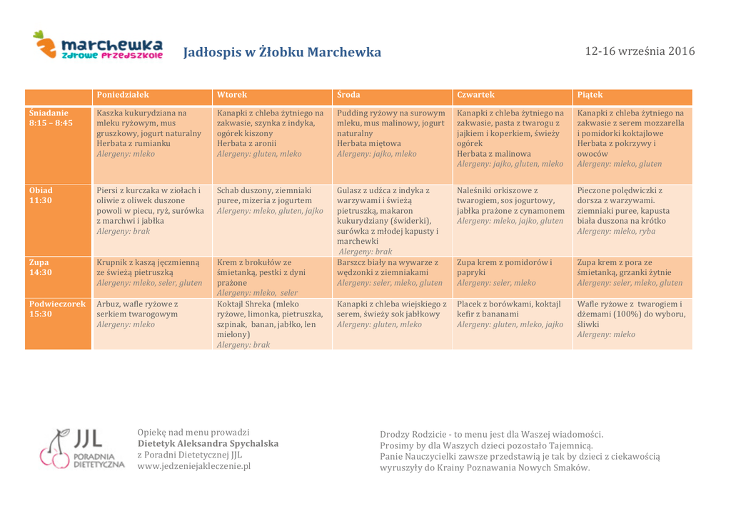 12-16września2016 JadłospiswŻłobkuMarchewka Poniedziałek Wtorek Środa Czwartek Piątek Śniadanie 8:15–8:45 Kaszkakukurydzianana mlekuryżowym,mus gruszkowy,jogurtnaturalny Herbatazrumianku Alergeny:mleko Kanapkizchlebażytniegona zakwasie,szynkazindyka, ogórekkiszony Herbatazaronii Alergeny:gluten,mleko Puddingryżowynasurowym mleku,musmalinowy,jogurt naturalny Herbatamiętowa Alergeny:jajko,mleko Kanapkizchlebażytniegona zakwasie,pastaztwaroguz jajkiemikoperkiem,świeży ogórek Herbatazmalinowa Alergeny:jajko,gluten,mleko Kanapkizchlebażytniegona zakwasiezseremmozzarella ipomidorkikoktajlowe Herbatazpokrzywyi owoców Alergeny:mleko,gluten Obiad 11:30 Piersizkurczakawziołachi oliwiezoliwekduszone powoliwpiecu,ryż,surówka zmarchwiijabłka Alergeny:brak Schabduszony,ziemniaki puree,mizeriazjogurtem Alergeny:mleko,gluten,jajko Naleśnikiorkiszowez twarogiem,sosjogurtowy, jabłkaprażonezcynamonem Alergeny:mleko,jajko,gluten Pieczonepolędwiczkiz dorszazwarzywami. ziemniakipuree,kapusta białaduszonanakrótko Alergeny:mleko,ryba Zupa 14:30 Krupnikzkasząjęczmienną ześwieżąpietruszką Alergeny:mleko,seler,gluten Arbuz,wafleryżowez serkiemtwarogowym Alergeny:mleko Kremzbrokułówze śmietanką,pestkizdyni prażone Alergeny:mleko,seler KoktajlShreka(mleko ryżowe,limonka,pietruszka, szpinak,banan,jabłko,len mielony) Alergeny:brak Gulaszzudźcazindykaz warzywamiiświeżą pietruszką,makaron kukurydziany(świderki), surówkazmłodejkapustyi marchewki Alergeny:brak Barszczbiałynawywarzez wędzonkizziemniakami Alergeny:seler,mleko,gluten Zupakremzpomidorówi papryki Alergeny:seler,mleko Zupakremzporaze śmietanką,grzankiżytnie Alergeny:seler,mleko,gluten Wafleryżoweztwarogiemi dżemami(100%)dowyboru, śliwki Alergeny:mleko Podwieczorek 15:30 Kanapkizchlebawiejskiegoz Placekzborówkami,koktajl serem,świeżysokjabłkowy kefirzbananami Alergeny:gluten,mleko Alergeny:gluten,mleko,jajko Opiekęnadmenuprowadzi DietetykAleksandraSpychalska zPoradniDietetycznejJJL www.jedzeniejakleczenie.pl DrodzyRodzicie-tomenujestdlaWaszejwiadomości. ProsimybydlaWaszychdziecipozostałoTajemnicą. PanieNauczycielkizawszeprzedstawiąjetakbydziecizciekawością wyruszyłydoKrainyPoznawaniaNowychSmaków.