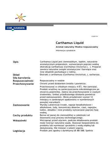 KMB0709 Carthamus Liquid Aromat naturalny Wodno-rozpuszczalny Informacja o produkcie Opis Skład Siła barwienia Rozpuszczalność Przechowywanie Zastosowanie Cechy produktu Wskazówki Legislacja Carthamus Liquid jest ciemnożółtym, lepkim, naturalnie aromatycznym preparatem, wytwarzanym poprzez wodną ekstrakcję carthamusa (Carthamus tinctorius L. ). Preparat zawiera naturalne związki aromatyczne i barwiące oraz inne składniki pochodzące z rośliny. Ekstrakt z carthamusa (Carthamus tinctoriusL.), sacharoza. Rozpuszczalny w wodzie Chronić przed działaniem światła i powietrza. o Przechowywać w chłodnym miejscu 4-8 C. Nie zamrażać. Produkt wrażliwy na zanieczyszczenia mikrobiologiczne po otwarciu pojemnika. Zaleca się przechowywanie w czystym środowisku. Unikać przedłużonego działania powietrza przed zastosowaniem. Okres przydatności wynosi 12 miesięcy w zamkniętym opakowaniu w wymienionych powyżej warunkach. Wyroby cukiernicze trwałe, napoje bezalkoholowe i alkoholowe, lody, koncentraty deserów, ciast, napojów, lodów, obiadów i inne produkty wytwarzane poprzez fazę wodną. Barwa od jasnej do ciemnożółtej w zależności od dozowania oraz procesu technologicznego. Wstrząsnąć przed użyciem, podczas składowania produkt może tworzyć naturalne osady. Dozować bezpośrednio do produktu lub wymieszać uprzednio z wodą miękką lub destylowaną. Nie mieszać z solami wapnia. Produkt jest zgodny z dyrektywą UE 88/388. Spełnia Stabilność w produkcie Opakowanie przepisy ustawy o bezpieczeństwie żywności i żywienia (Dz.U. nr 171 z 27.09.2006). Odporność na światło (słaba-dobra-bardzo dobra) Bardzo dobra Odporność na temperaturę (słaba-dobra-bardzo dobra) Dobra . 25 kg 699230 Chr. Hansen Poland Sp. z o.o. 05-152 Czosnów, Cząstków Maz. ul Gdańska 4. tel +48 22 7850205 2