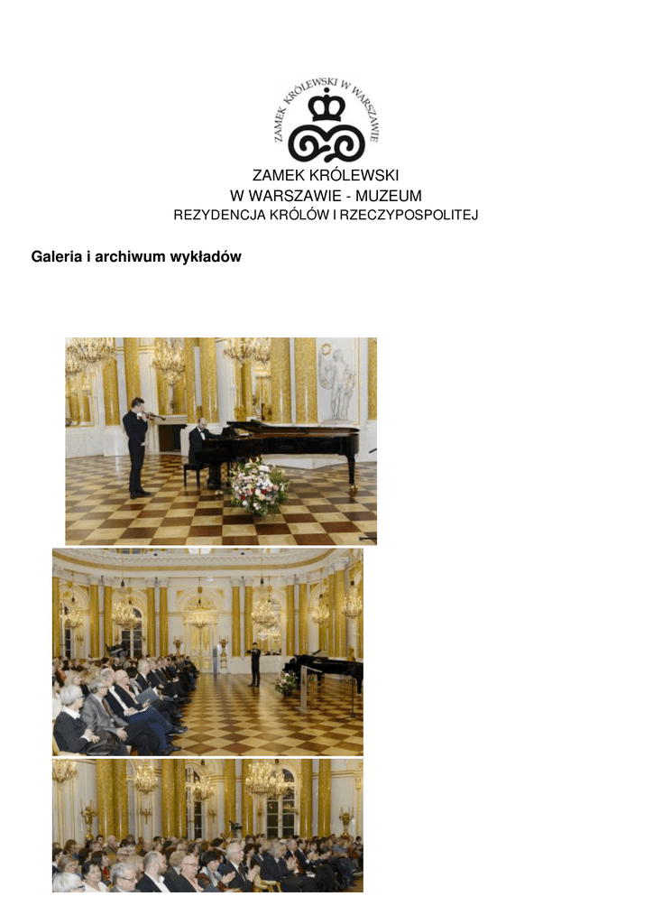 ZAMEK KRÓLEWSKI W WARSZAWIE - MUZEUM REZYDENCJA KRÓLÓW I RZECZYPOSPOLITEJ Galeria i archiwum wykładów Galeria i archiwum wykładów: 19 marca 2015 r. – wykład inauguracyjny Ludwik Andegaweński: Ludwik Węgierski czy Ludwik Wielki? – wykład prof. Jacka Matuszewskiego w programie artystycznym wystąpili: Voytek Proniewicz (skrzypce) i Wojciech Waleczek (fortepian) Relacja internetowa 17 kwietnia 2015 r. – wykład Polacy w rewolucji węgierskiej 1848-1849 – wykład Istvána Kovácsa Relacja internetowa 7 maja 2015 r. – wykład Moja historia poezji węgierskiej – wykład prof. Jerzego Snopka Relacja internetowa 28 maja 2015 r. – debata Między „gulaszowym” a „bigosowym” komunizmem z udziałem prof. Tibora Valucha oraz 28 maja 2015 r. – debata Między „gulaszowym” a „bigosowym” komunizmem z udziałem prof. Tibora Valucha oraz prof. Jerzego Kochanowskiego, prowadzenie dr János Tischle 18 czerwca 2015 r. – Złota era węgierskiej piłki nożnej – wykład Stefana Szczepłk 9 lipca 2015 r. – W poszukiwaniu tożsamości: węgierska architektura 1900 – 2000 – wykład Dániela Kovácsa Relacja internetowa 23 lipca 2015 r. Projekcja filmu Adopcja (reż. Márta Mészáros, 1975, 84 min) Wprowadzenie: Janusz Wróblewski 10 września 2015 r. – Nasze miejsce: Europa Środkowa i/lub Wschodnia? – wykład prof. Ignácego Romsicsa 24 września 2015 r. – Węgierska opowieść o Warszawie ostatnich dni pokoju – wykład Jerzego S. Majewskiego oraz projekcja filmu Wszyscy do walca (reż. Viktor Bánky, 1939, 97 min.) 8 października 2015 r. – Polacy i Węgrzy w 1956 roku – wykład dr. Jánosa Tischlera Relacja internetowa 22 października 2015 r. – debata Gdzie jest granica? Węgry wobec europejskiego kryzysu imigracyjnego z udziałem Dominika Héjj oraz Andrzeja Sadeckiego prowadzenie Jakub Krupa 26 listopada 2015 r. – debata Trianon 1920 Nowy porządek w Europie z udziałem prof. Andrzeja Chwalby, prof. Paula Gradvohla oraz Miklósa Zeidlera, prowadzenie János Tischler Relacja internetowa 10 grudnia 2015 r. – Węgrzy i Polacy – wspólny kod z udziałem prof. Csaby G. Kissa Relacja internetowa 28 stycznia 2016 r. – Fenomen wojennego uchodźstwa polskiego na Węgrzech (1939–1946) z udziałem Grzegorza Łubczyka oraz projekcja filmu Życie na krawędzi. Henryk Sławik – József Antall senior (reż. Grzegorz Łubczyk, 2014, 68 min) Relacja internetowa 18 lutego 2016 – Między Brukselą a Moskwą. Współczesna polityka Węgier – debata z udziałem prof. Györgya Schöpflina i Igora Jankego 3 marca 2016 r. – Co czytamy? Przegląd literatury polskiej i węgierskiej – debata z udziałem dr hab. Lajosa Pálfalvi i Anny Góreckiej, prowadzenie dr Csilla Gizińska 17 marca 2016 r. – Nie tylko Budapeszt i Balaton. Węgry inaczej – wykład z udziałem Györga Ifju Relacja internetowa 7 kwietnia 2016 r. – Węgierska muzyka – od Liszta do Bartóka – recital fortepianowy i prelekcja z udziałem Ivett Gyöngyösi oraz dr hab. Józefy Katarzyny Dadak-Kozickiej 26 kwietnia 2016 r. - Losy mniejszości węgierskiej w krajach ościennych debata z udziałem dr László Brenzovica oraz Jarosława Gizińskiego Relacja internetowa 12 maja 2016 r. - Podróże po literaturze – debata z udziałem Tadeusza Olszańskiego , Krzysztofa Vargi oraz Gáspára Keresztesa Zamek Królewski w Warszawie - Muzeum. Rezydencja Królów i Rzeczypospolitej www.zamek-krolewski.pl